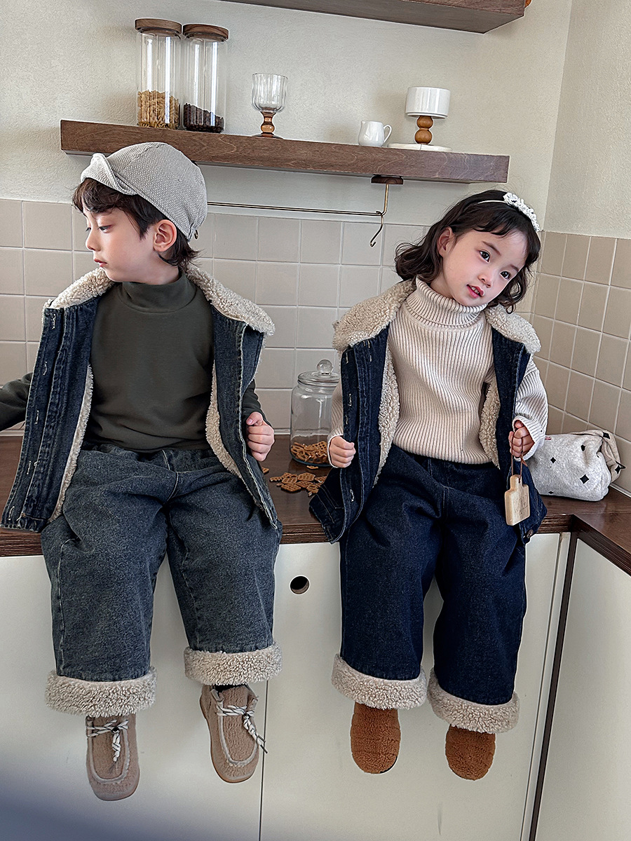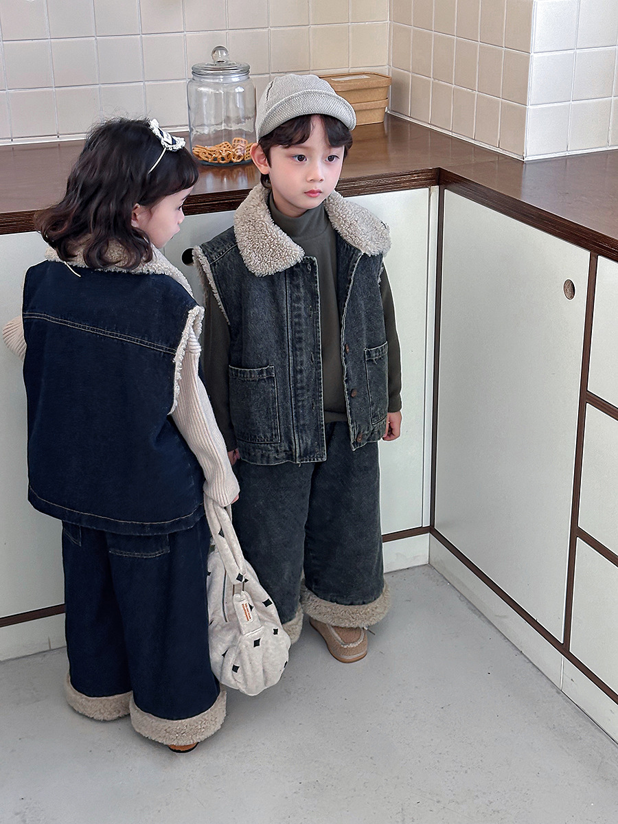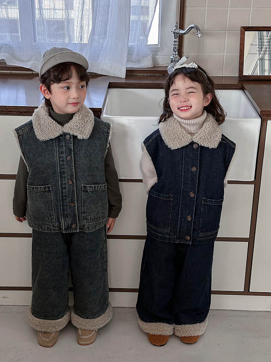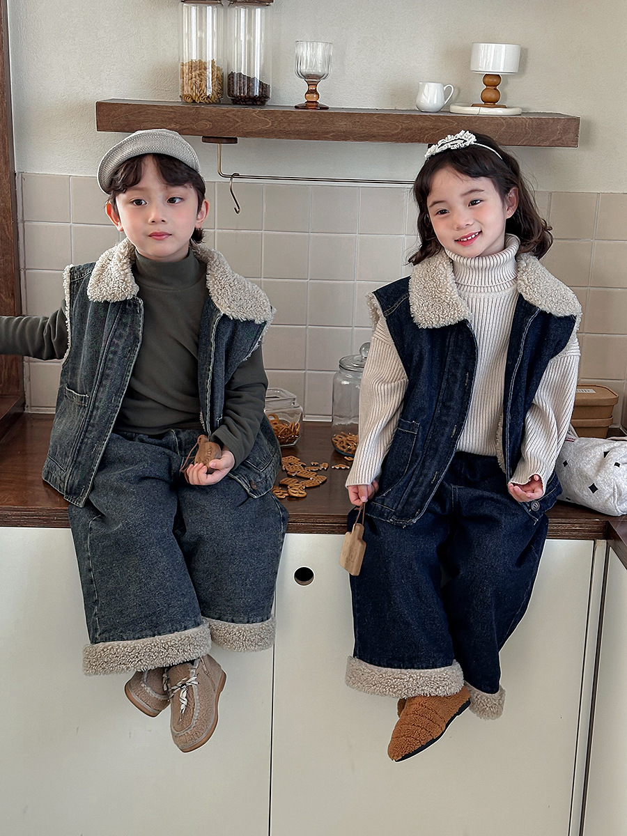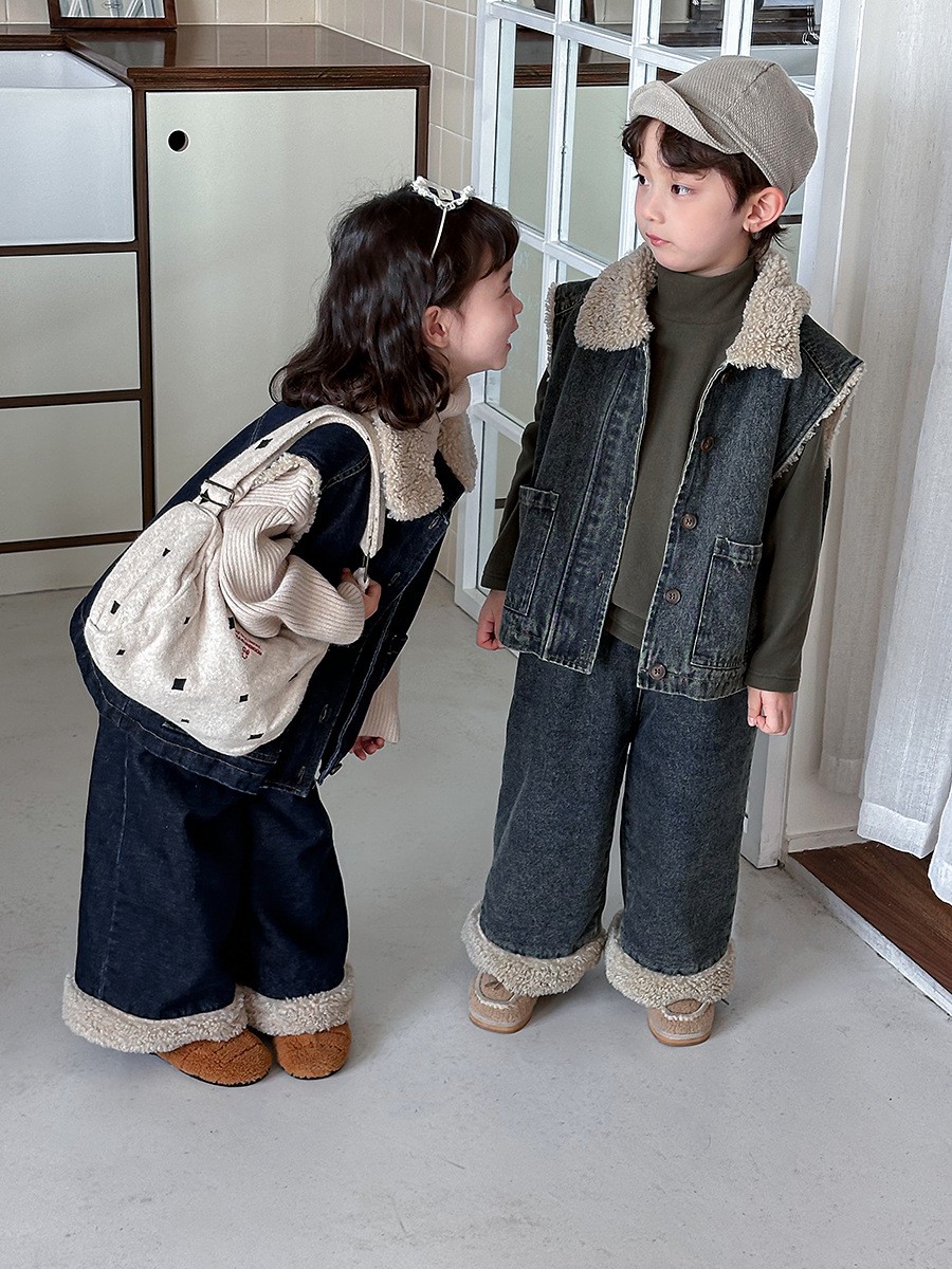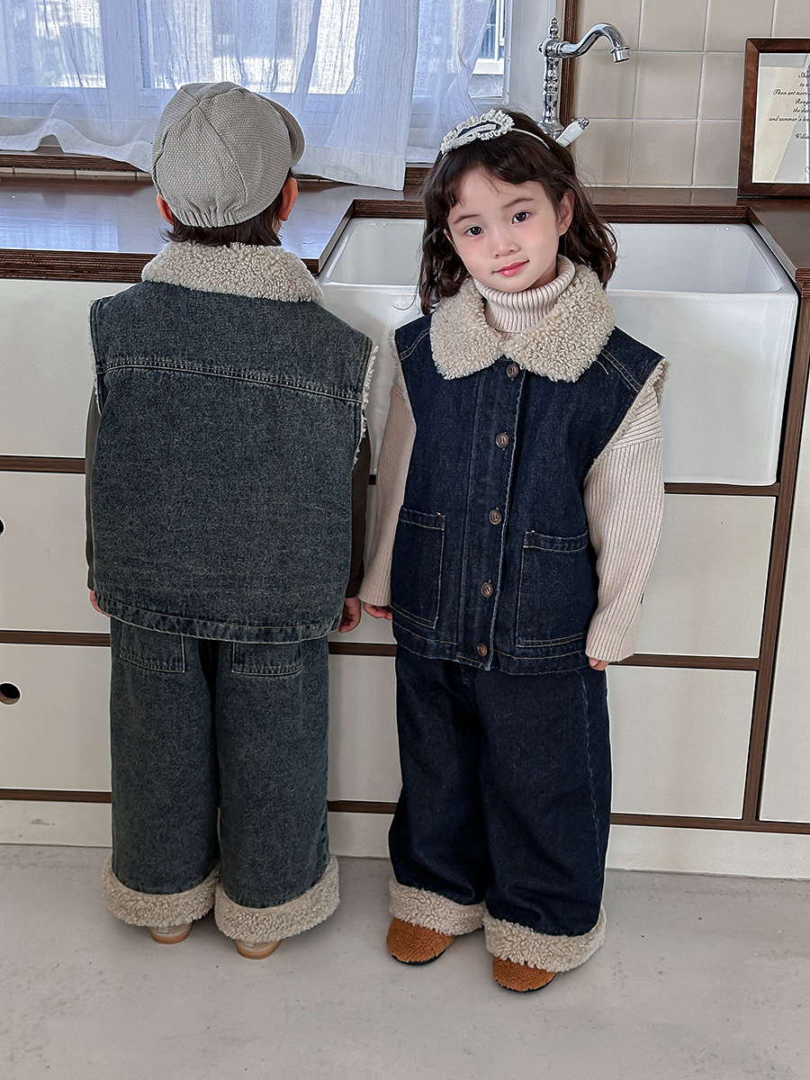 지아예 어린이 제품 2025 남아용 겨울 양털 데님 조끼 코트 중소형 어린이용 두꺼운 와이드 팬츠 투피스 세트스토어 가기