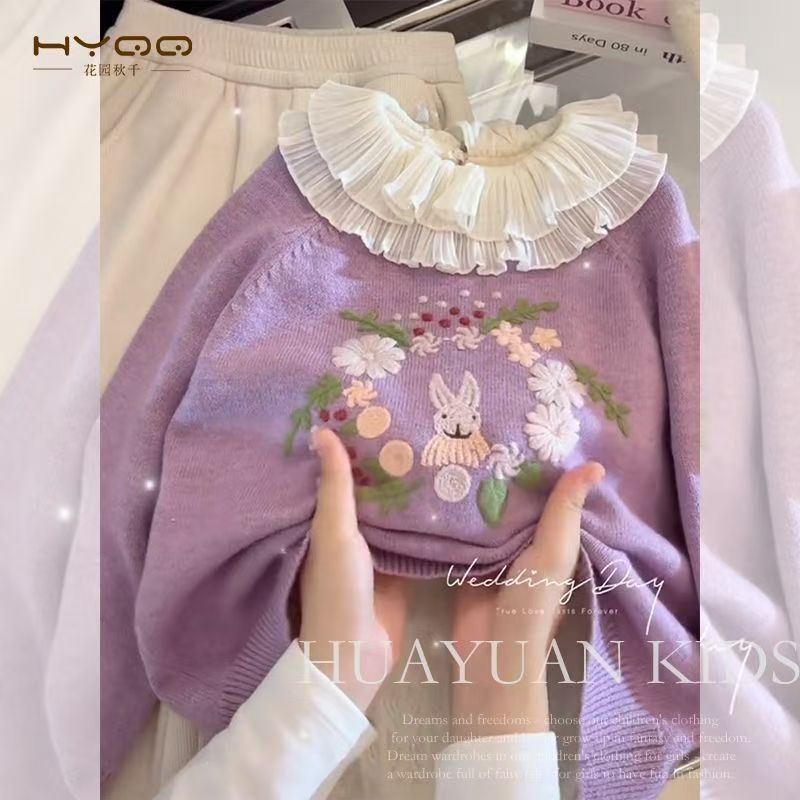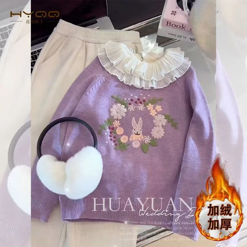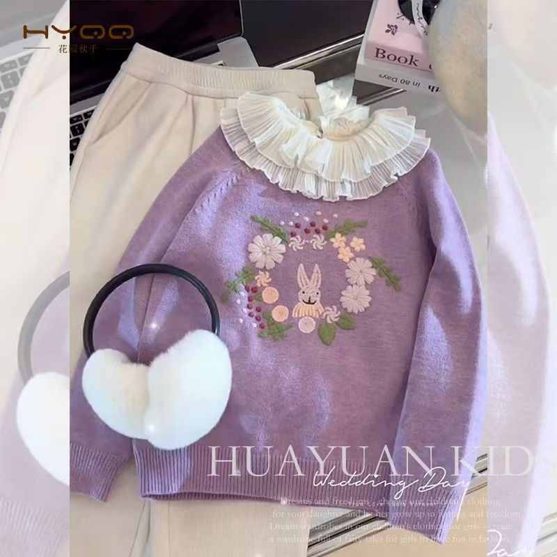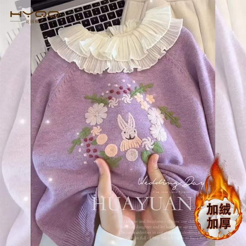 소녀의 스웨터 가을과 겨울 2024 새로운 보라색 어린이 니트 스웨터 소녀의 겨울 두꺼운 풀오버 스웨터 탑스토어 가기