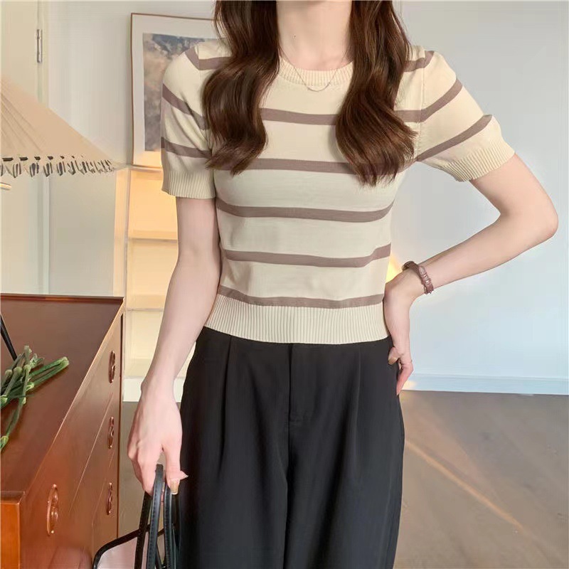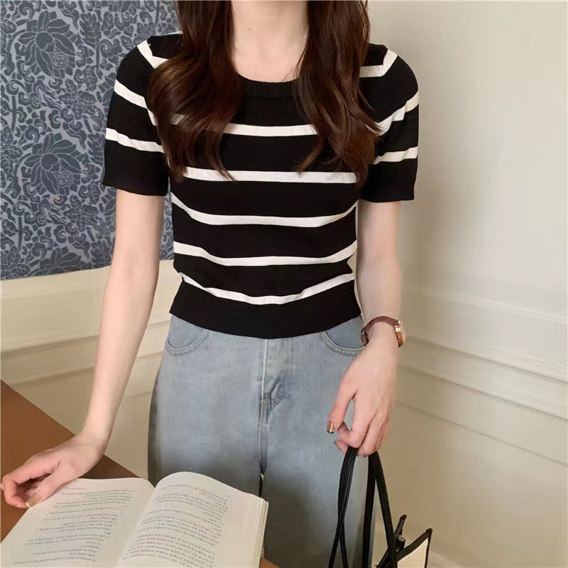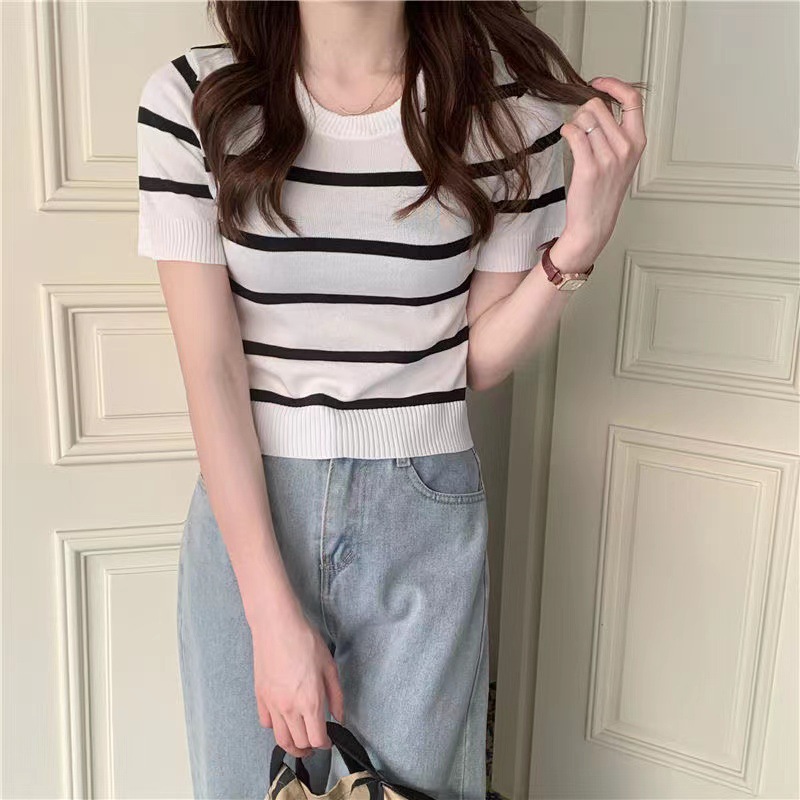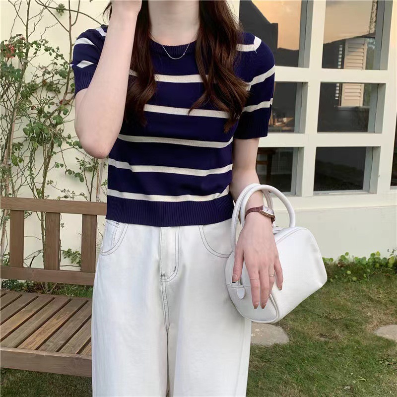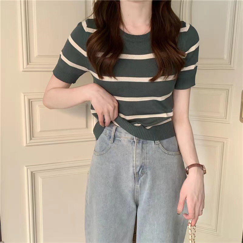 여름 한국식 줄무늬 스웨터 여자 반팔 새 라운드 넥 풀오버 슬리밍 짧은 귀여운 올매치 탑 여자 트렌디스토어 가기