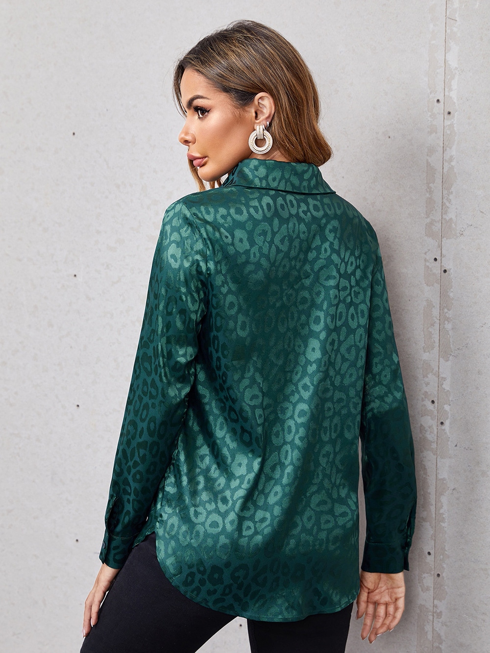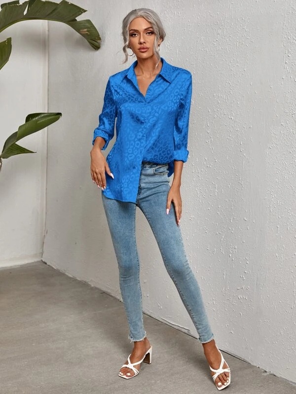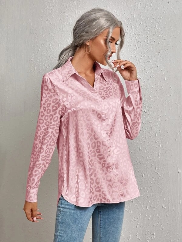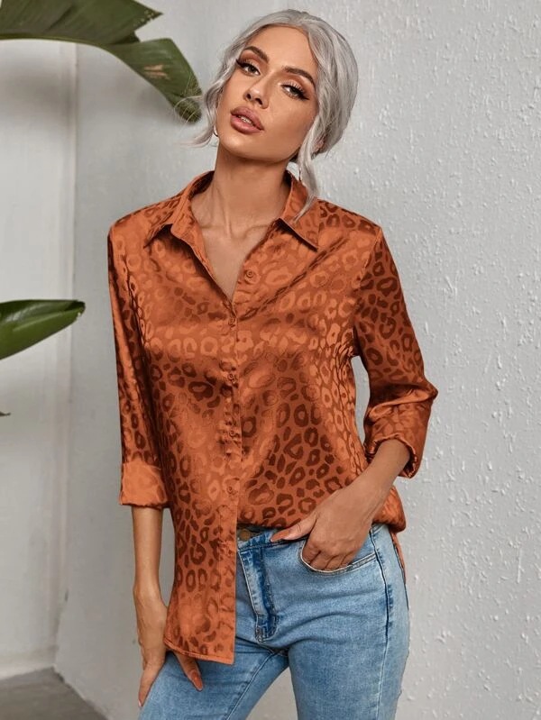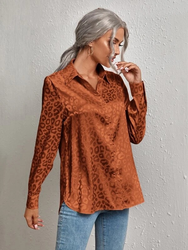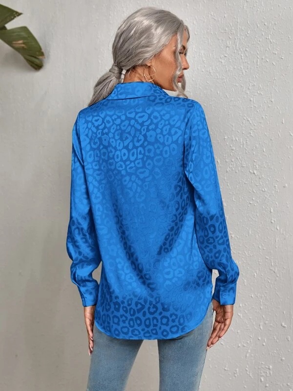 유럽 및 미국 스타일 여성복 2025 레이스업 레오파드 패턴 자카드 셔츠, 우아한 출근룩 긴팔 셔츠스토어 가기