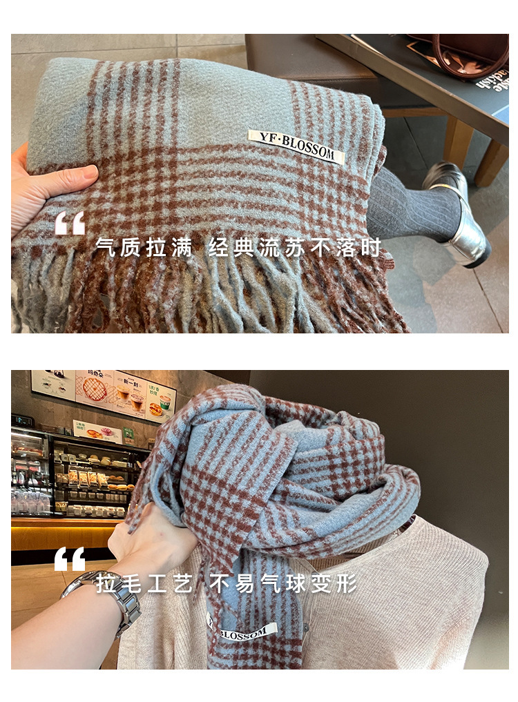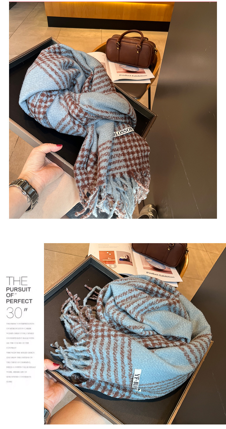 围巾女冬季韩版雾霾蓝格子条纹围巾保暖围脖2024新款英伦复古披肩
