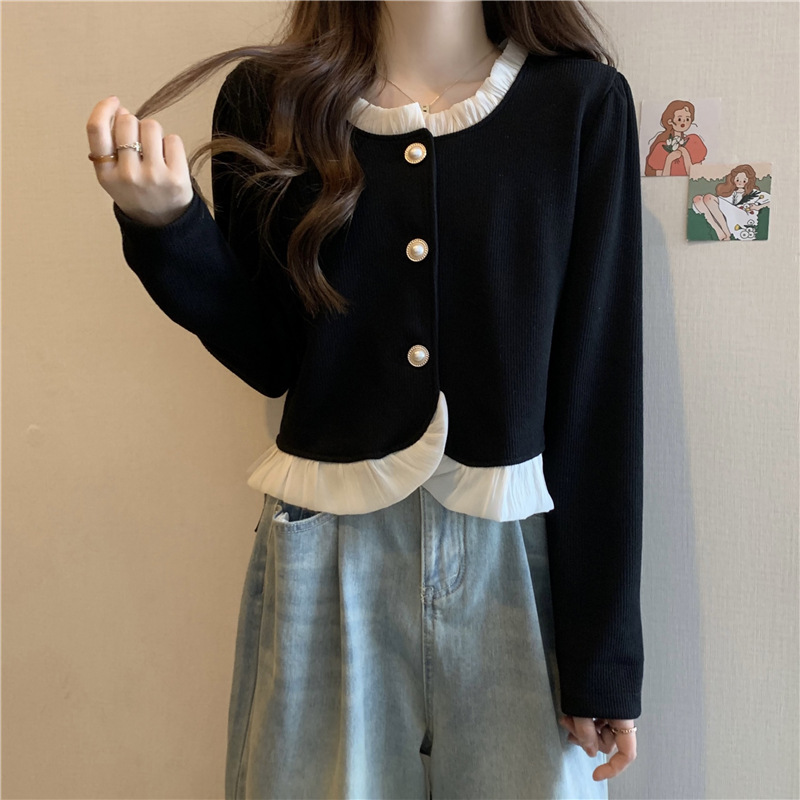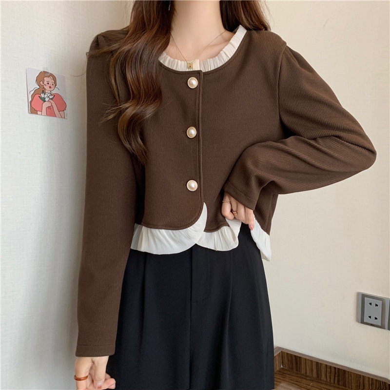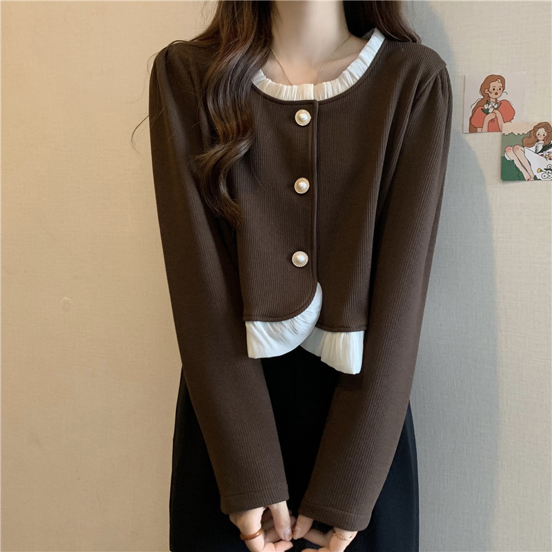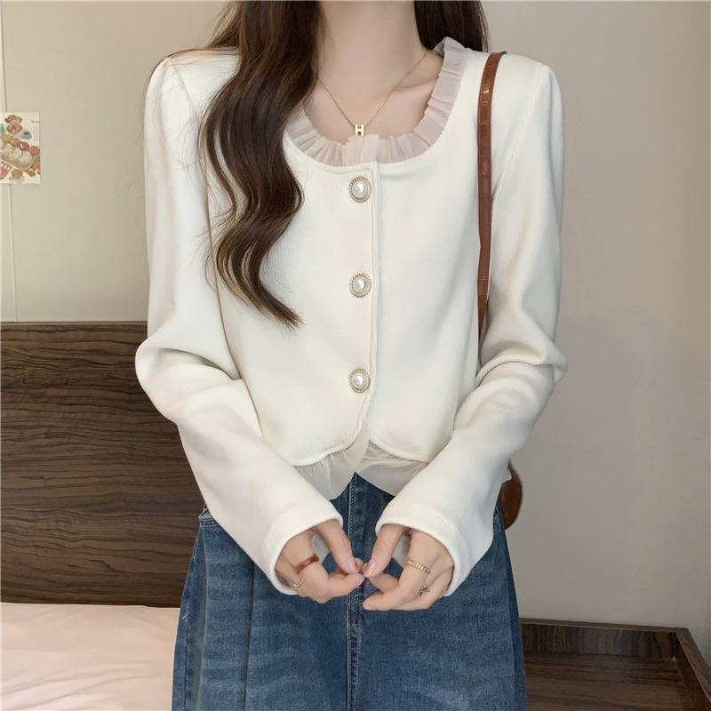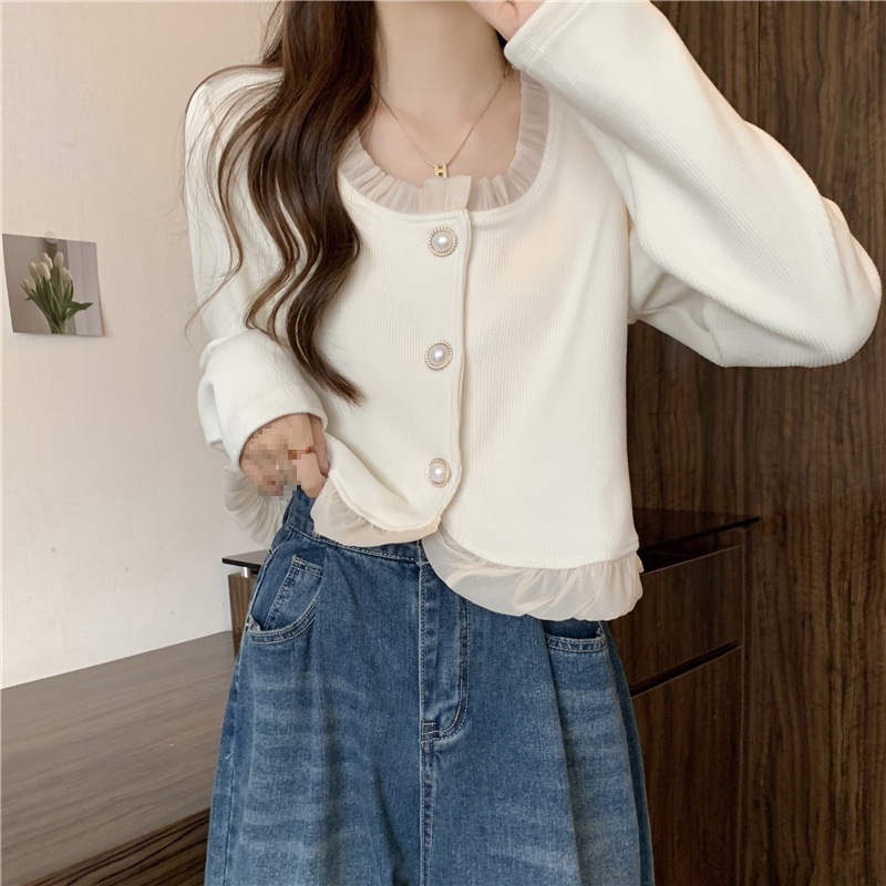플러스 사이즈 배꼽 덮은 레이스 바느질 긴소매베이스 셔츠 여성 가을 뚱뚱한 자매 슬리밍 올 매치 카디건 셔츠 탑