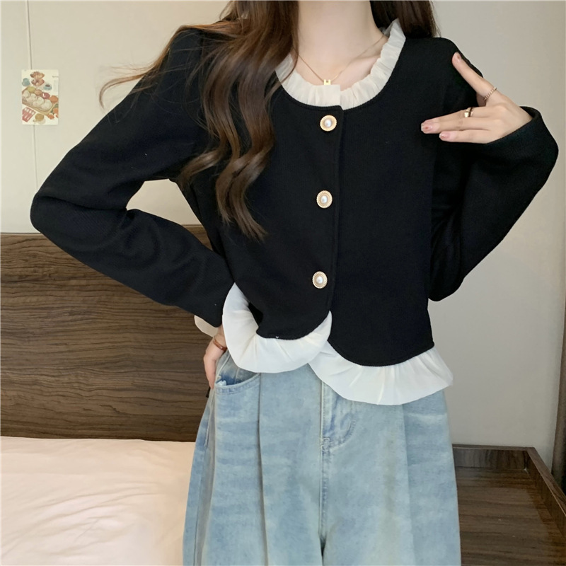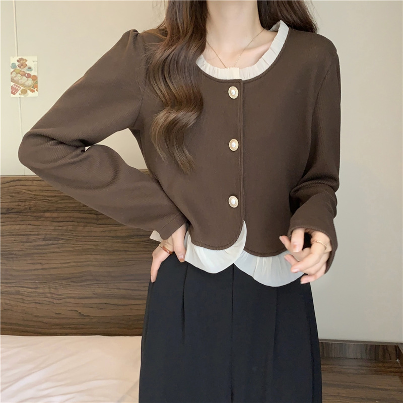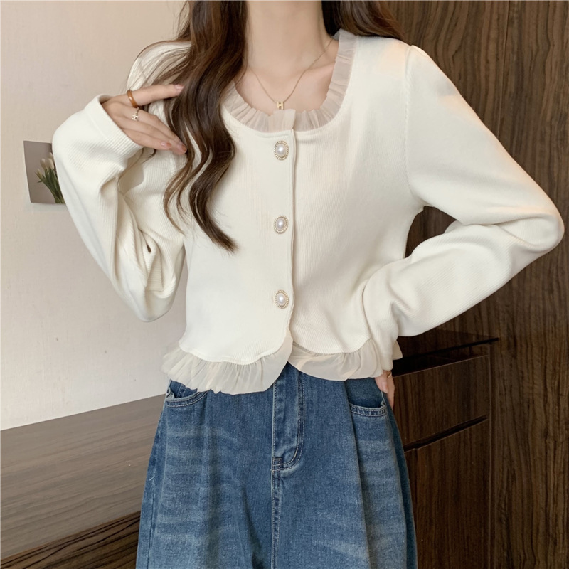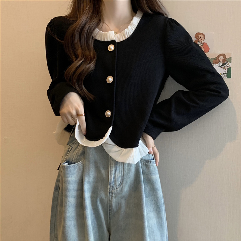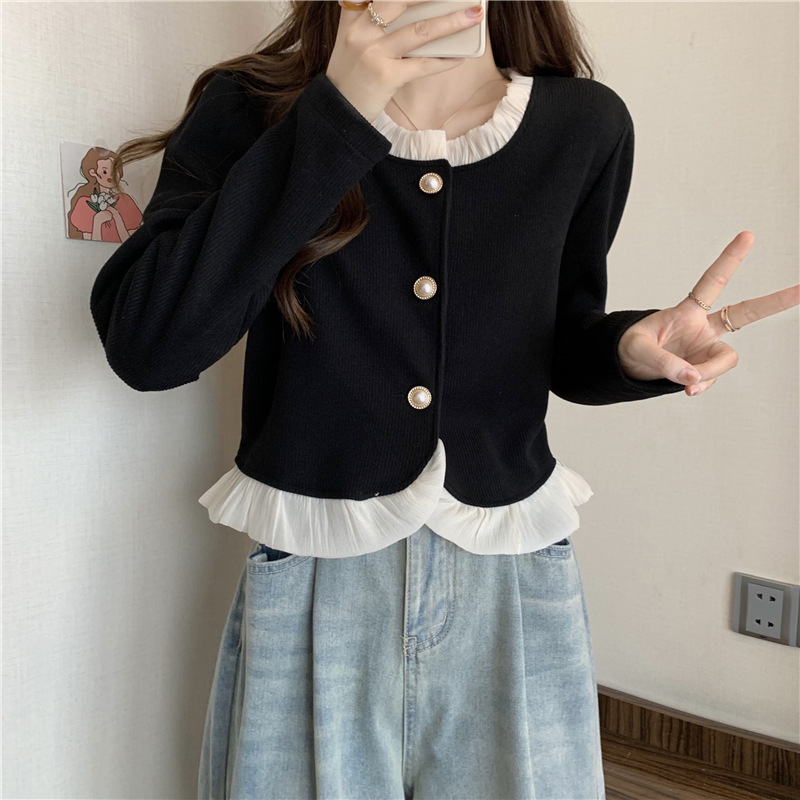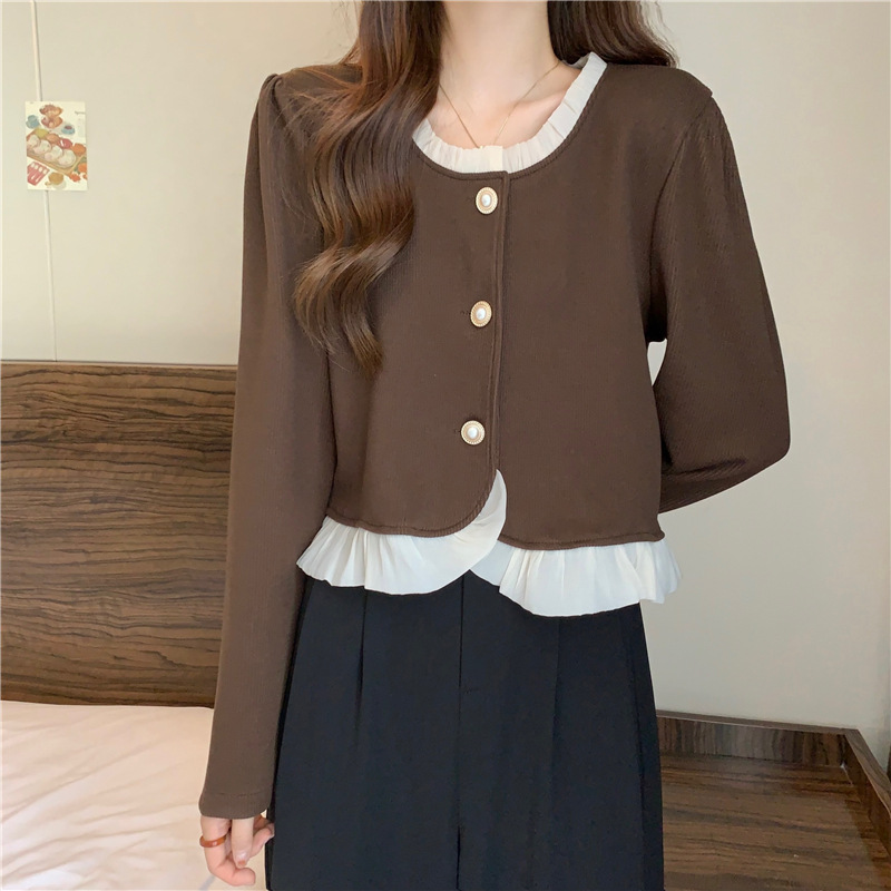 플러스 사이즈 배꼽 덮은 레이스 바느질 긴소매베이스 셔츠 여성 가을 뚱뚱한 자매 슬리밍 올 매치 카디건 셔츠 탑