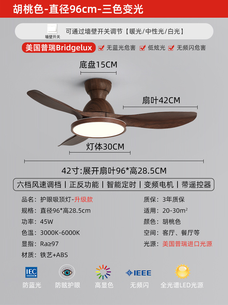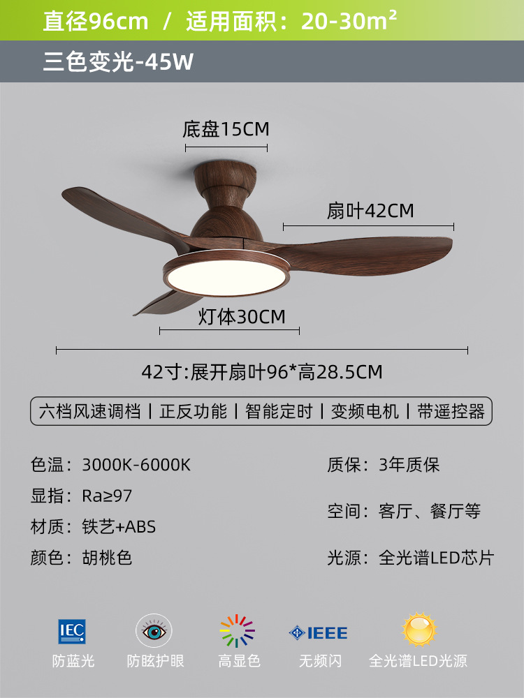 팬 램프 거실 식당 42 인치 큰 바람 복고풍 호두 나무 복고풍 음소거 통합 눈 보호 전기 팬 램프