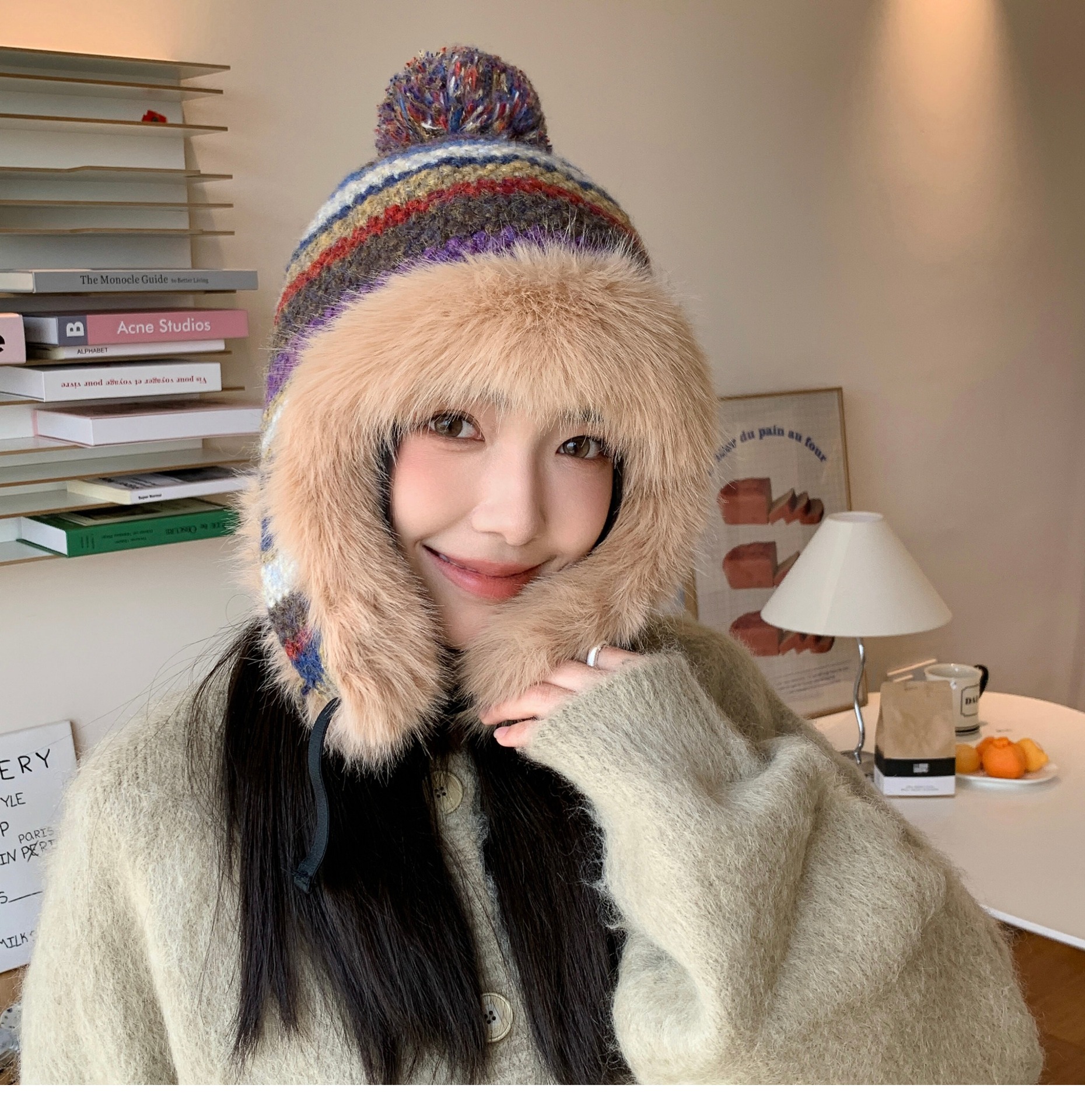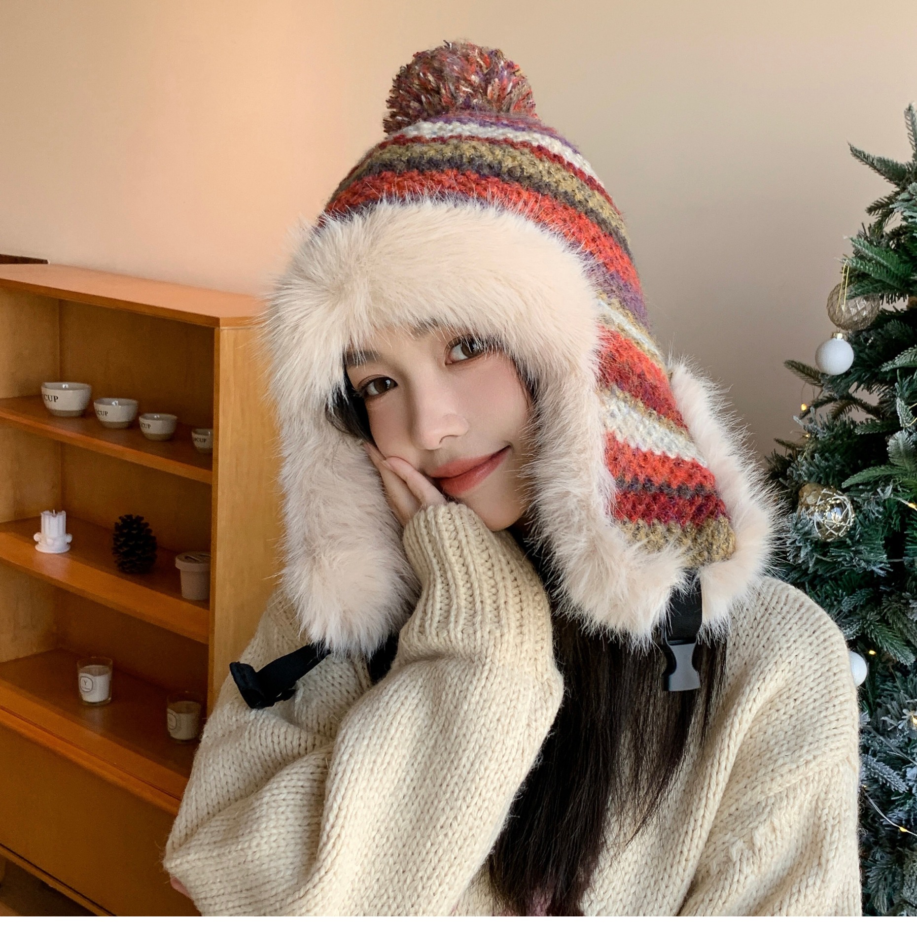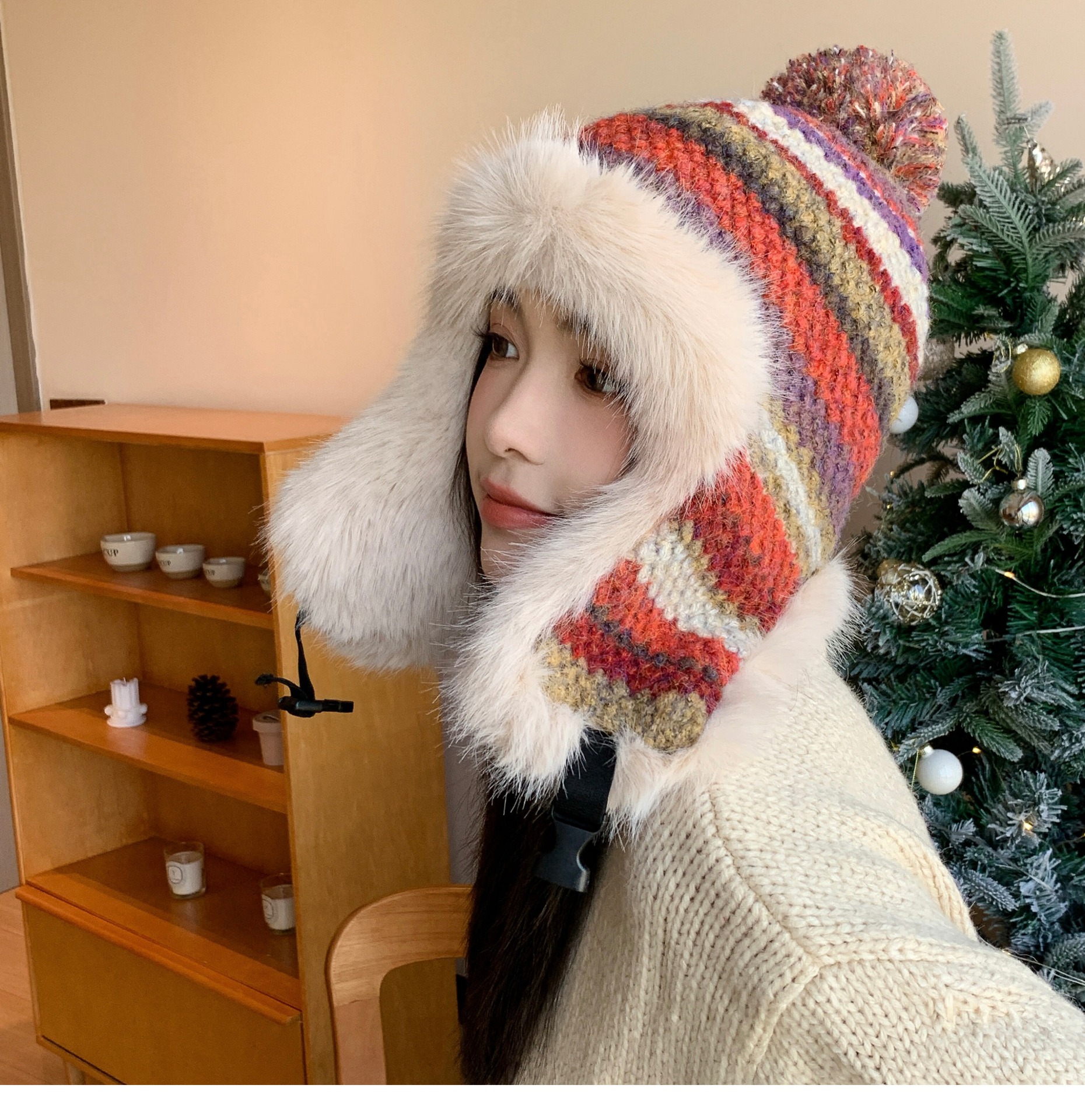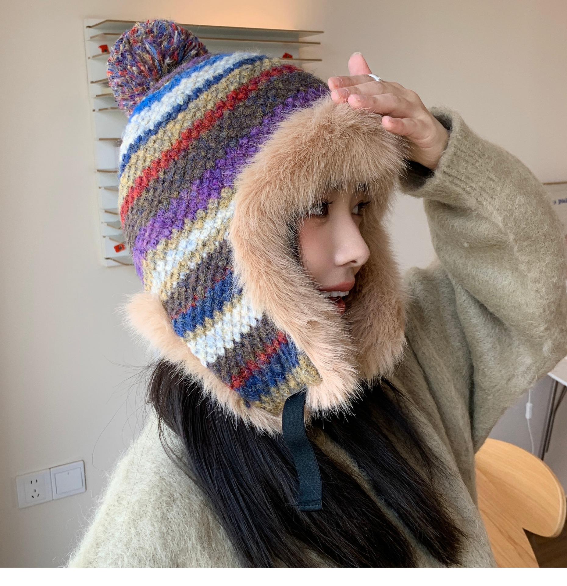 2024 새로운 레인보우 니트 레이 펑 모자 어린이 겨울 기모 두꺼운 따뜻한 귀 보호 냉장 사이클링 동북 모자스토어 가기