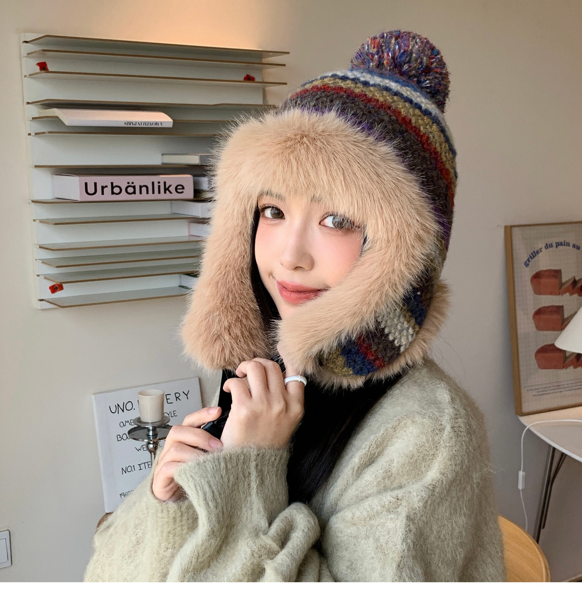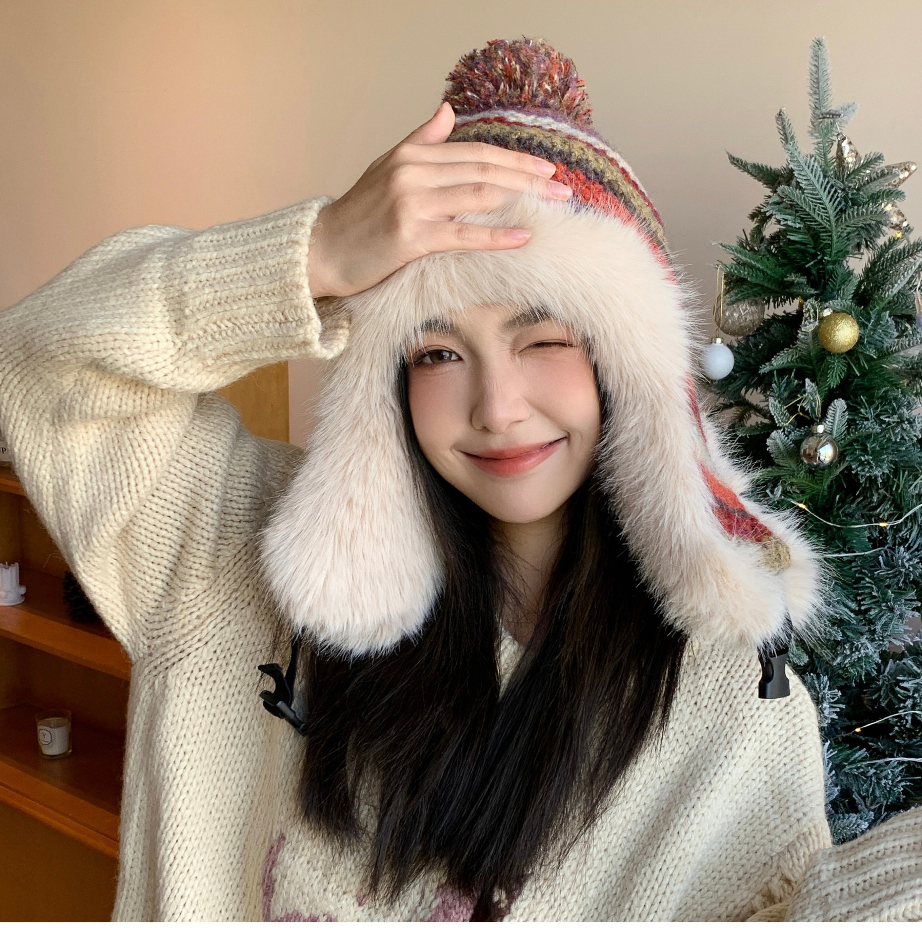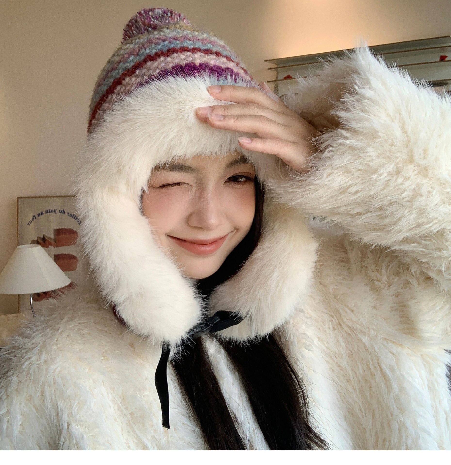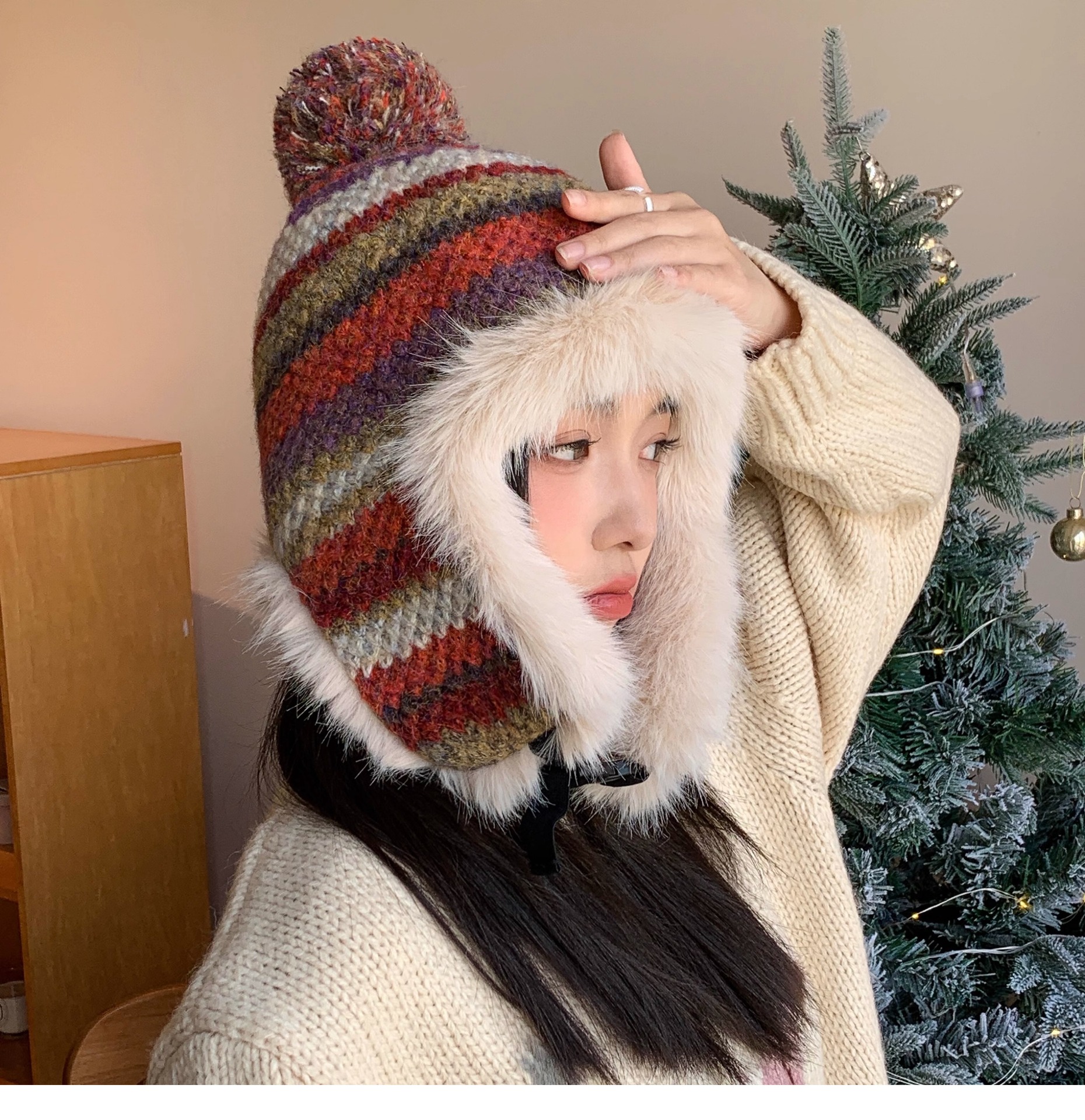 2024 새로운 레인보우 니트 레이 펑 모자 어린이 겨울 기모 두꺼운 따뜻한 귀 보호 냉장 사이클링 동북 모자스토어 가기