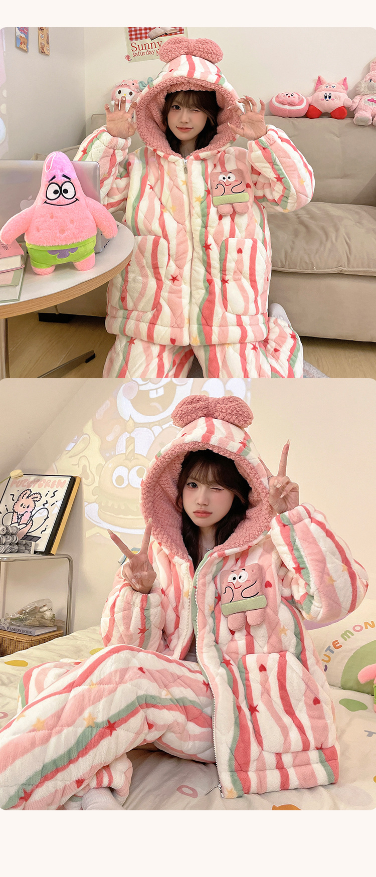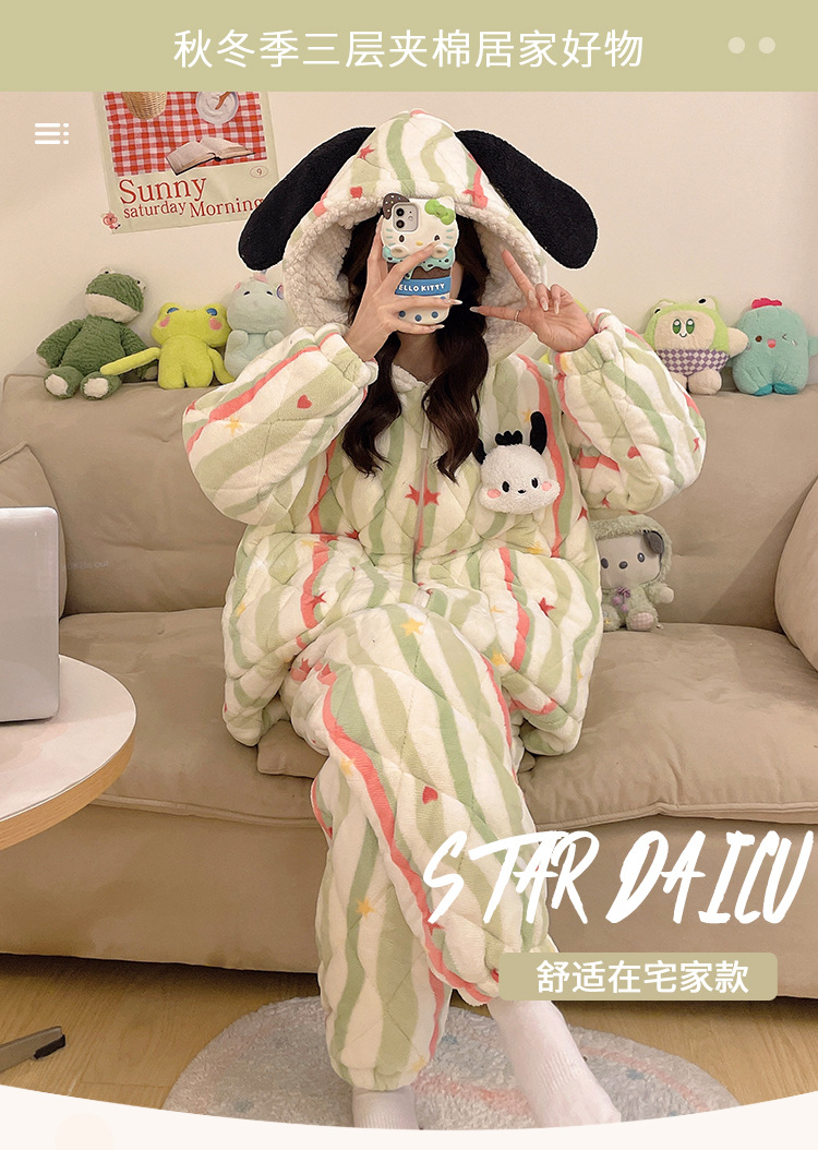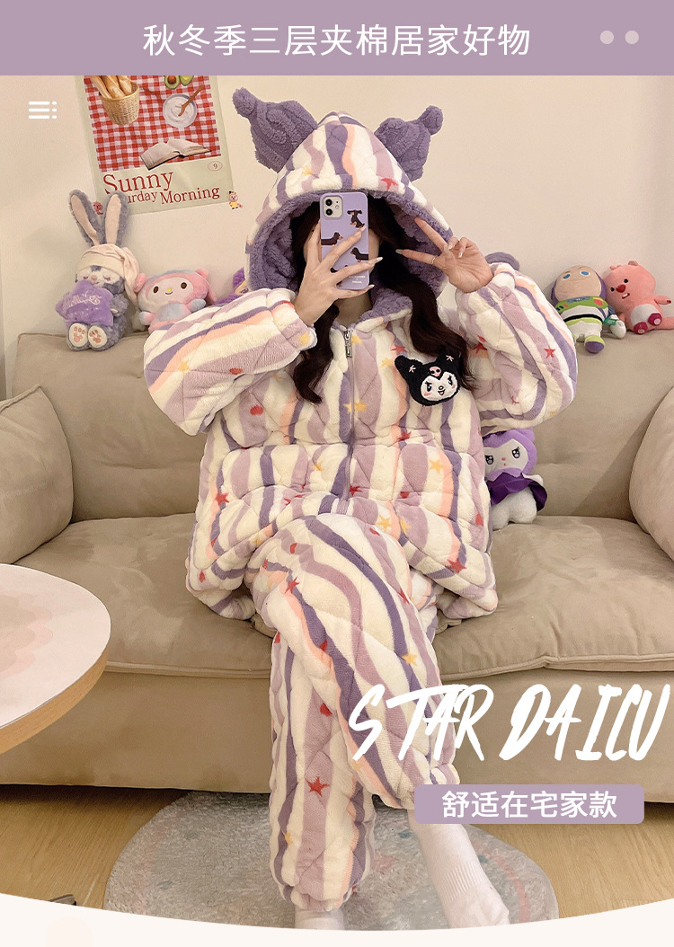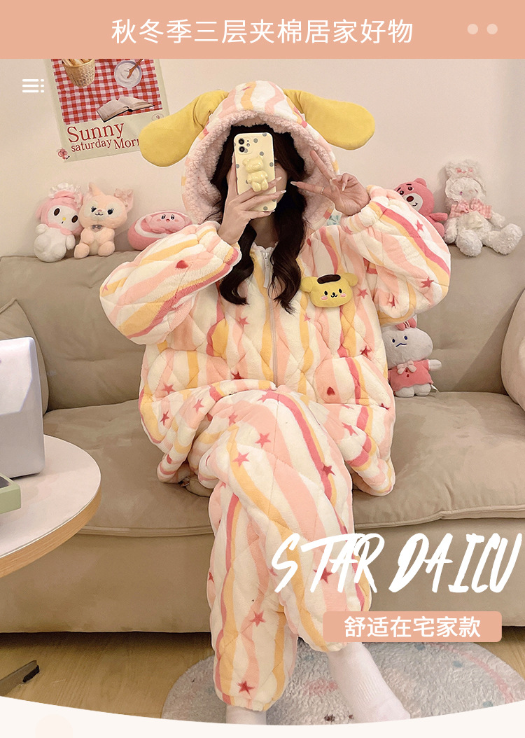 산호 양털 파자마 여성의 겨울 3 층 두께면 패딩 홈 재킷 플란넬 여성 만화 세트 새로운 스타일스토어 가기