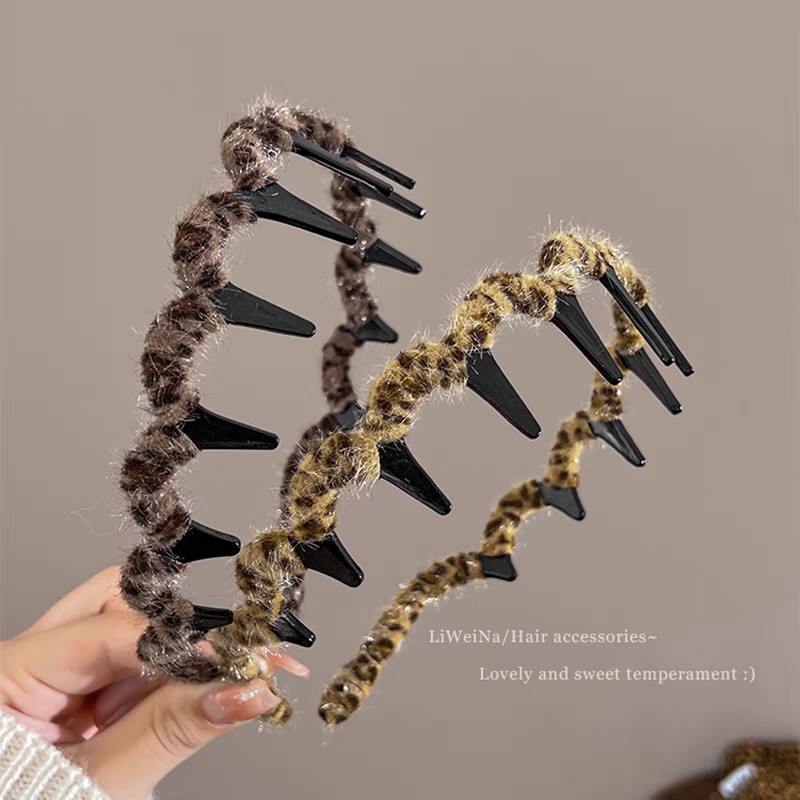 우아한 레오파드 무늬 웨이브 헤어 후프 여성의 푹신한 질감 높은 두개골 탑 워시 얼굴 압력 헤어 후프 고급 헤어 액세서리 가을 헤어 클립