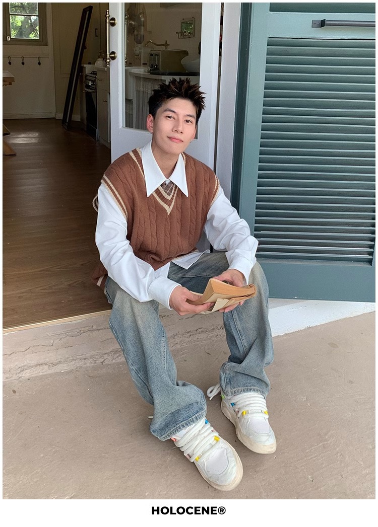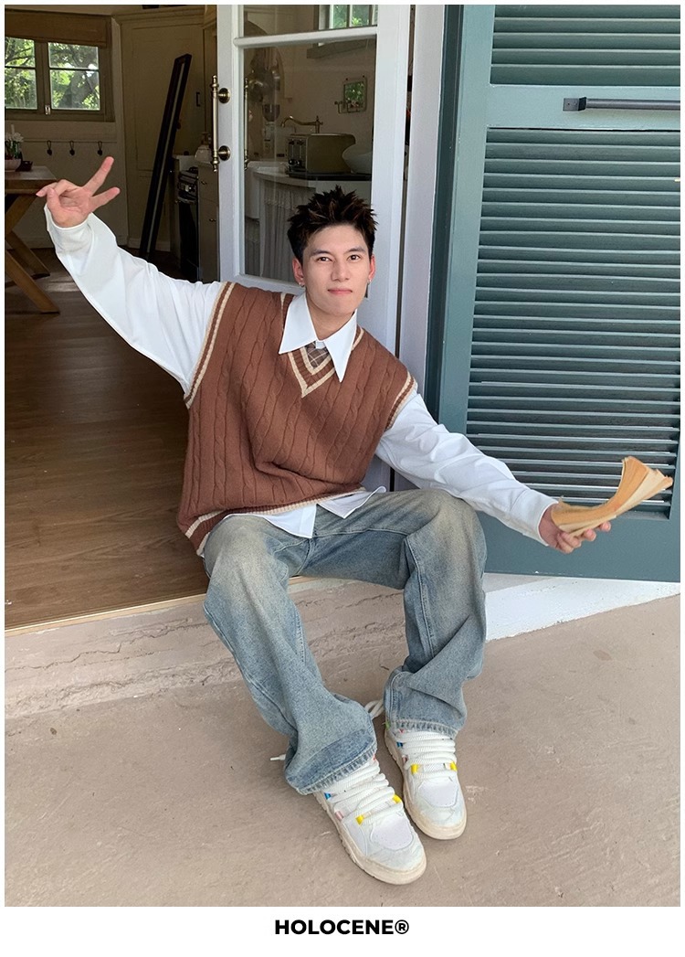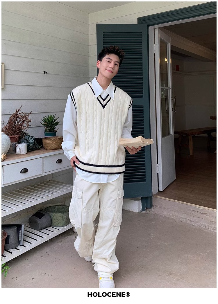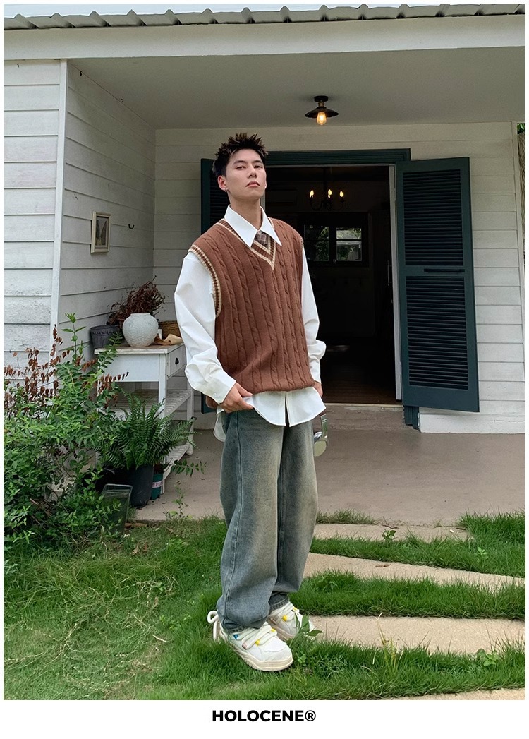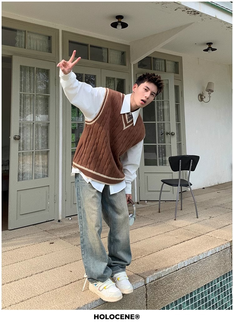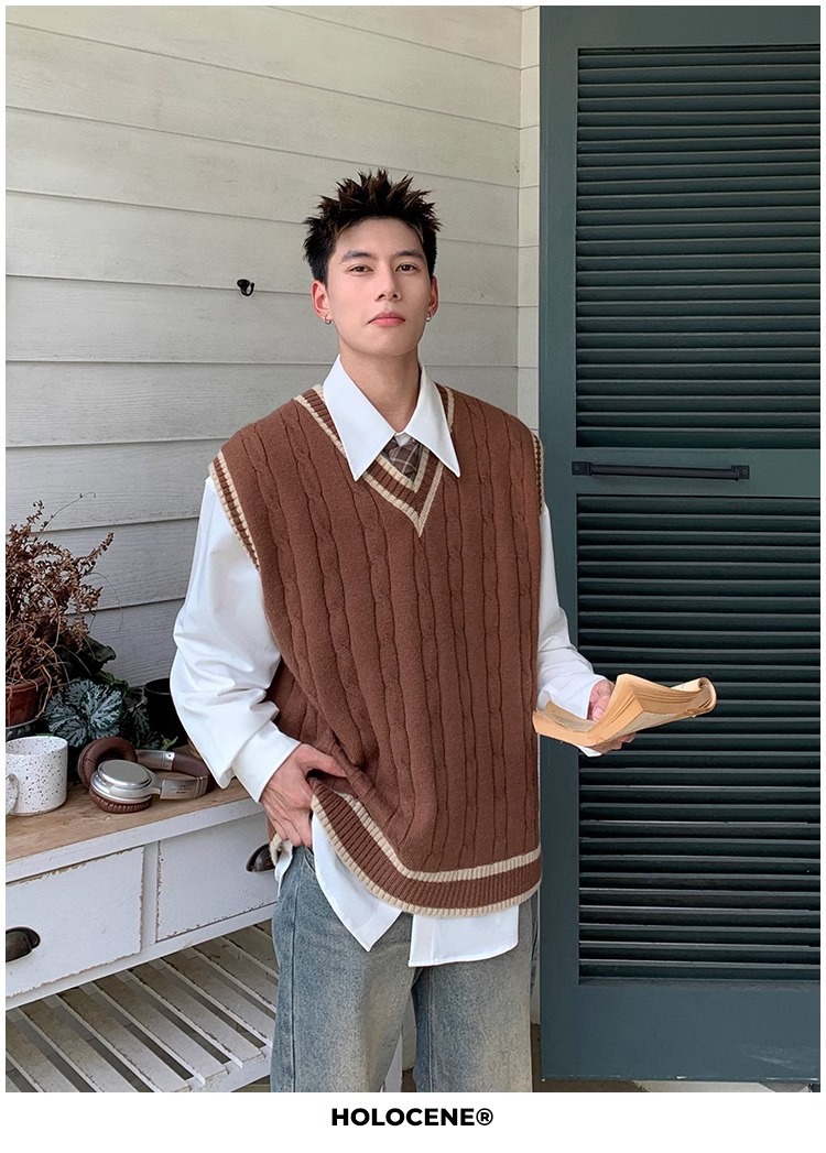 미국 스타일의 트렌디 한 브랜드 레트로 V 넥 칼리지 스타일 스웨터 조끼 가을과 겨울 새로운 트위스트 컬러 비틀 조끼 탑스토어 가기