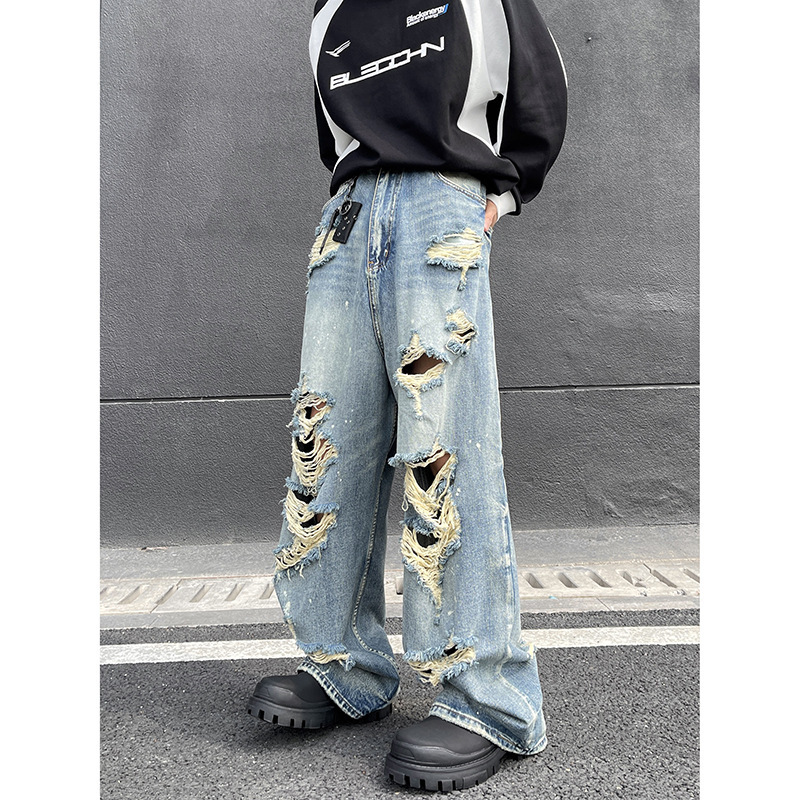 아메리칸 스타일 레트로 세탁 된 청바지 남성 여름 더피 핸섬 트렌디 브랜드 디자인 센스 니쉬 스트레이트 캐주얼 바지스토어 가기