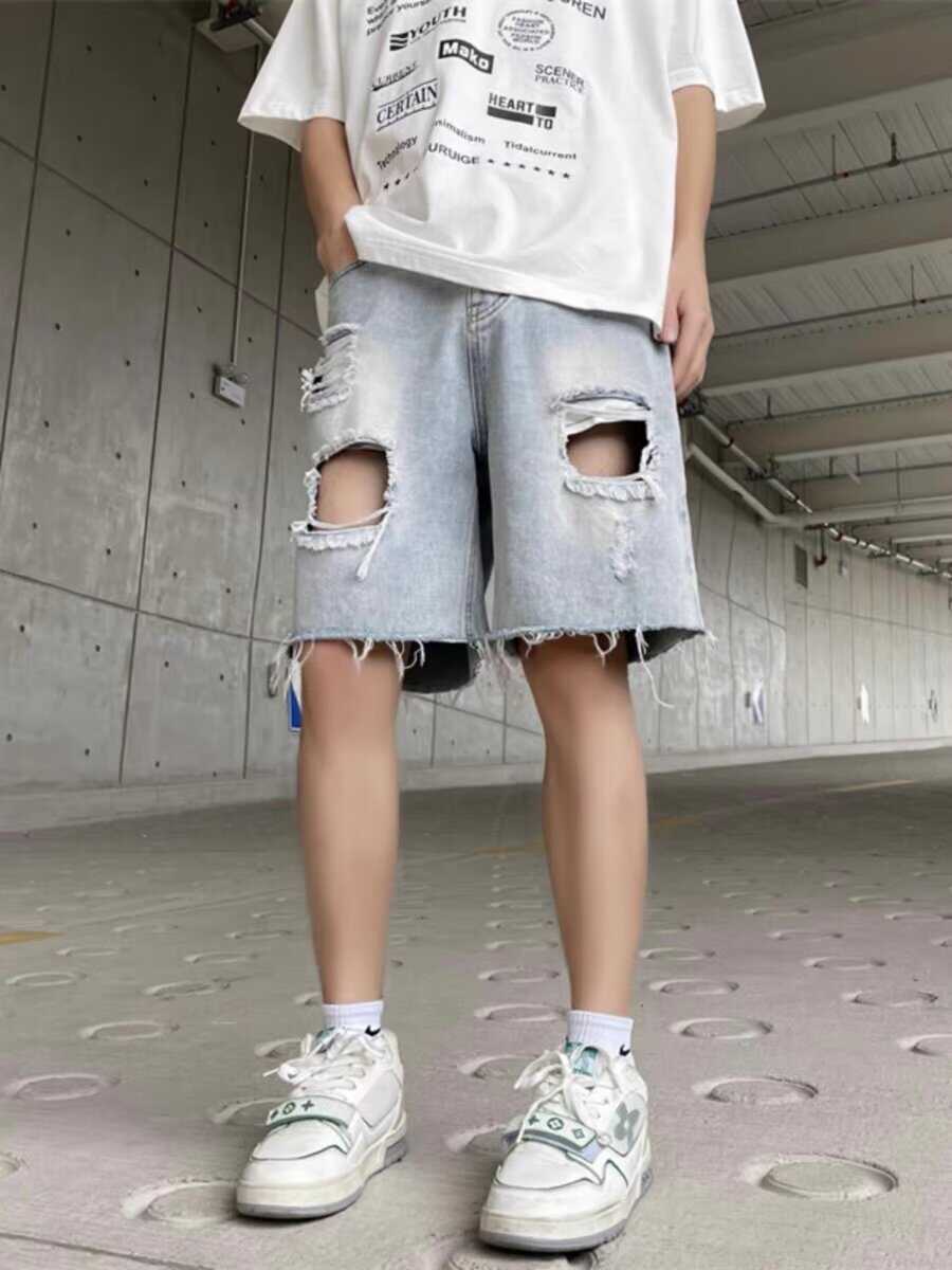 여름 새로운 미국 스타일 하이 스트리트 데님 반바지 남성 한국 스타일 패션 리핑 슬림핏 리핑 엣지 리핑 루즈 바지스토어 가기