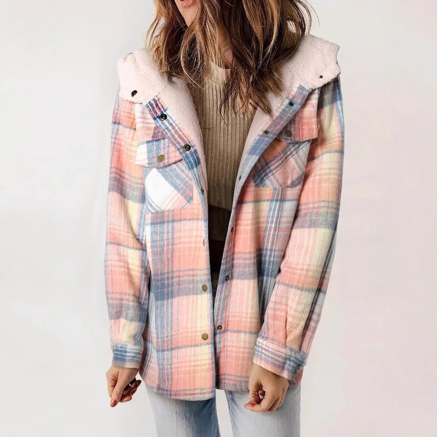 2024 유럽과 미국의 아마존 가을과 겨울 여성 격자 무늬 재킷 긴 소매 푹신한 후드 자켓 포켓스토어 가기