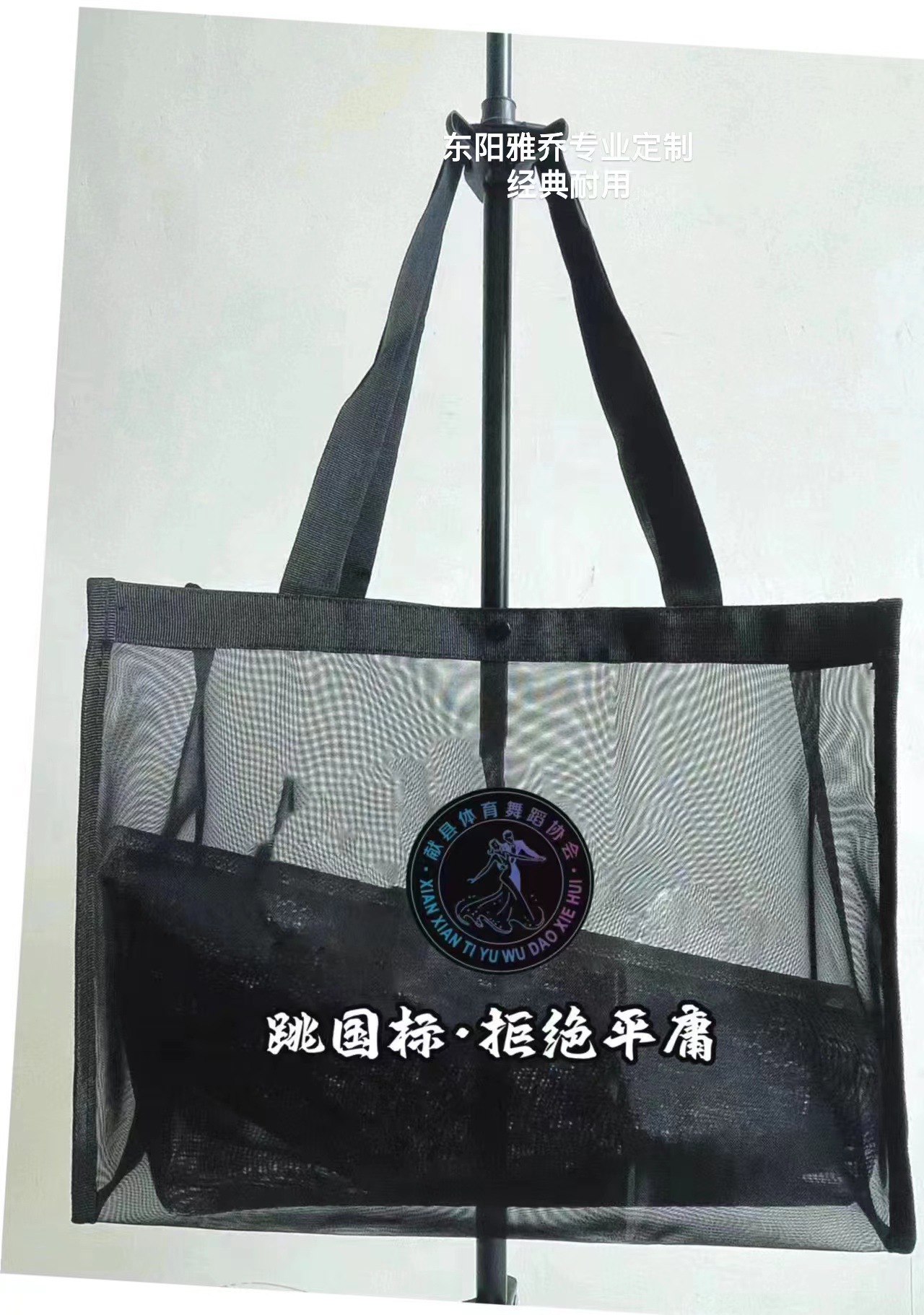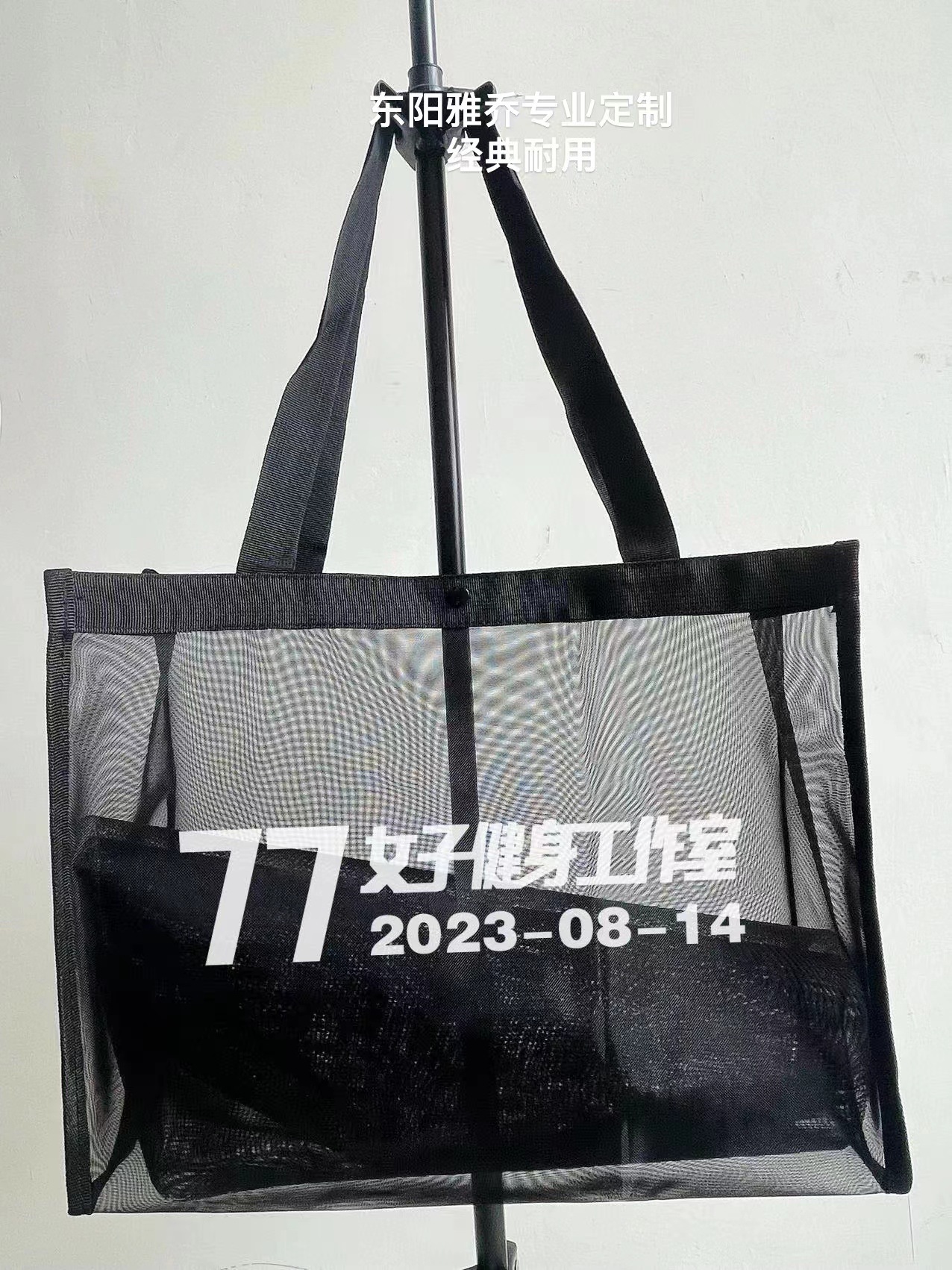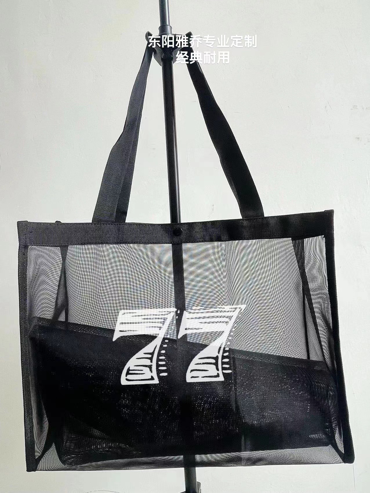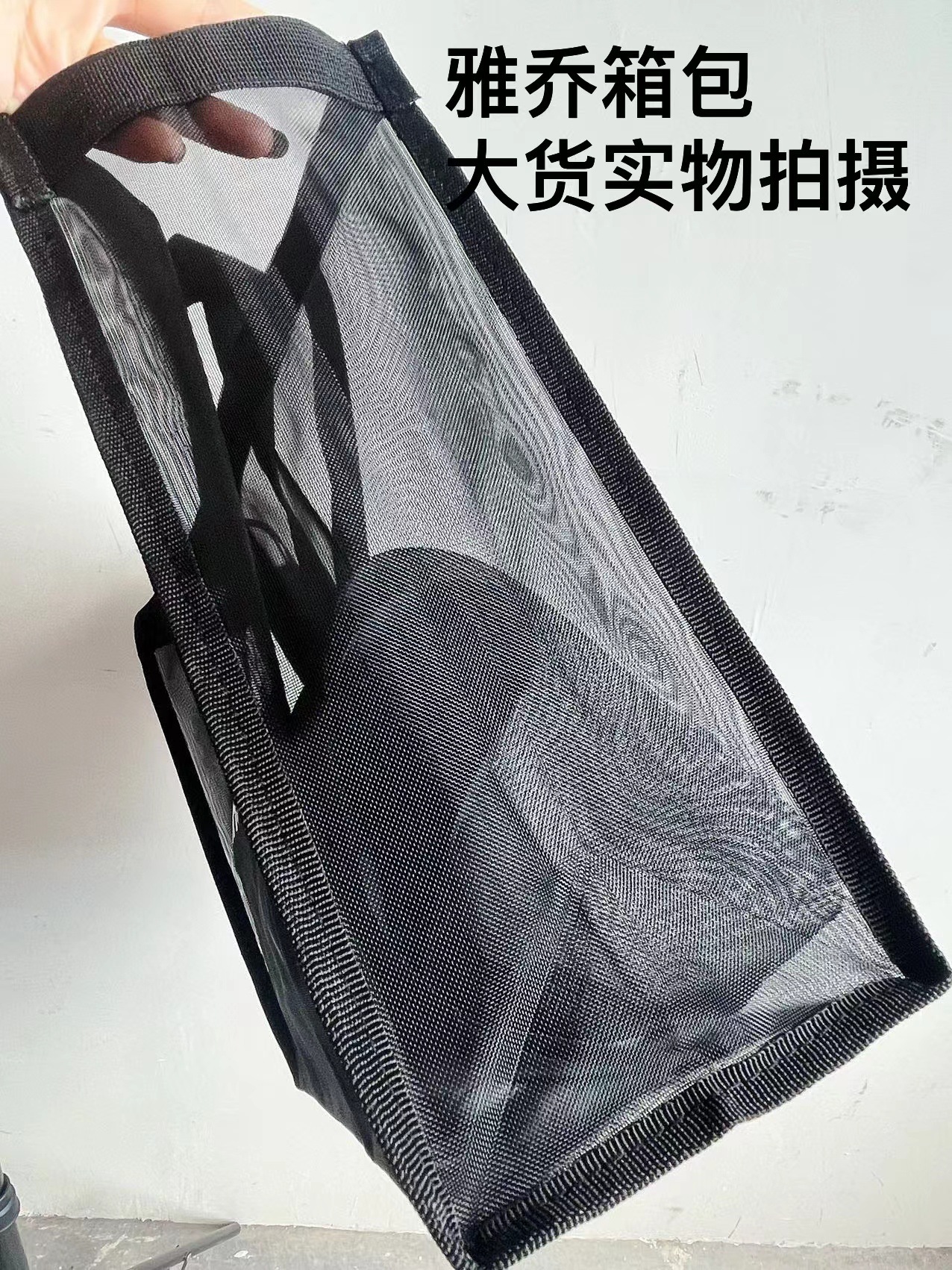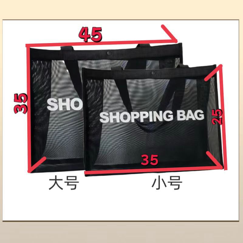 现货:黑色网纱包,有大号, 小号 正面都有白色字“Shopping Bag