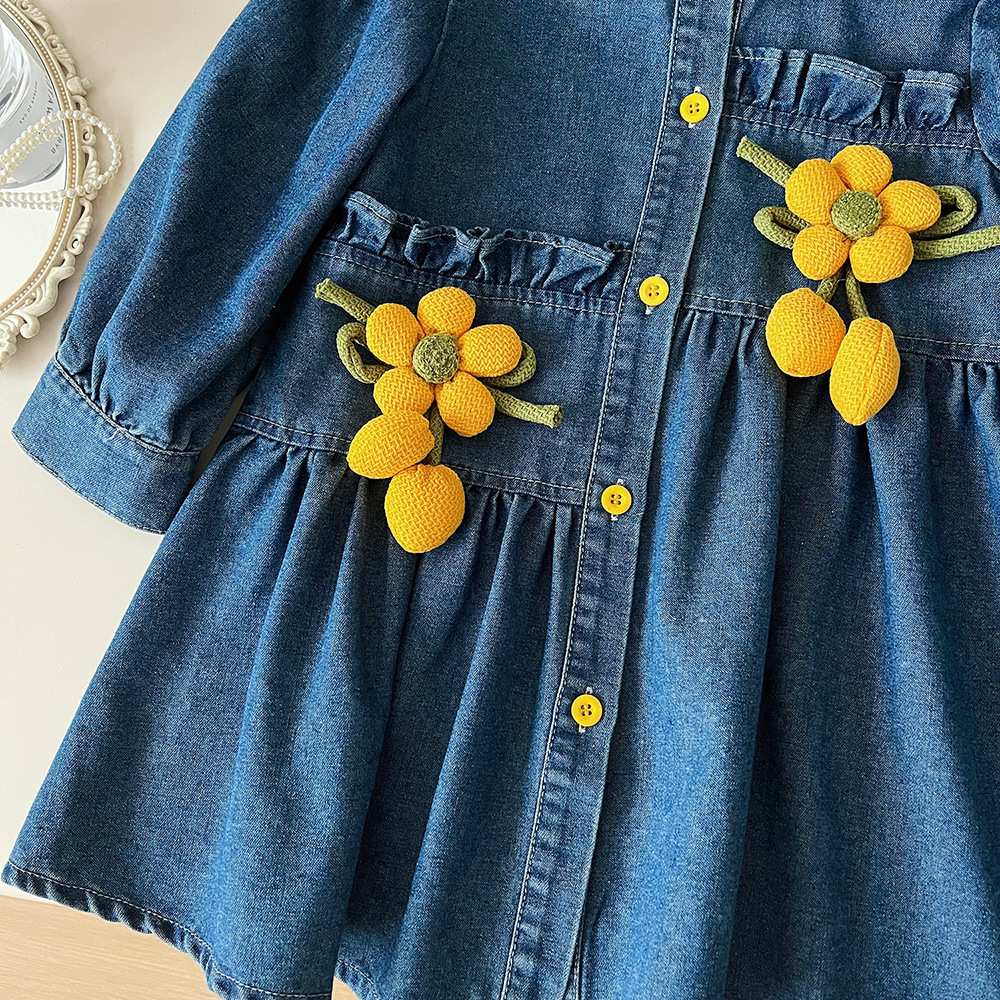 2024 가을 새로운 한국 여자 해바라기 데님 긴 소매 원피스 아기 소녀 귀여운 치마 도매스토어 가기