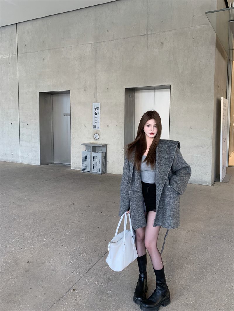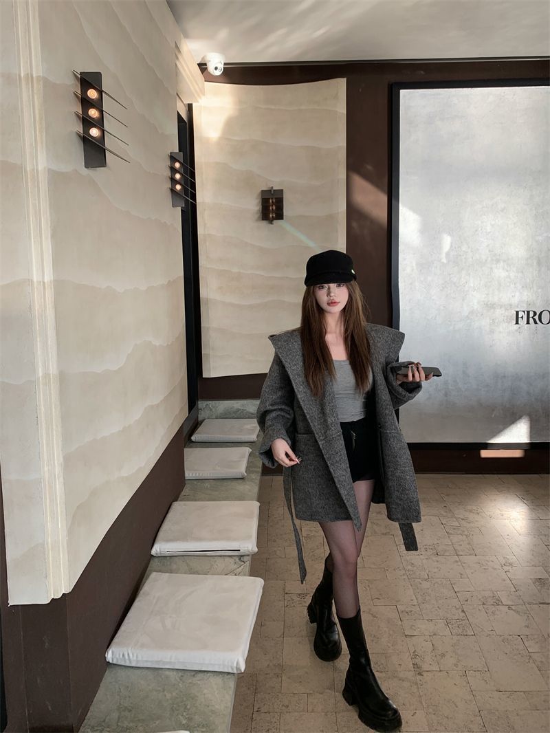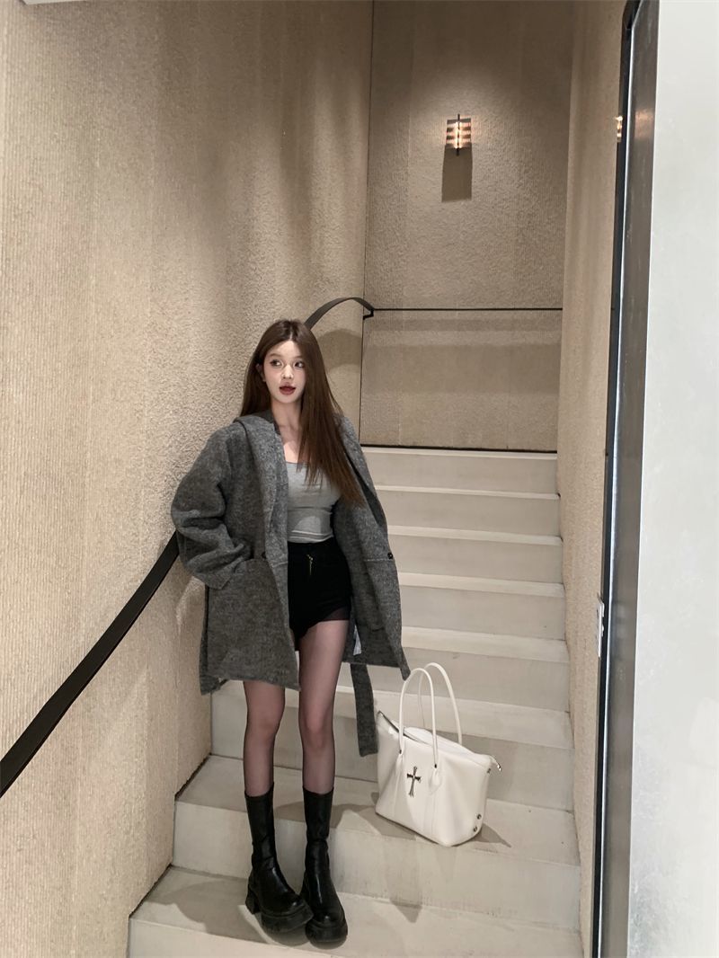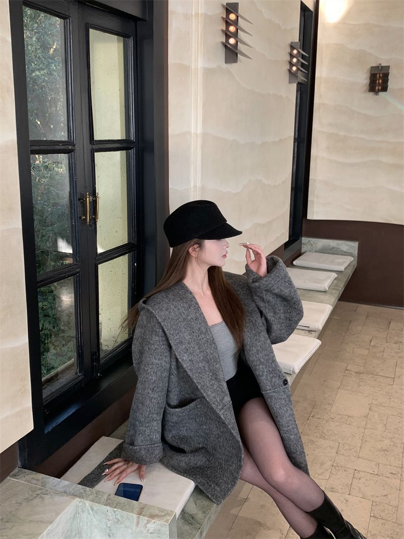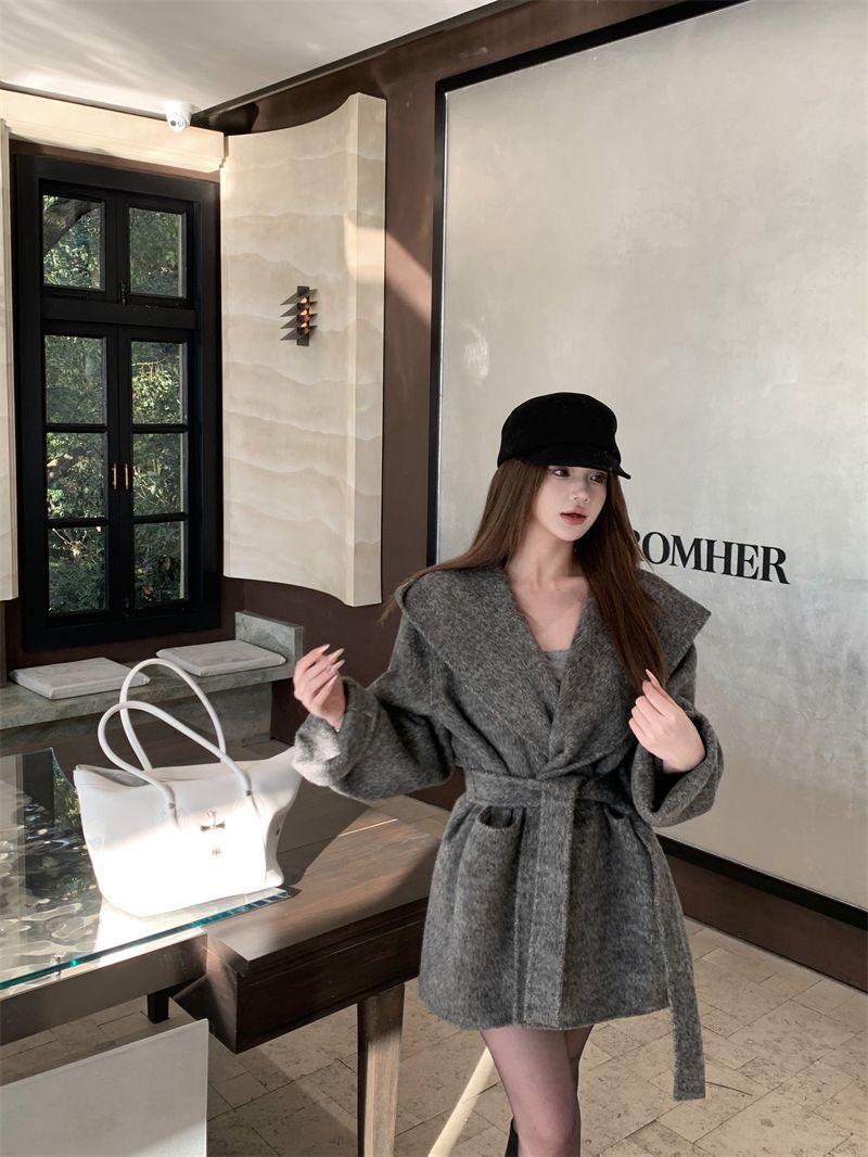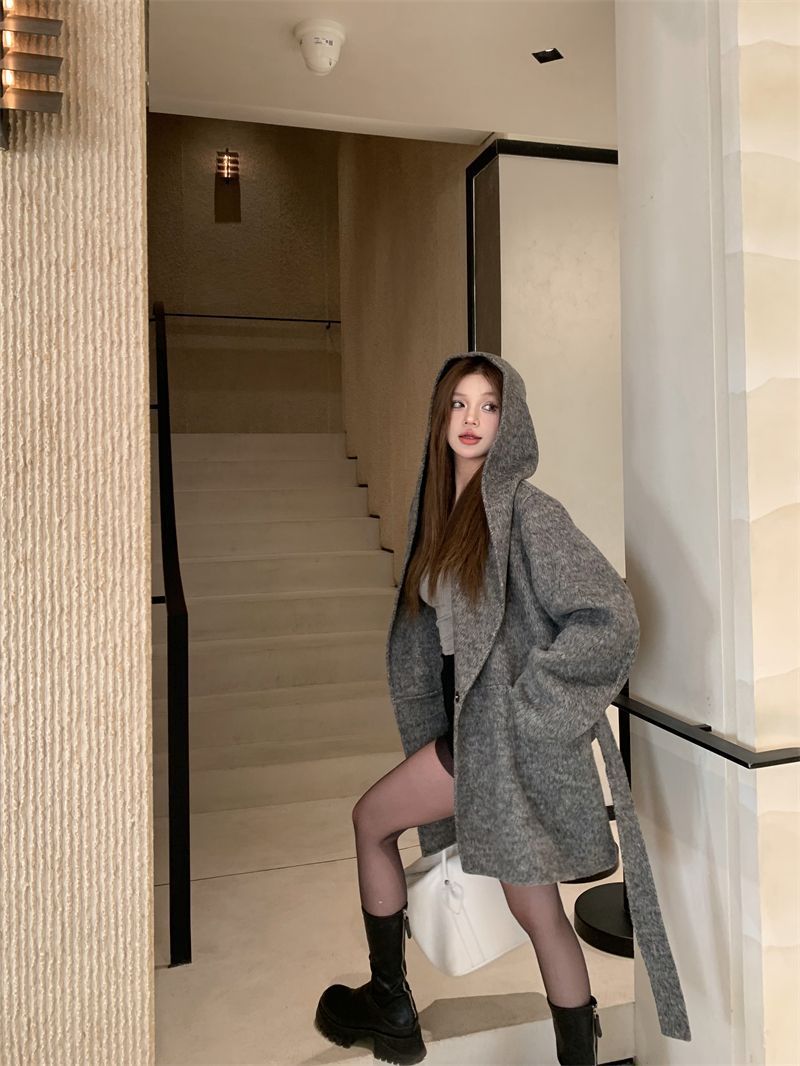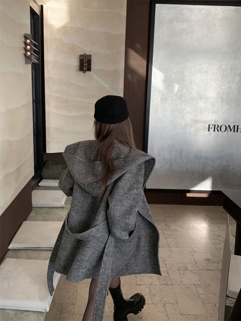 빈티지 그레이 후드 긴팔 모직 코트 여성의 가을과 겨울 느슨한 게으른 중간 길이의 우아한 모직 카디건 코트스토어 가기