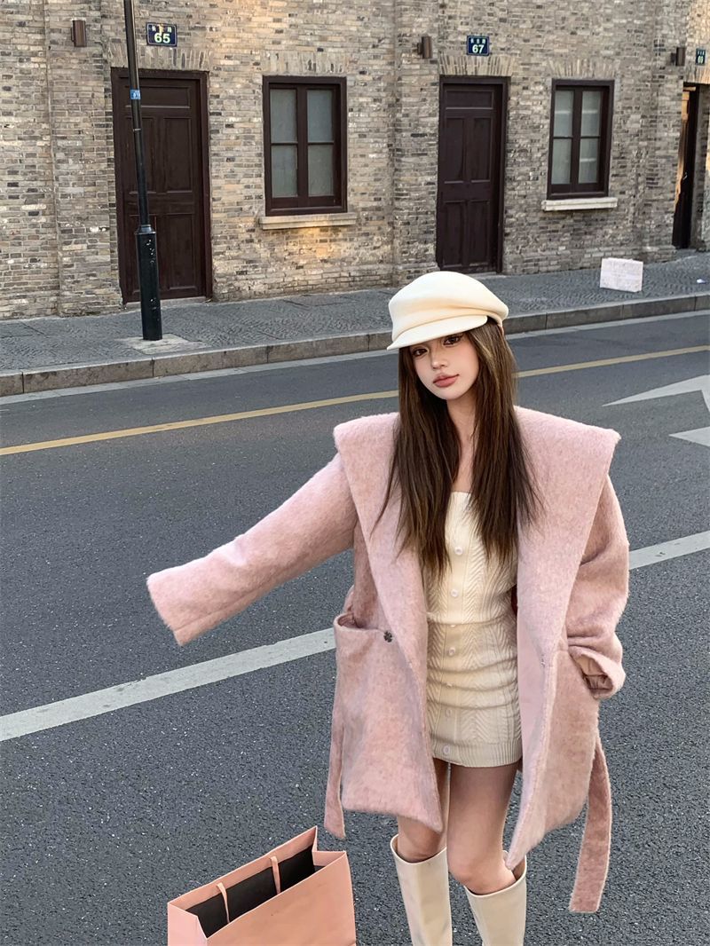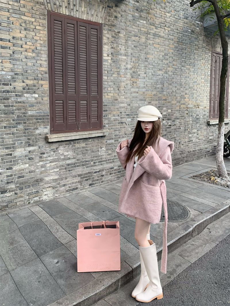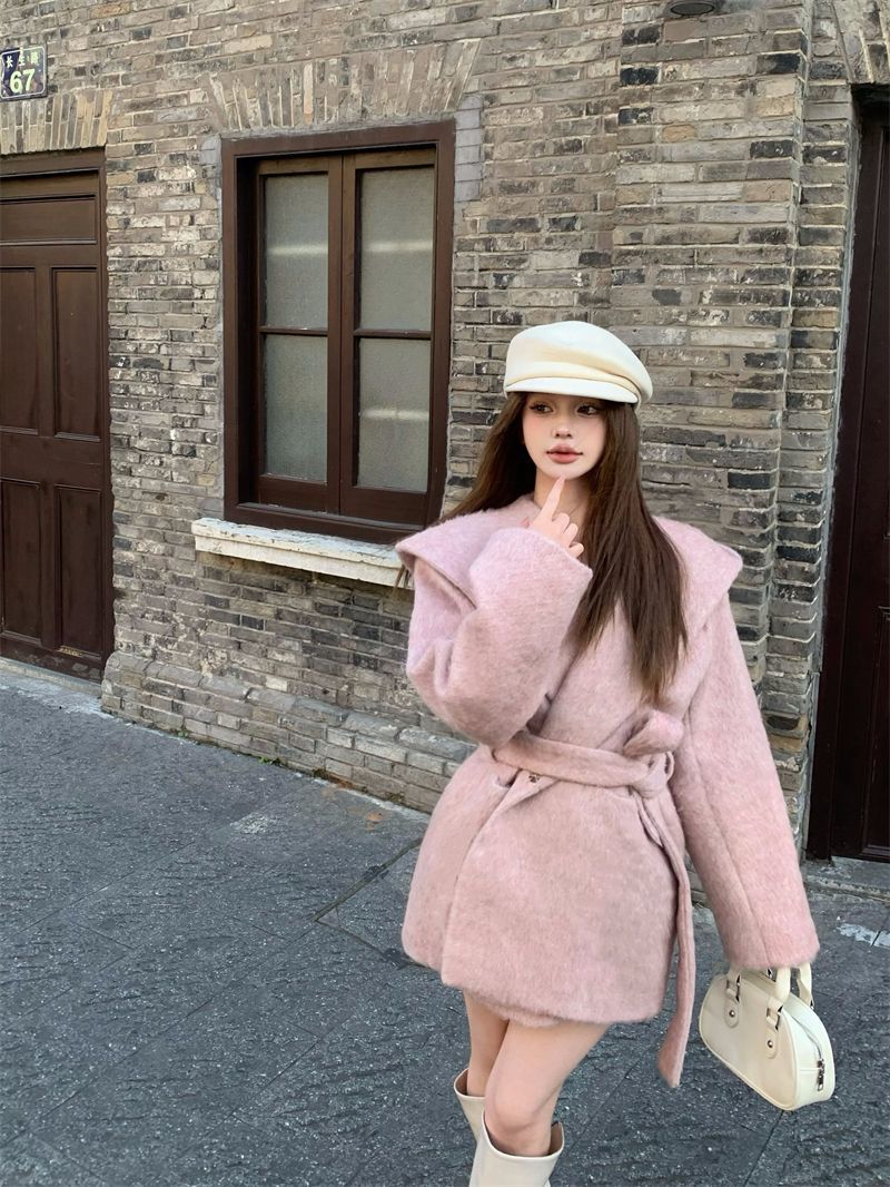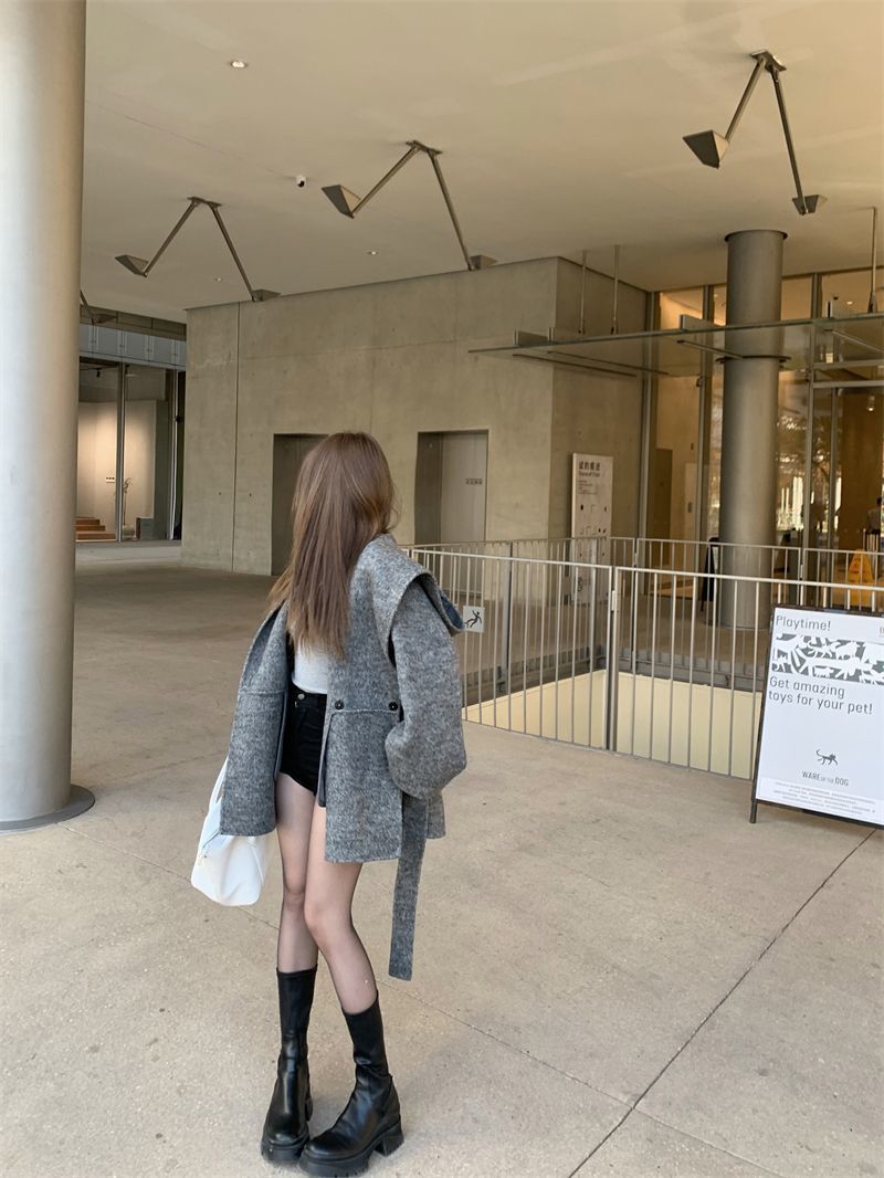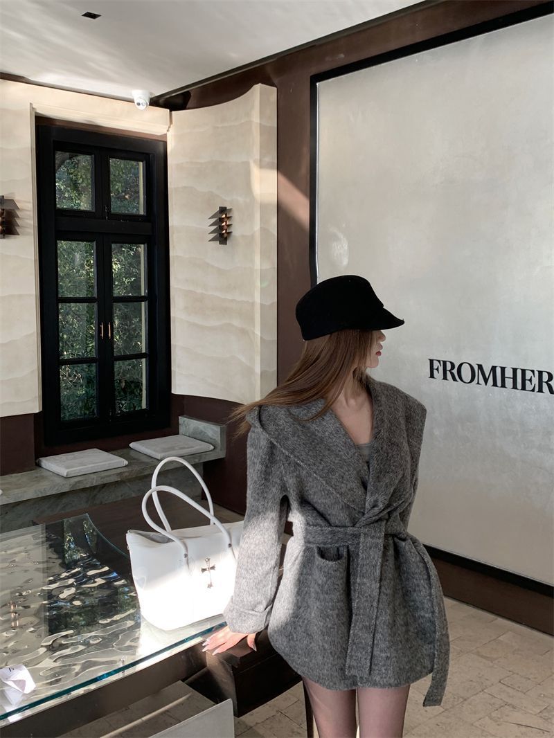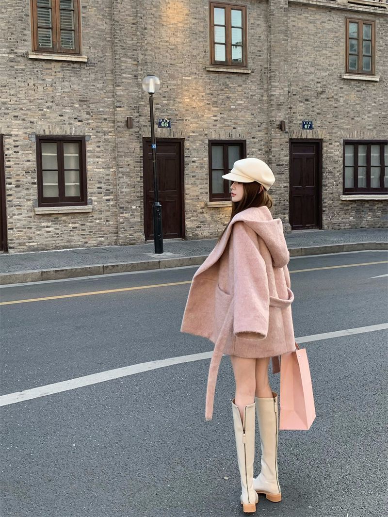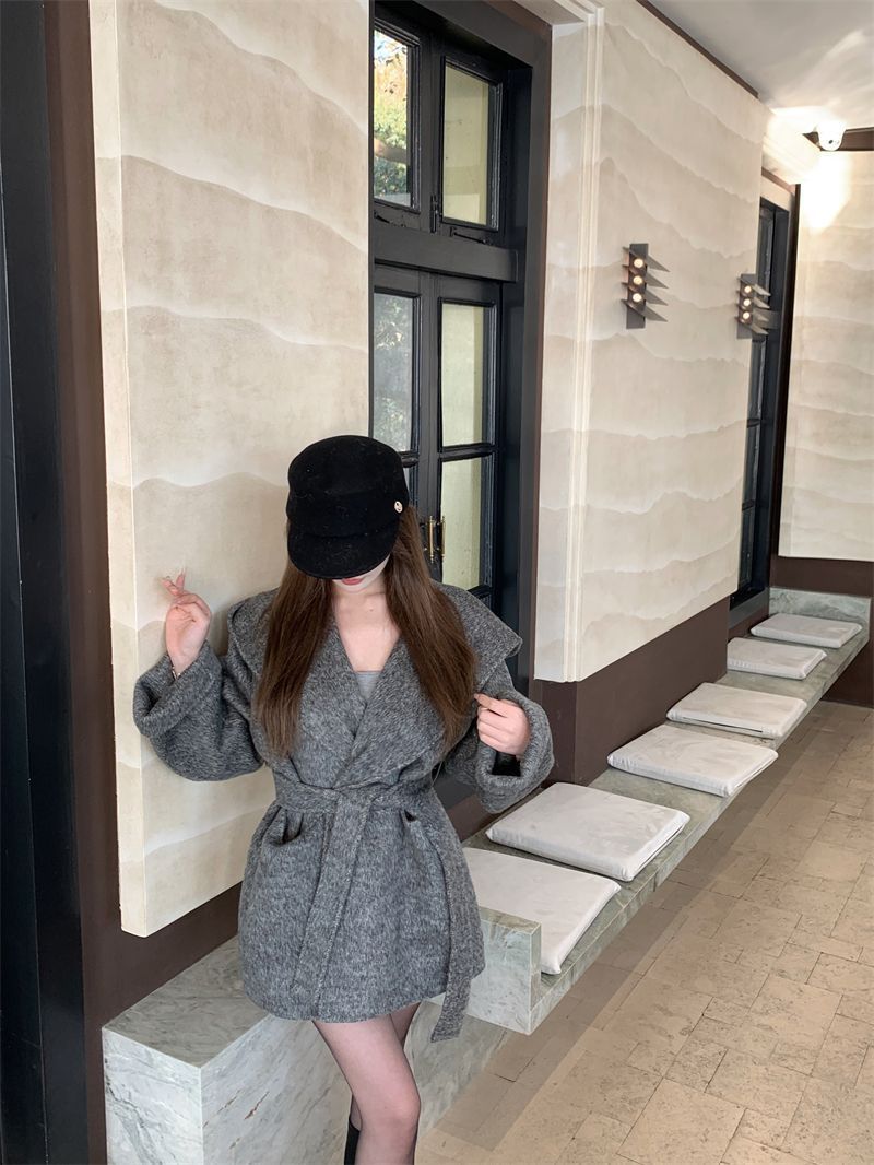 빈티지 그레이 후드 긴팔 모직 코트 여성의 가을과 겨울 느슨한 게으른 중간 길이의 우아한 모직 카디건 코트스토어 가기
