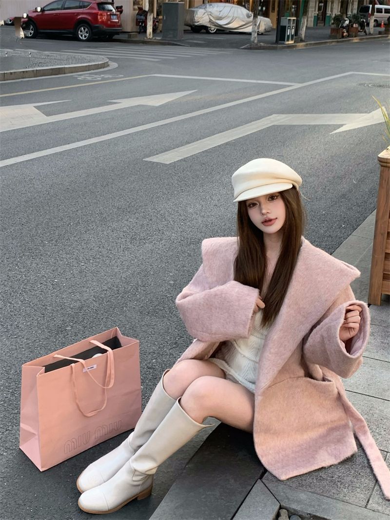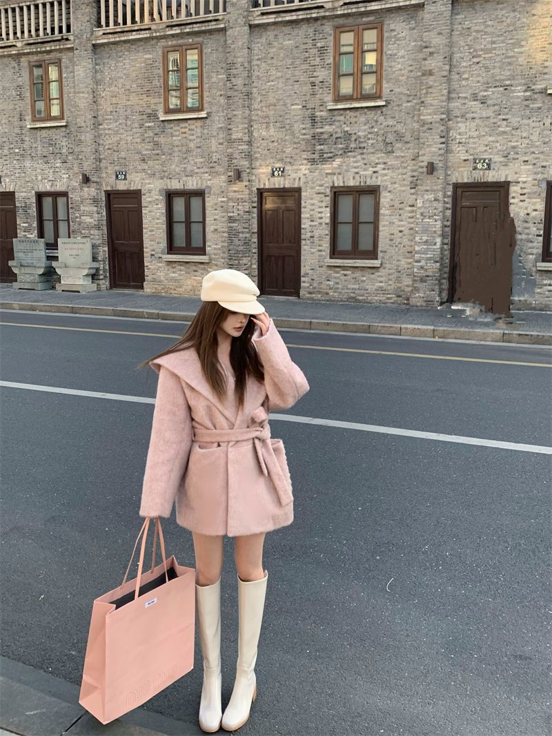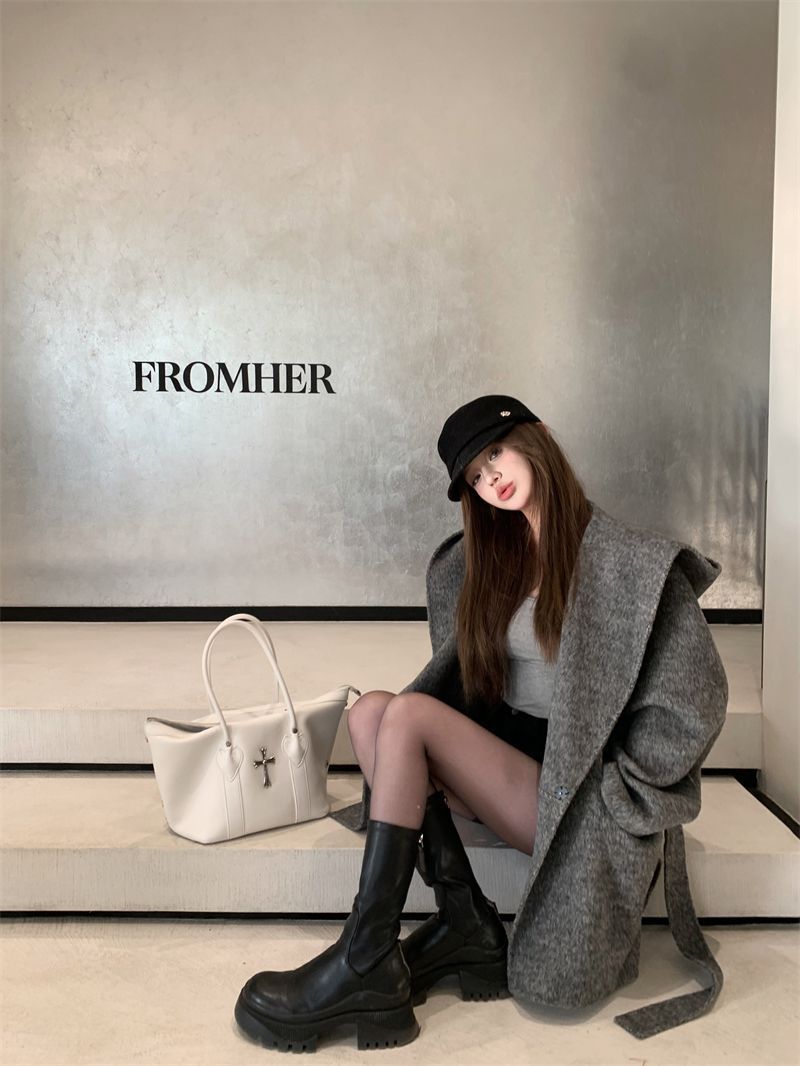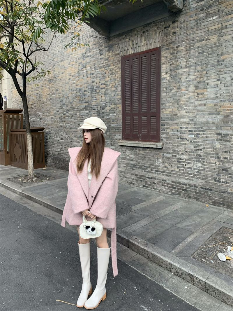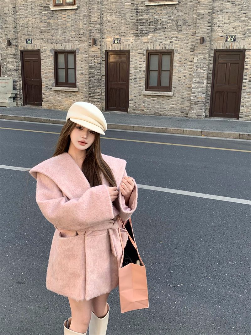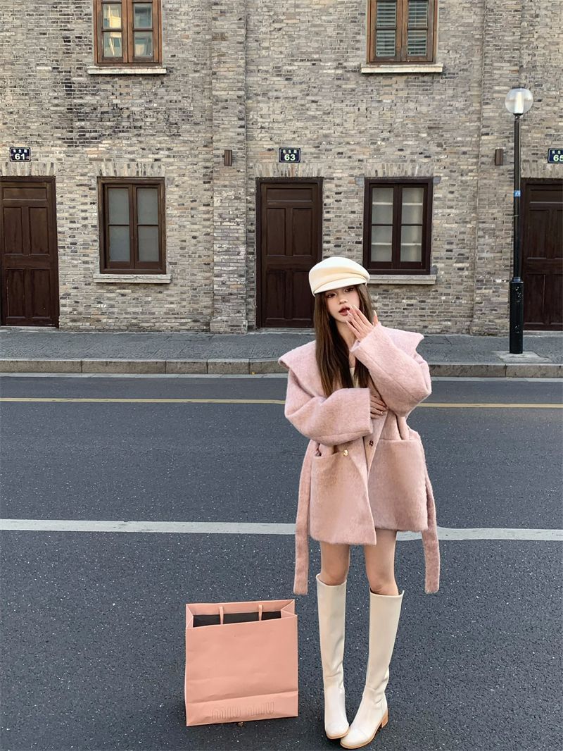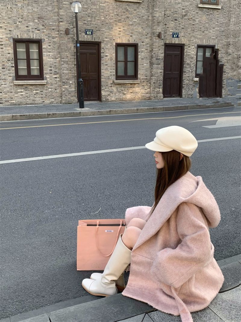 빈티지 그레이 후드 긴팔 모직 코트 여성의 가을과 겨울 느슨한 게으른 중간 길이의 우아한 모직 카디건 코트스토어 가기