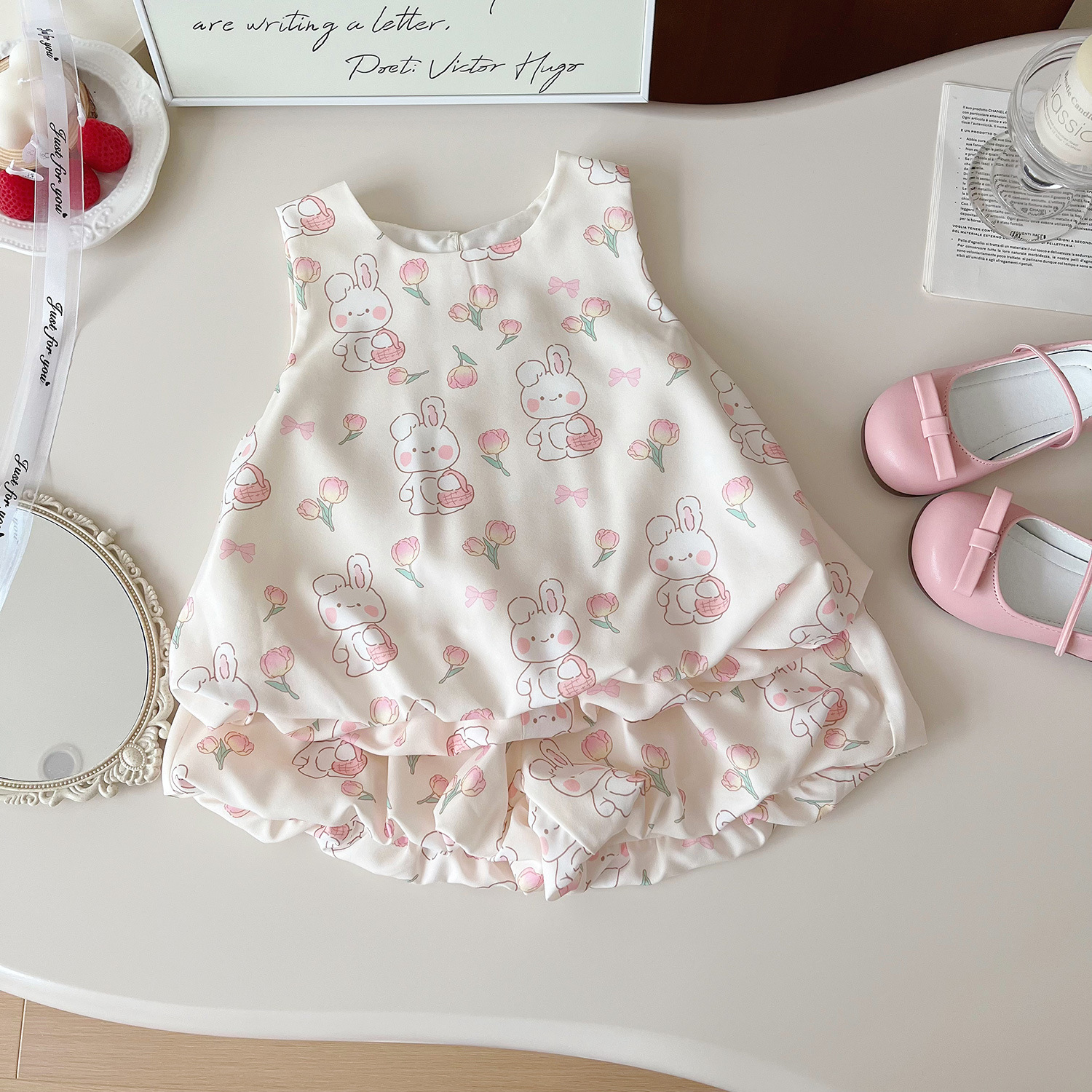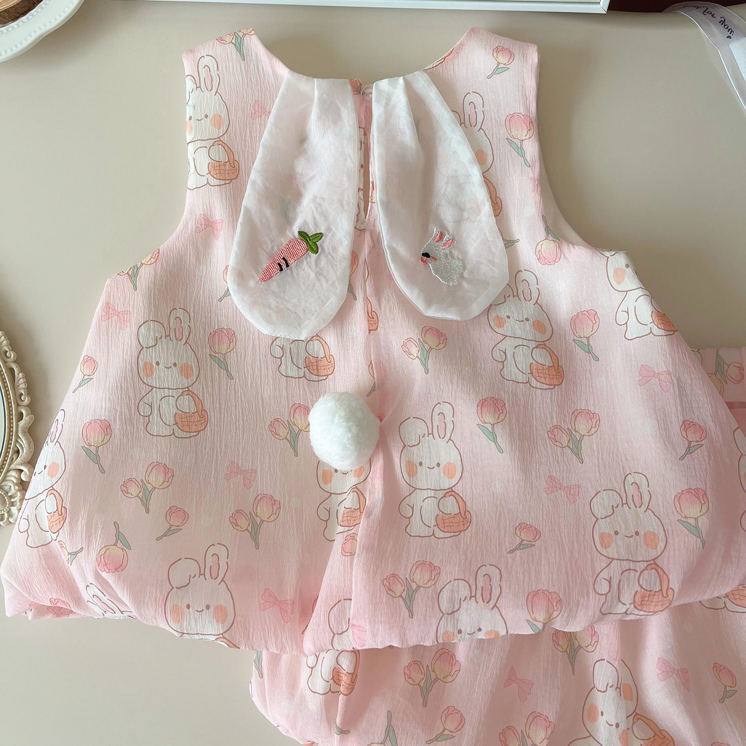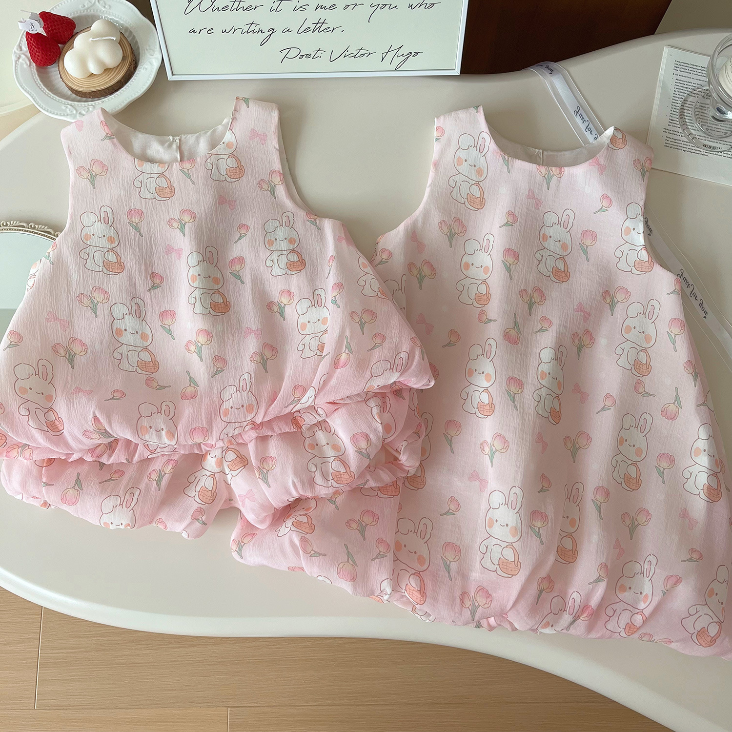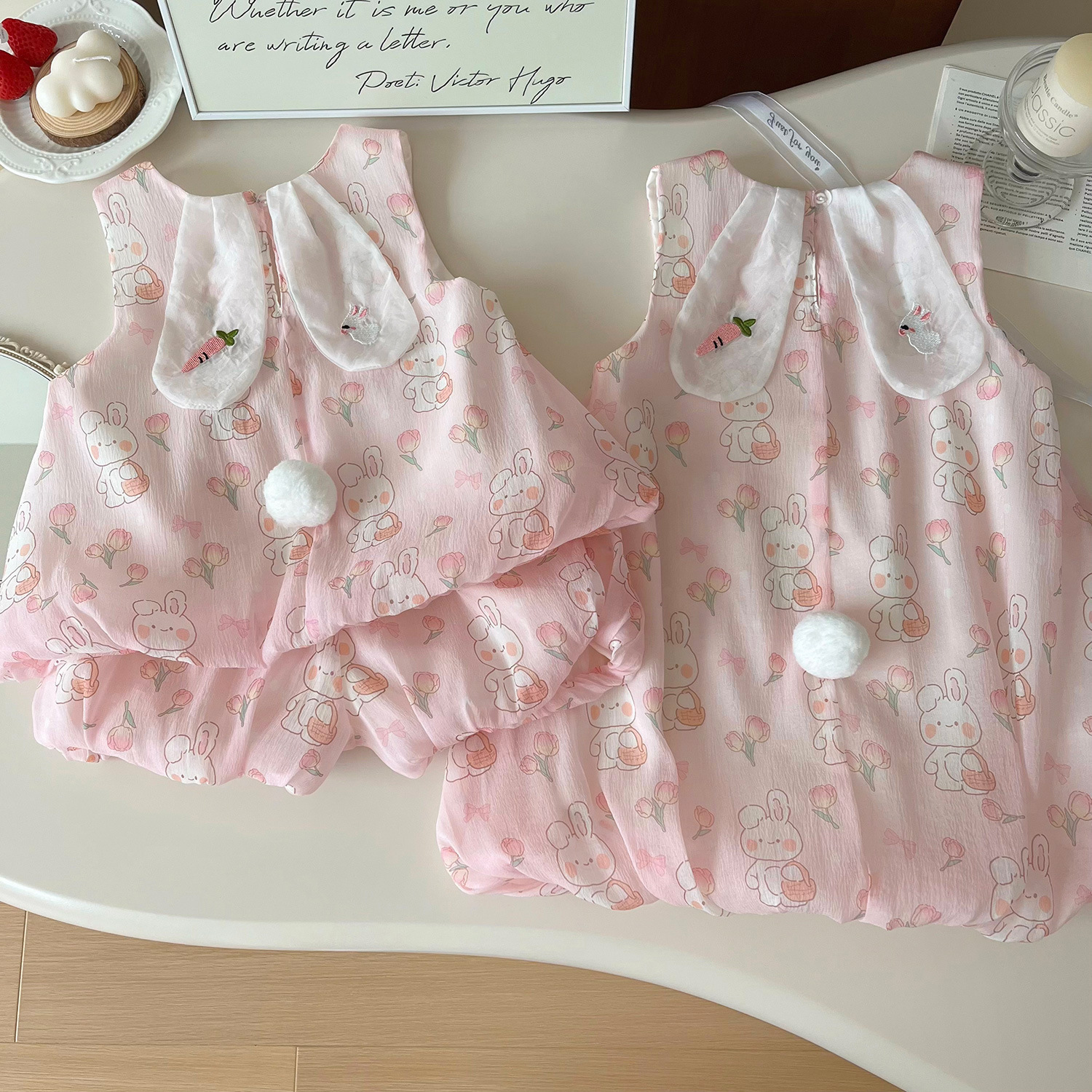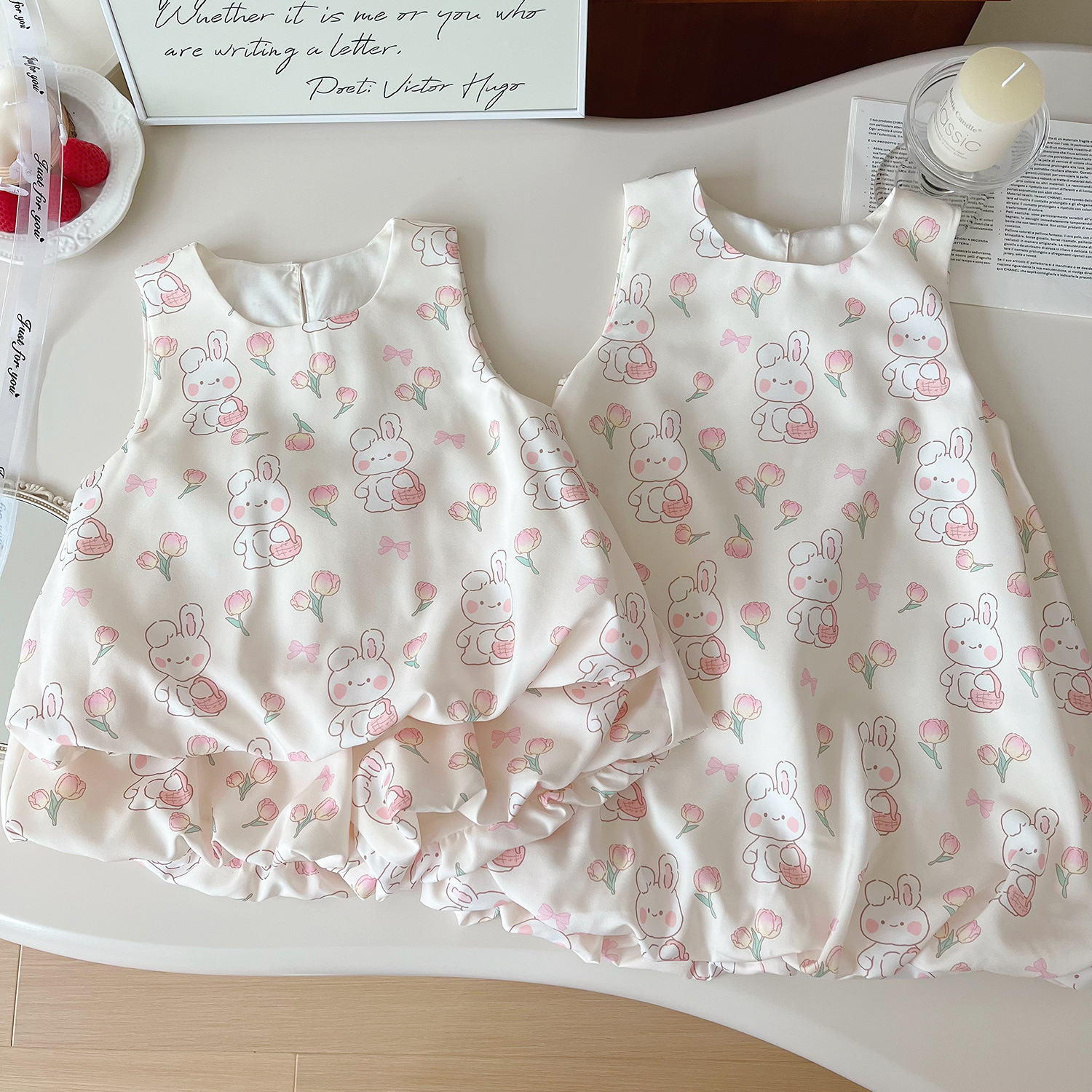 2024 년 여름 새로운 한국 여자 토끼 귀 꽃 봉오리 치마 소녀 자매 세트 원피스 197-198