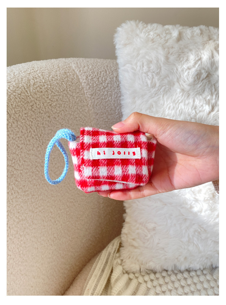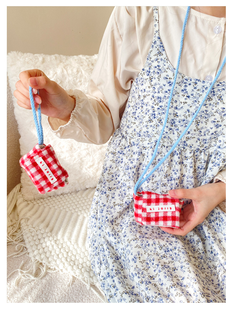 • 레드 체크 무늬 모직 헤드폰 가방 롱 로프 스타일
