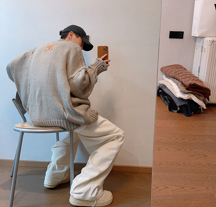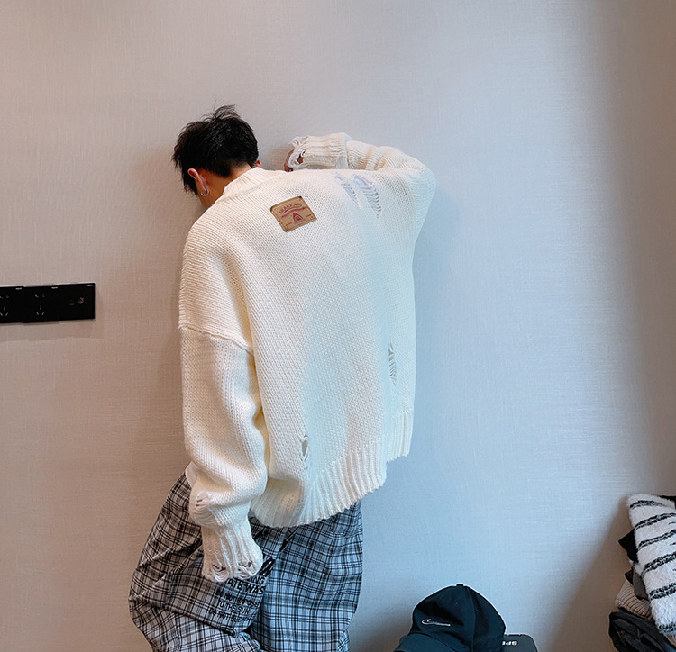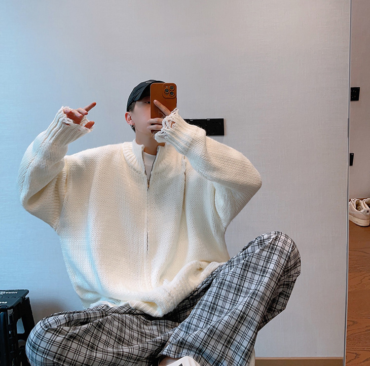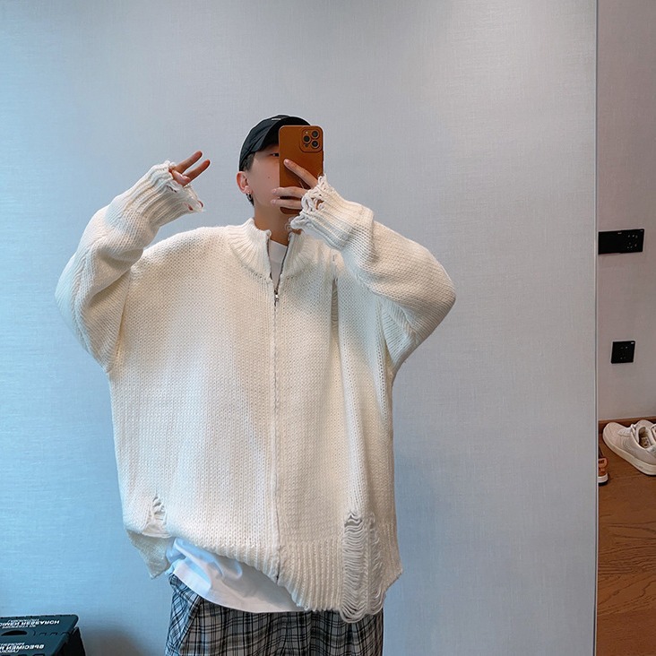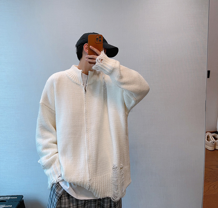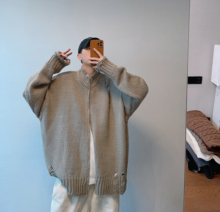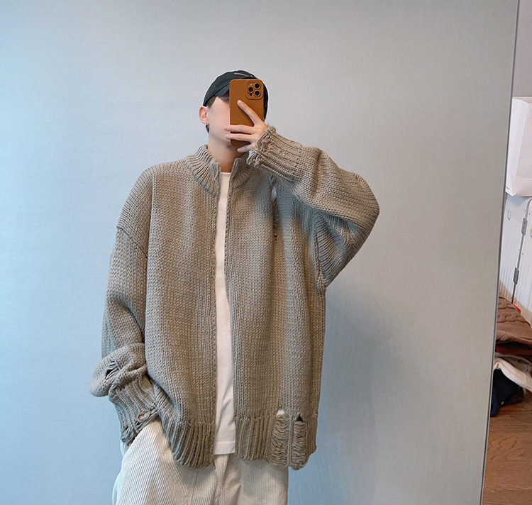 2024 한국 스타일 게으른 스타일 술 디자인 찢어진 카디건 스웨터 남성용 트렌디 브랜드 솔리드 컬러 중공 지퍼 니트 자켓스토어 가기