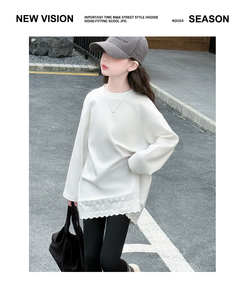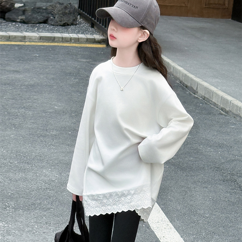 소녀 늦가을 기모 스웨터 중간 길이 한국 스타일 어린이 두꺼운 흰색 티셔츠 톱 9 큰 어린이 가을과 겨울베이스 셔츠