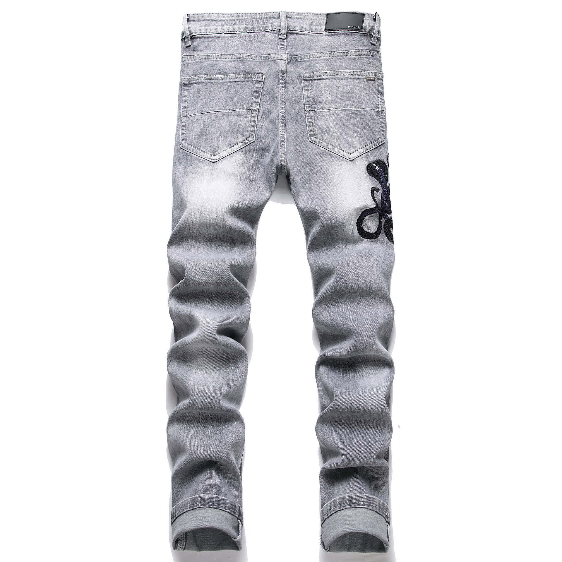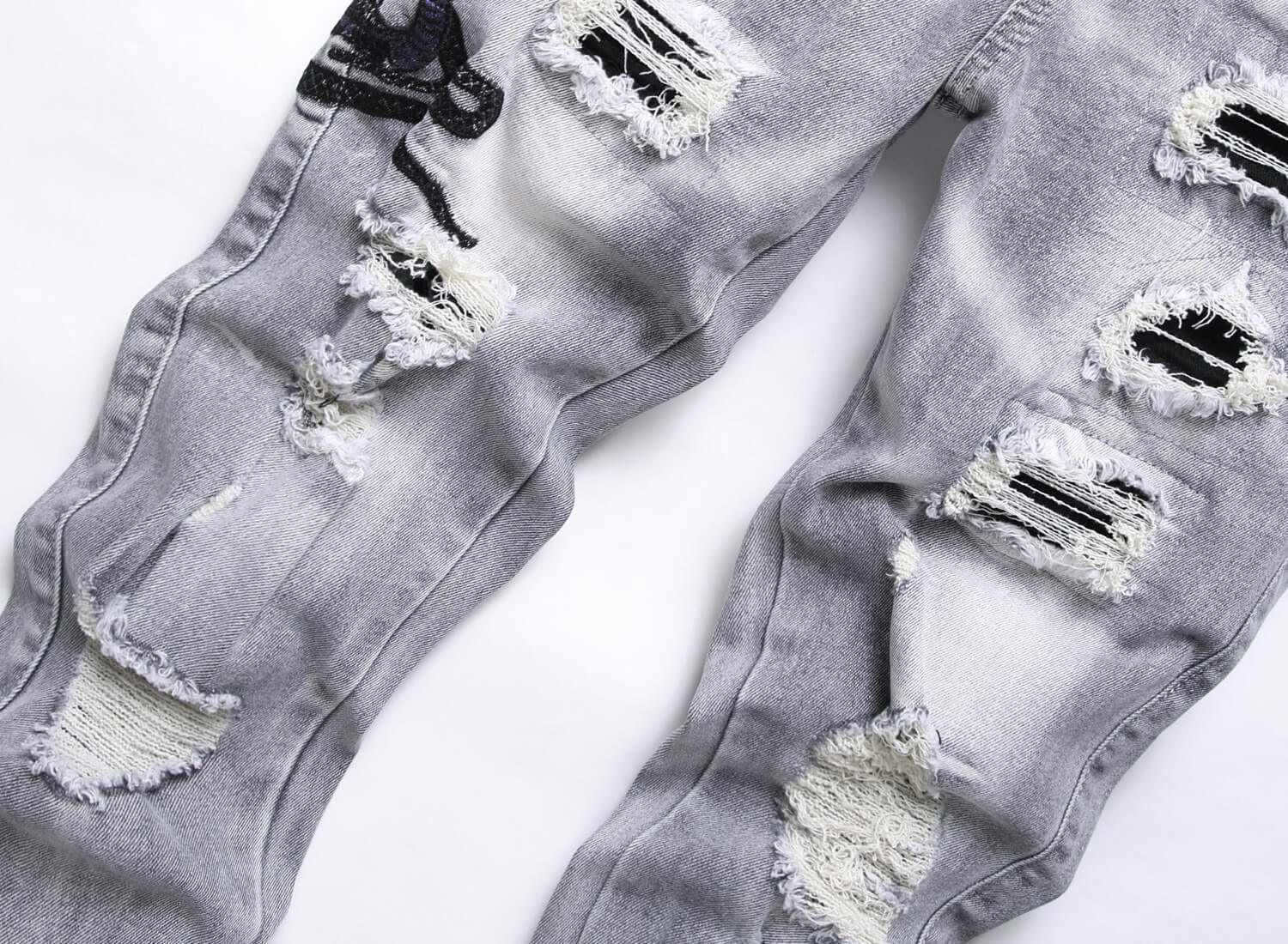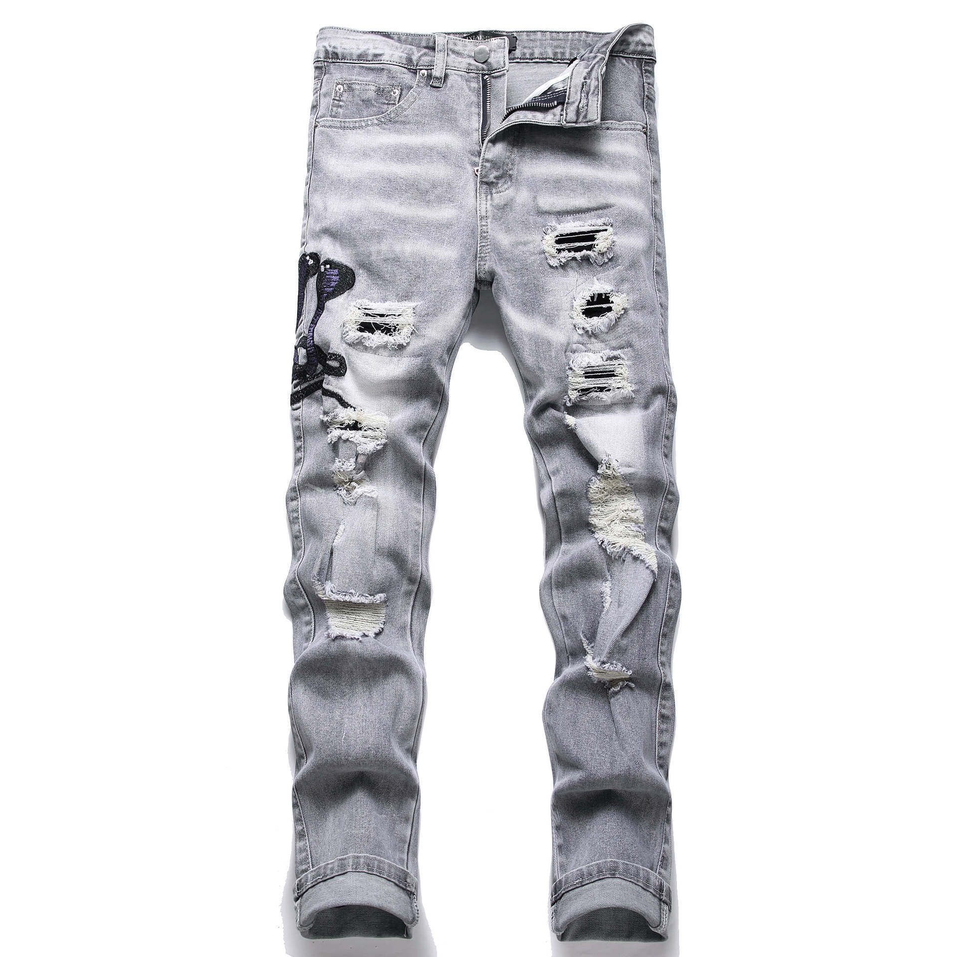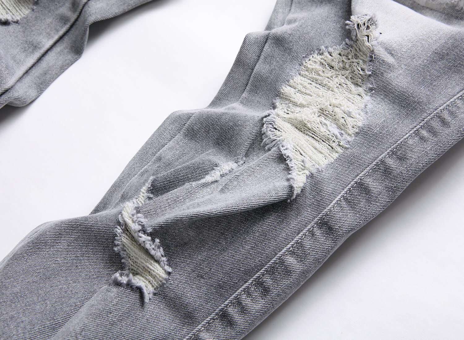 유럽 남성 라이트 블루 찢어진 청바지 남성 유행 스트레치 슬림 핏 작은 발 미국 스타일 하이 스트리트 롱 바지스토어 가기