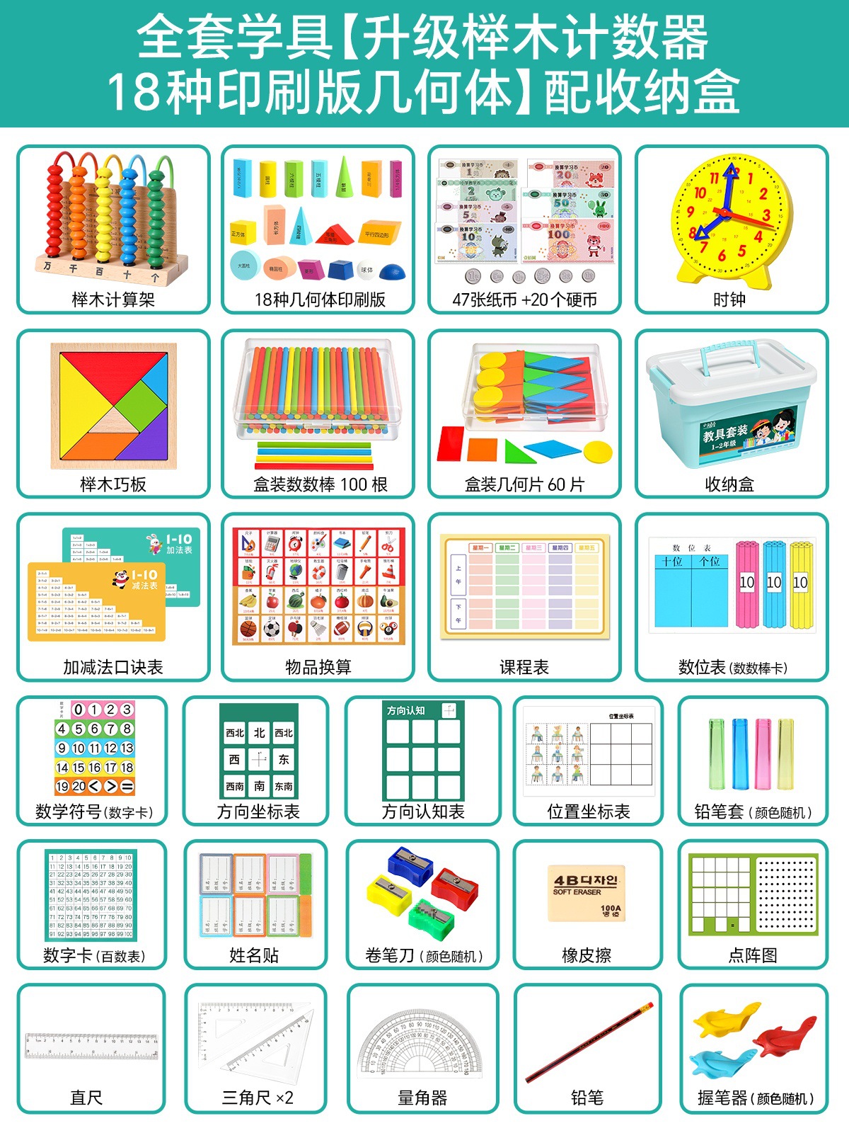• 학습 도구 전체 세트 [업그레이드된 너도밤나무 카운터 + 18가지 인쇄된 기하학] 보관함 포함