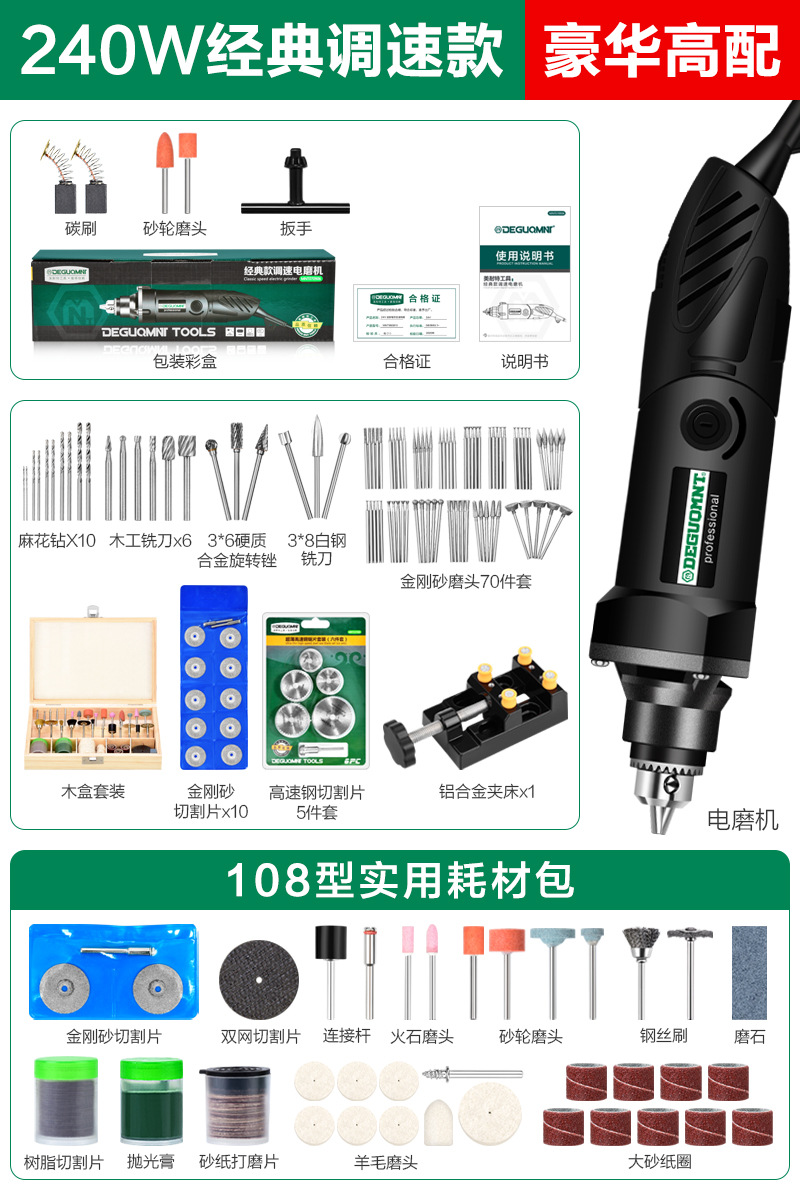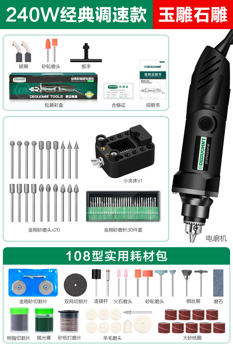 • [240W/6단 속도 조절/0.6-6.5 클램핑] 목각 및 코어 조각 + 무료 108 액세서리