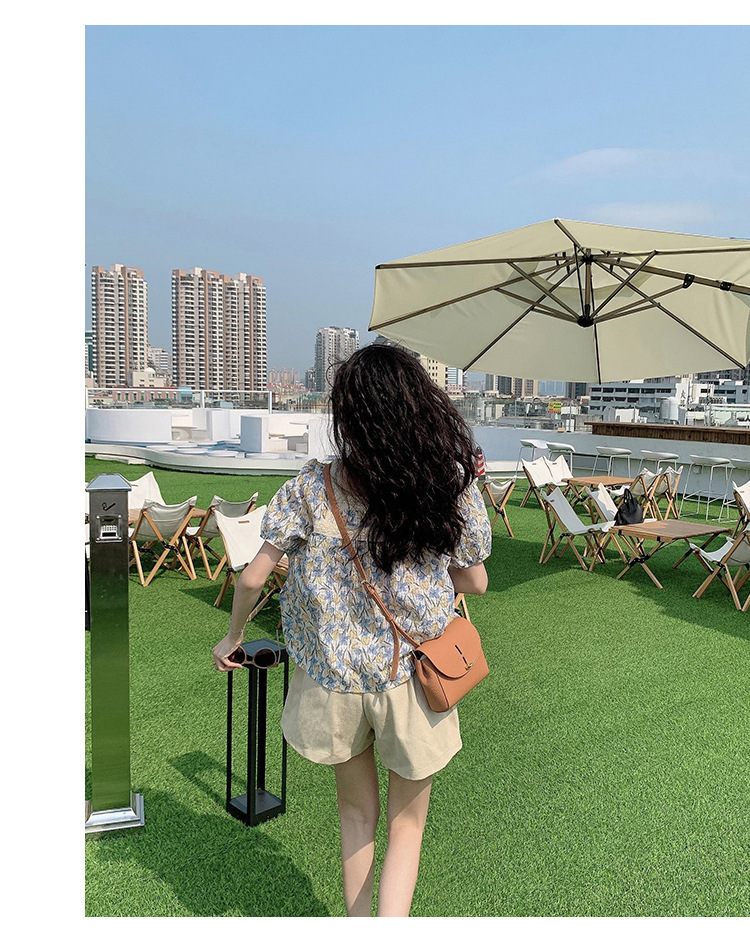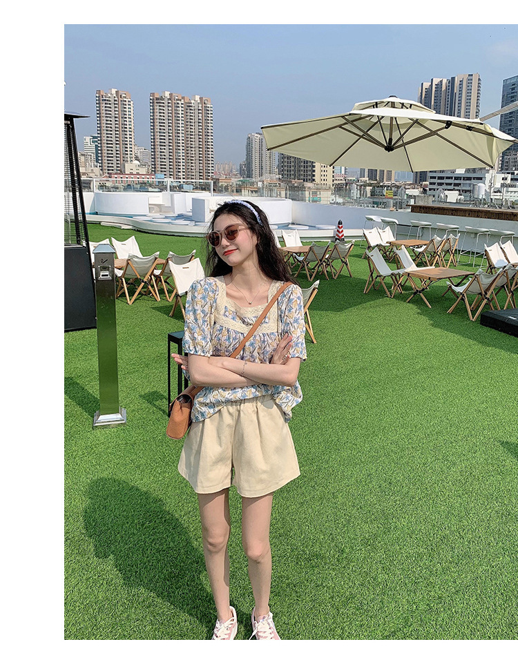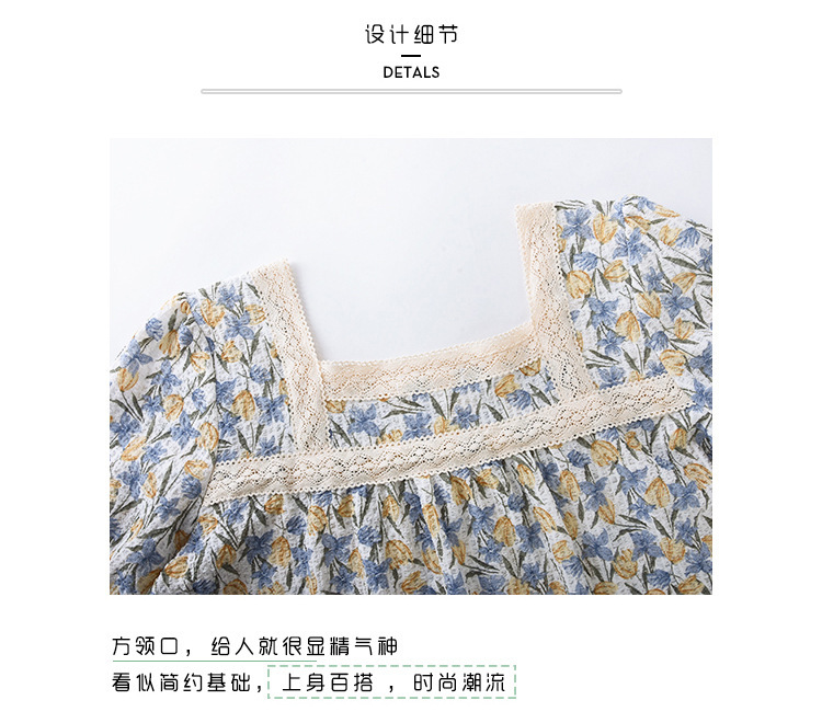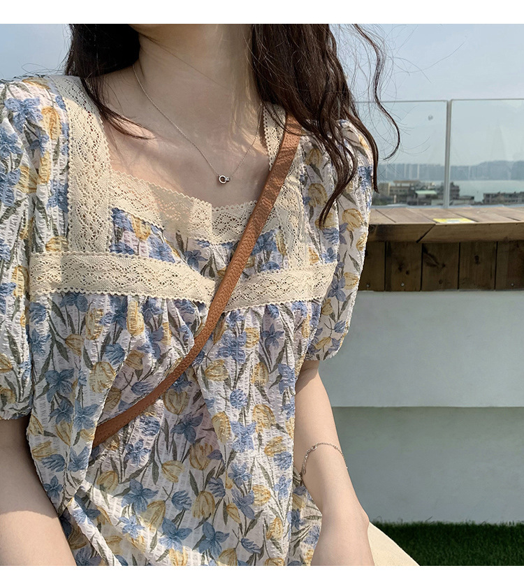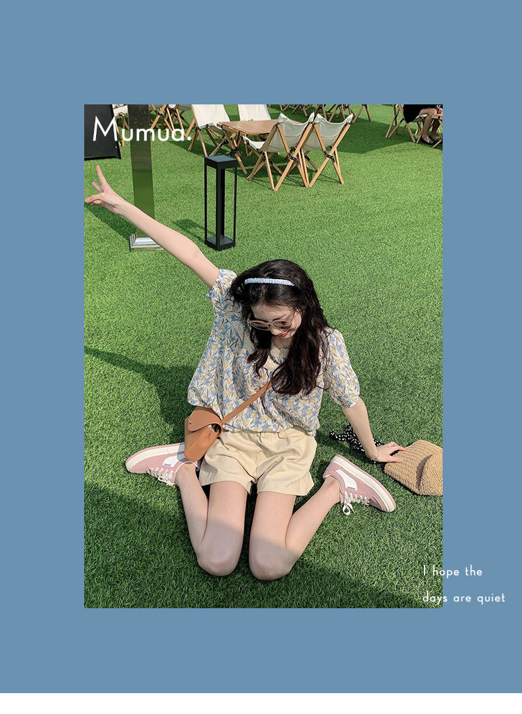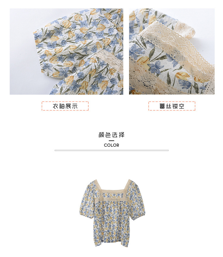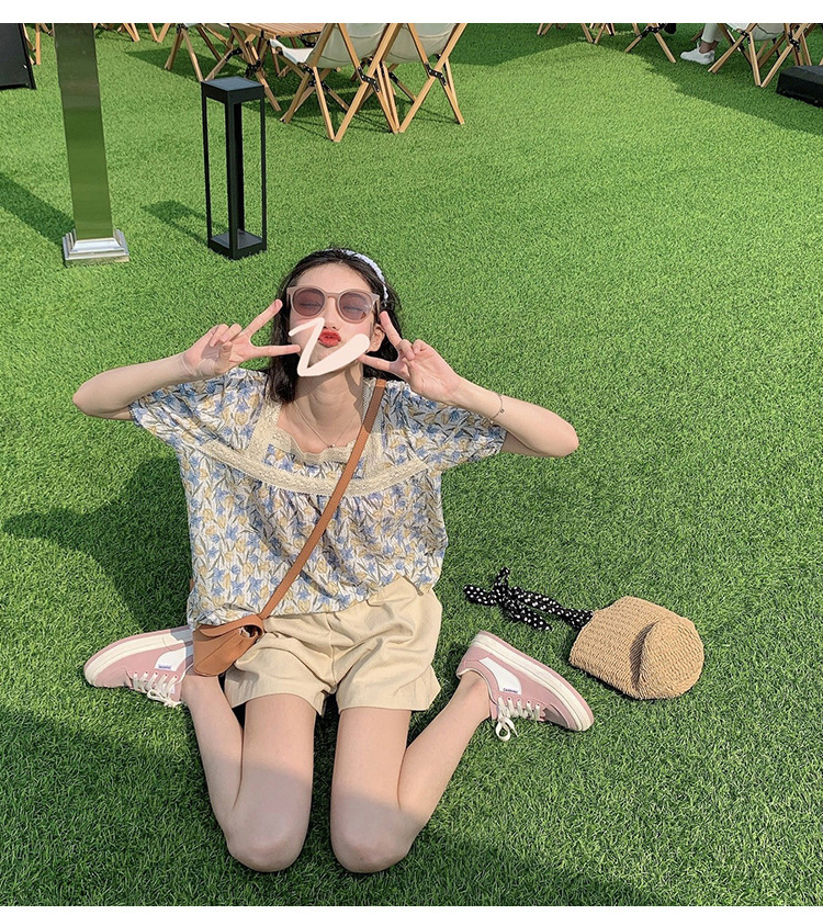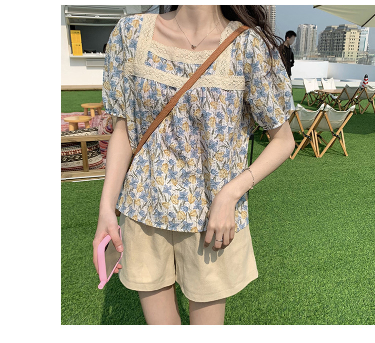 스퀘어 칼라 플로랄 탑 여성 디자인 센스 니쉬 셔츠 2023 여름 짧은 소매 한국 스타일 쉬폰 인형 셔츠스토어 가기