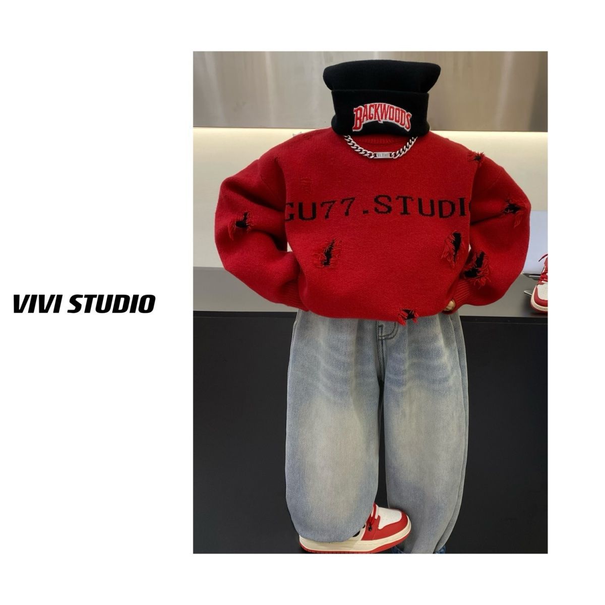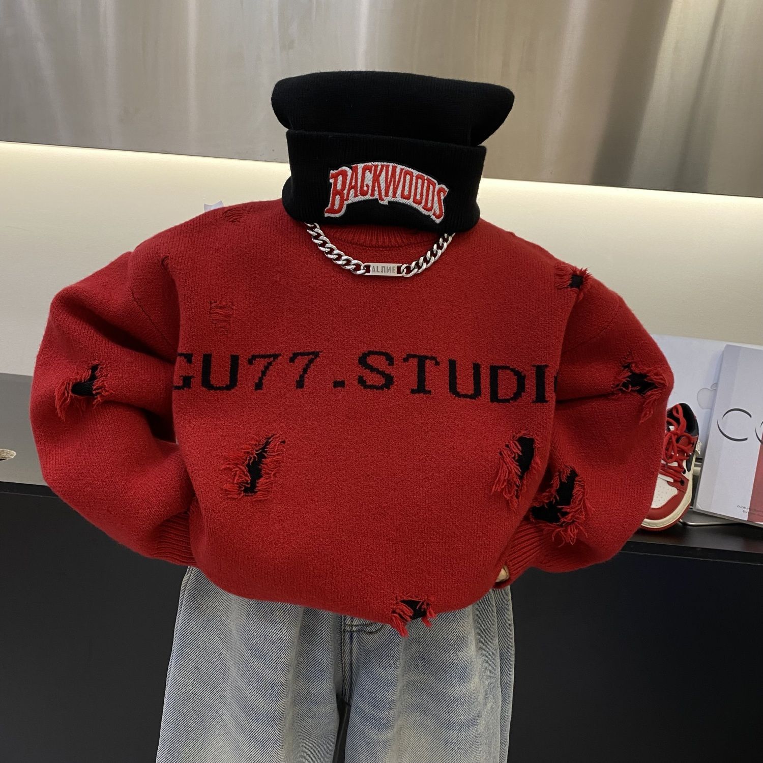 2024 년 겨울 새 한국식 아동복 구멍 중소형 어린이 편지 풀오버 스웨터 소년 어린이 탑 니트 셔츠스토어 가기