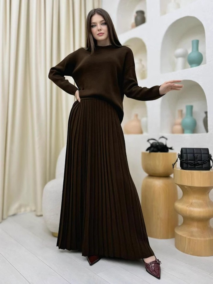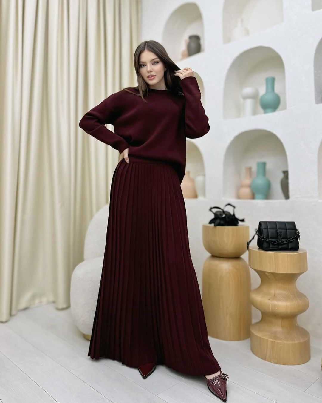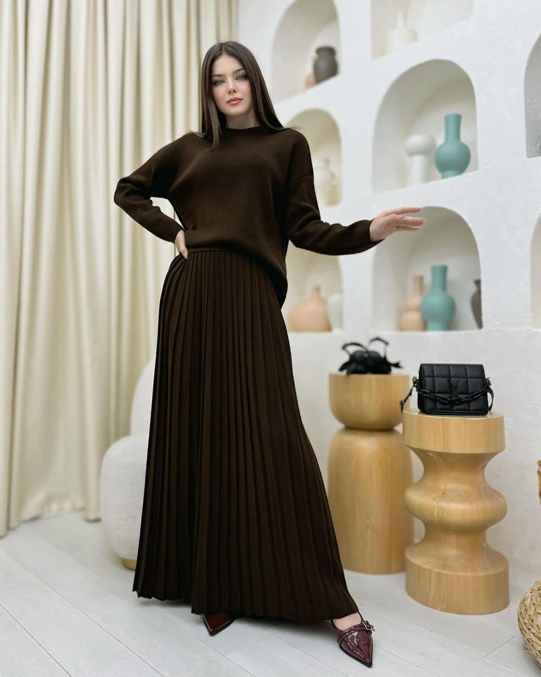 가을 겨울 신상 유럽풍 해외 무역 고급스러운 단색 라운드넥 니트 풀오버 스커트 세트