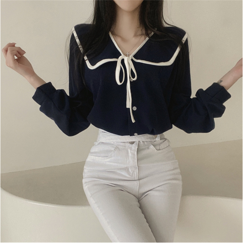 2024 한국의 세련된 봄과 가을 새로운 인형 칼라 레이스 업 랜턴 소매 셔츠 여성용 내외형 단색 셔츠스토어 가기