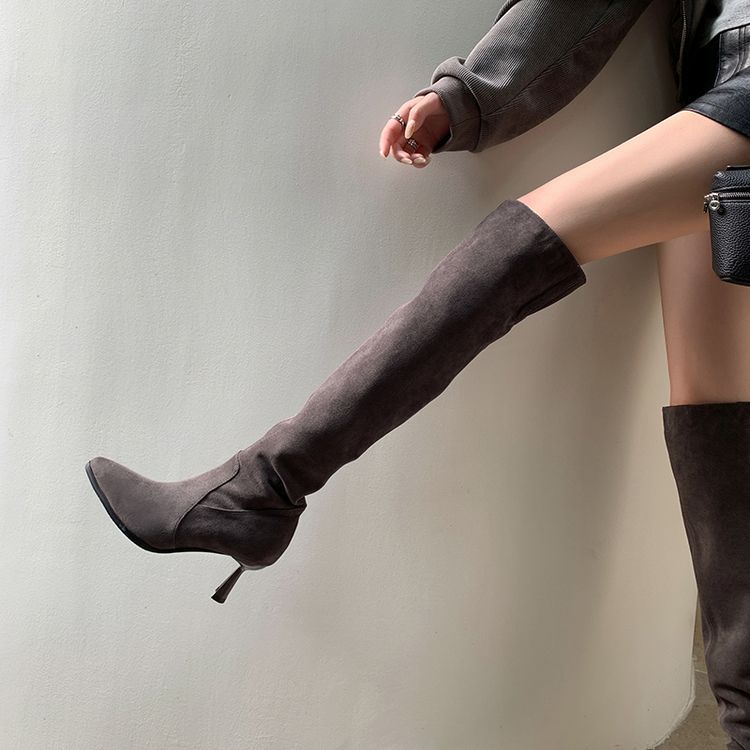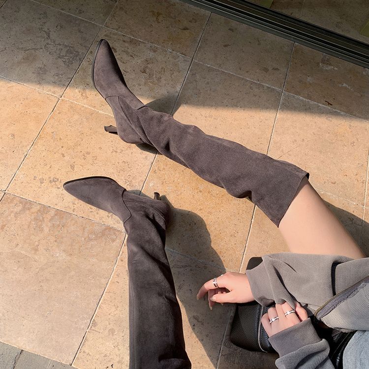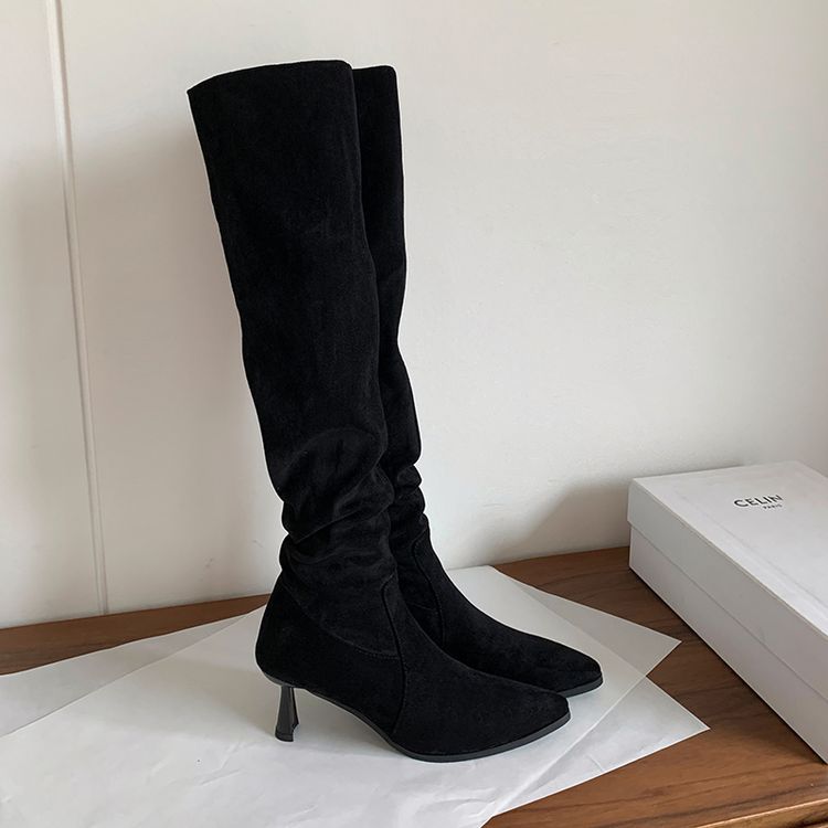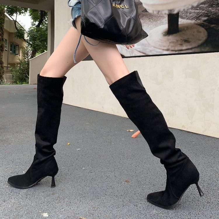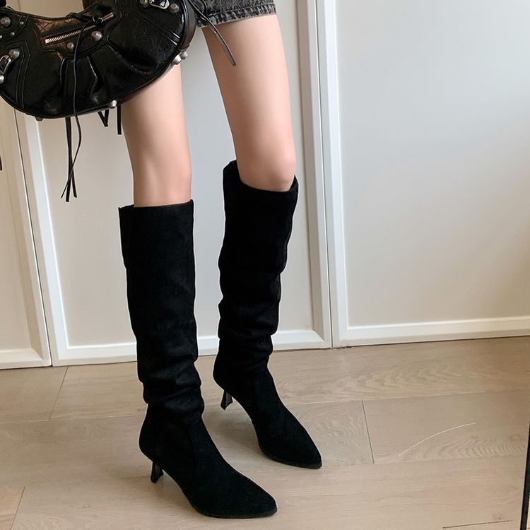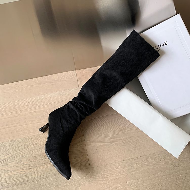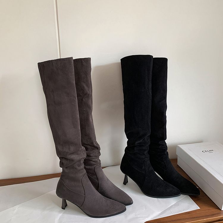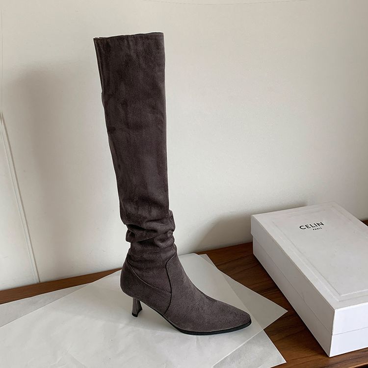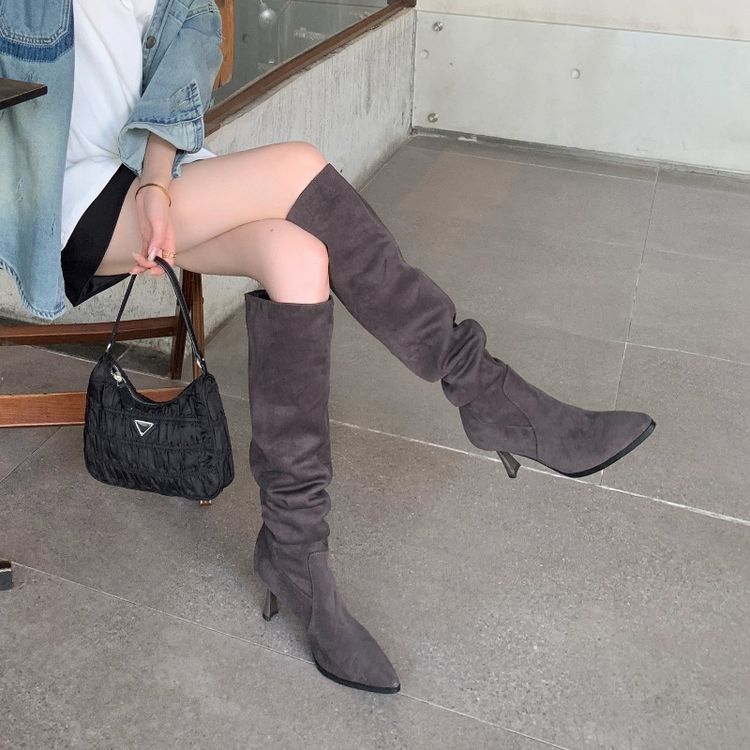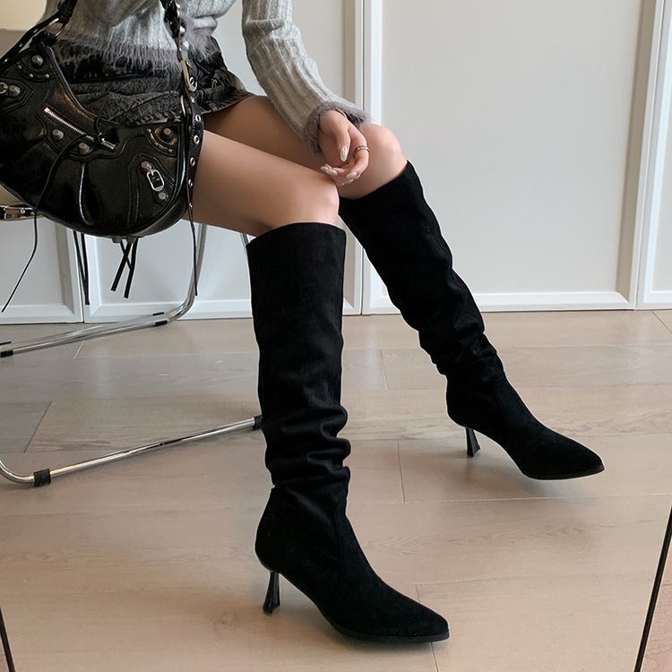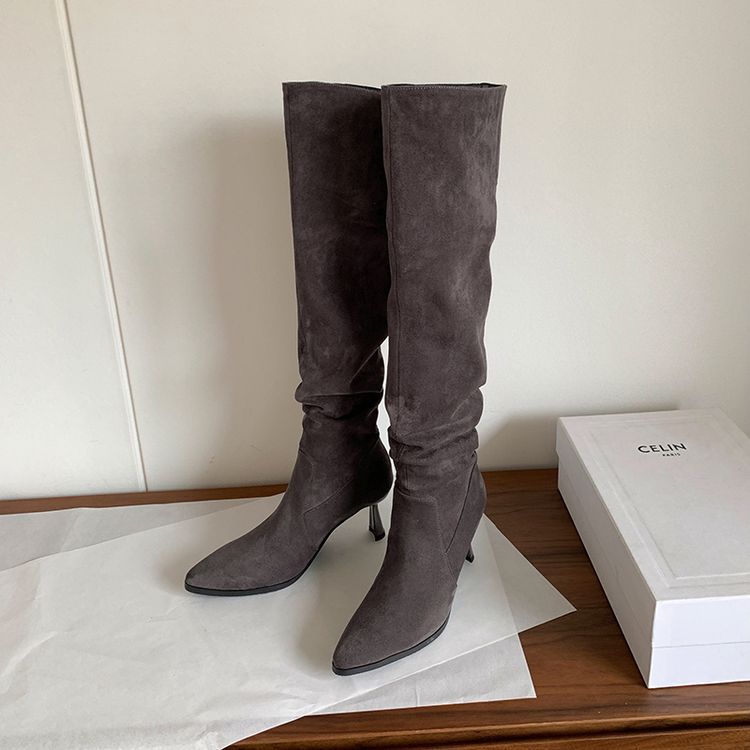 스파이스 걸 우아한 하이힐 포인팅 헤드 슬리밍 올 매치 힙 부츠 여자 2024 가을 겨울 뉴 스웨이드 얇은 힐 부츠스토어 가기