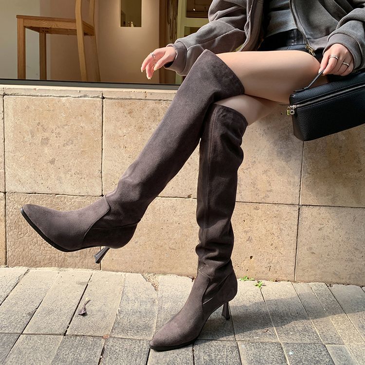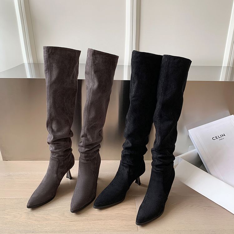스파이스 걸 우아한 하이힐 포인팅 헤드 슬리밍 올 매치 힙 부츠 여자 2024 가을 겨울 뉴 스웨이드 얇은 힐 부츠