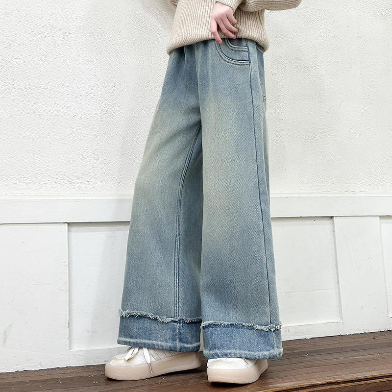소녀 데님 넓은 다리 바지 2025 봄과 가을 새로운 큰 어린이 유행 서양식 한국 기모 두꺼운 느슨한 다리 바지