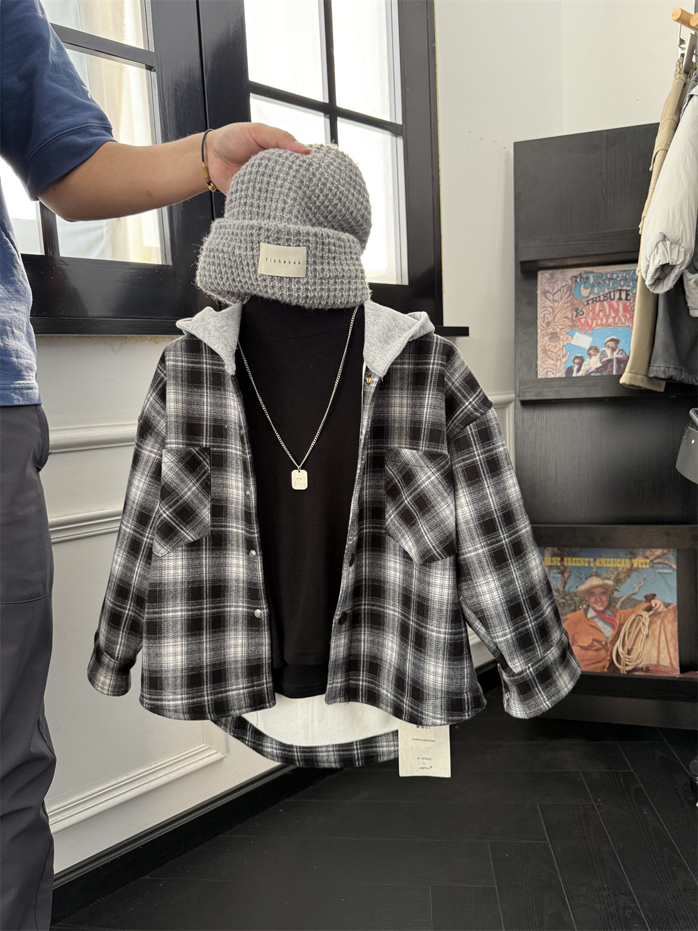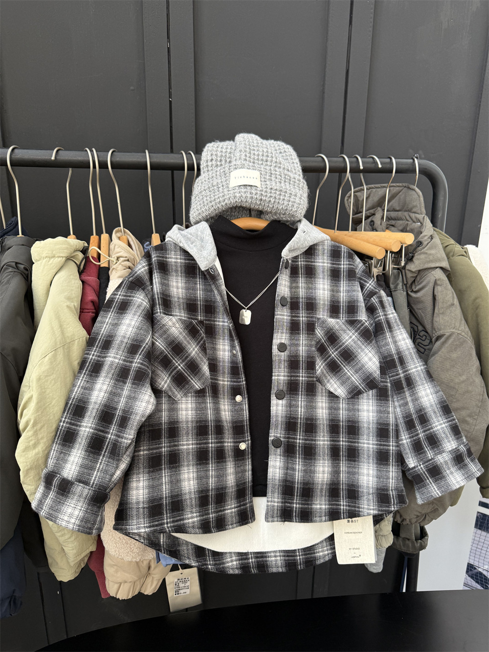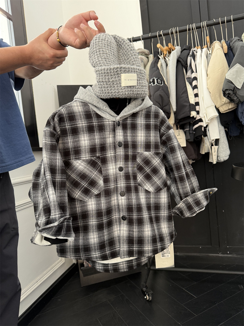 2024 겨울 어린이 미국 가짜 투피스 기모 격자 무늬 셔츠 소년의 트렌디 한 쿨 느슨한 원피스 벨벳 두꺼운 재킷스토어 가기