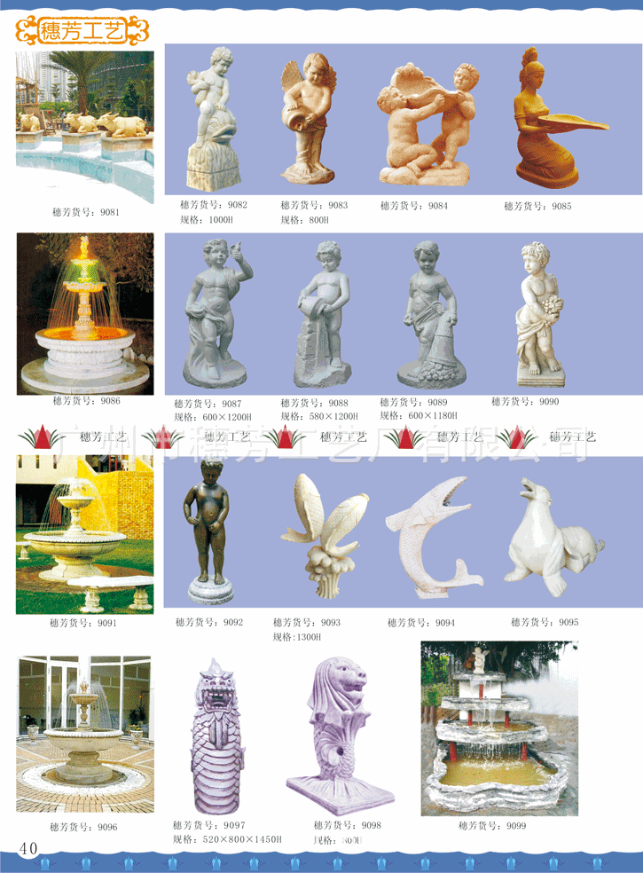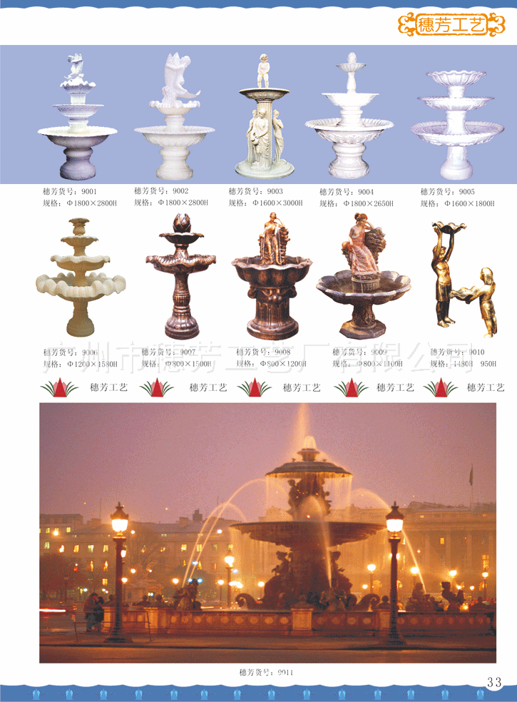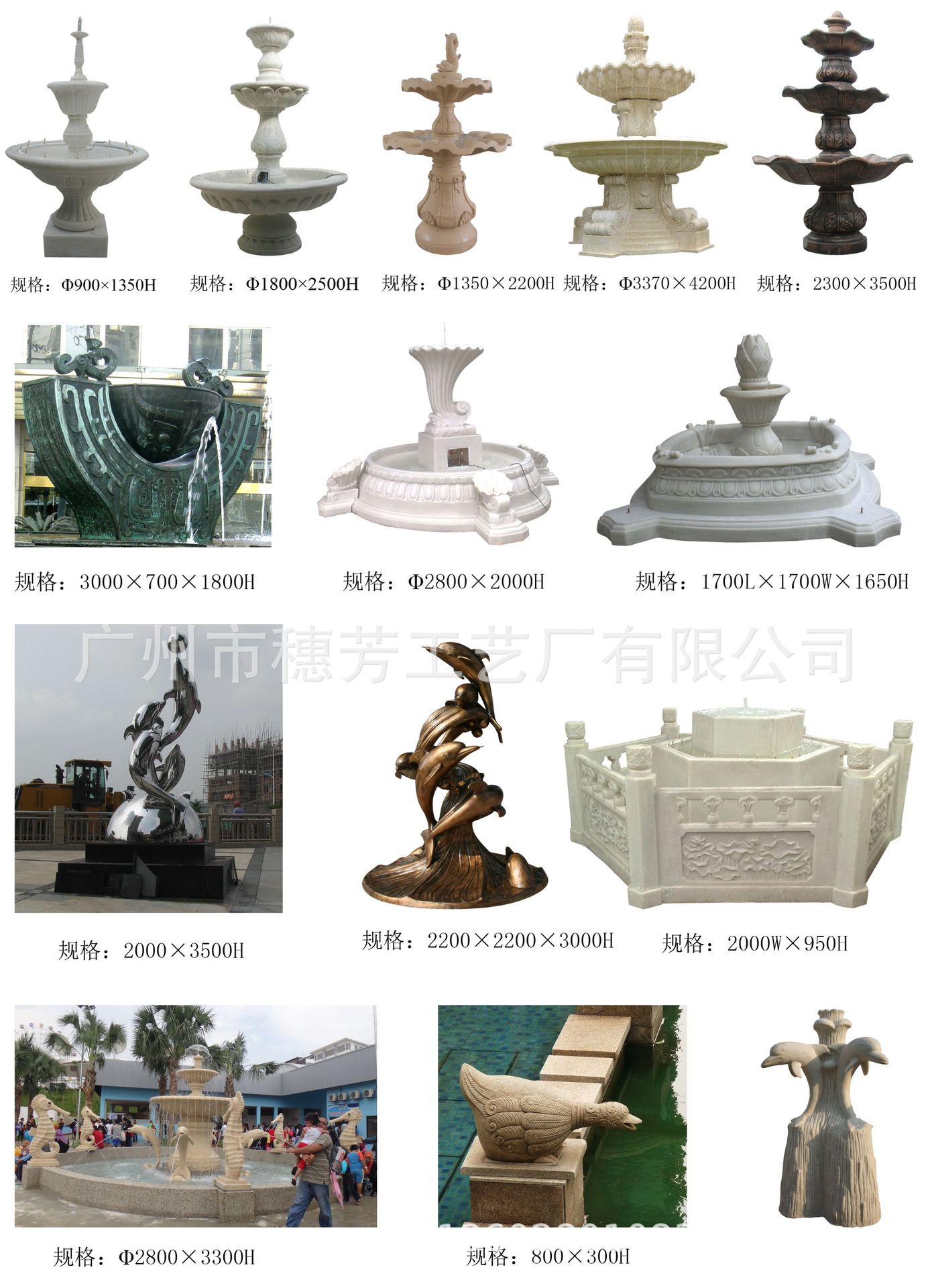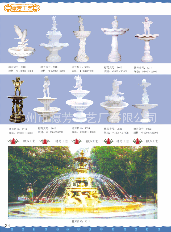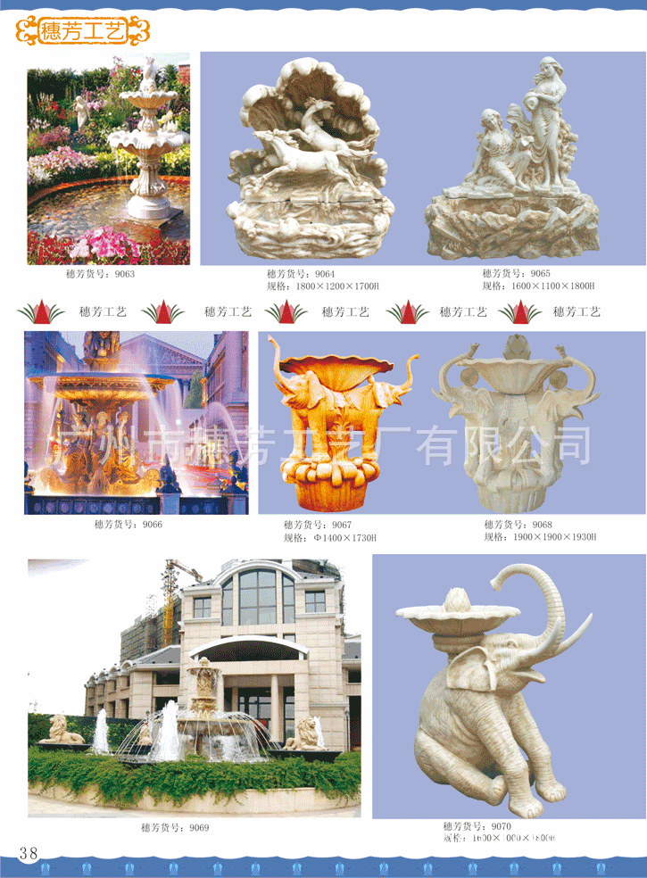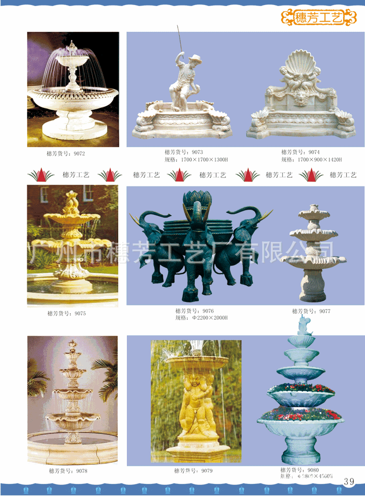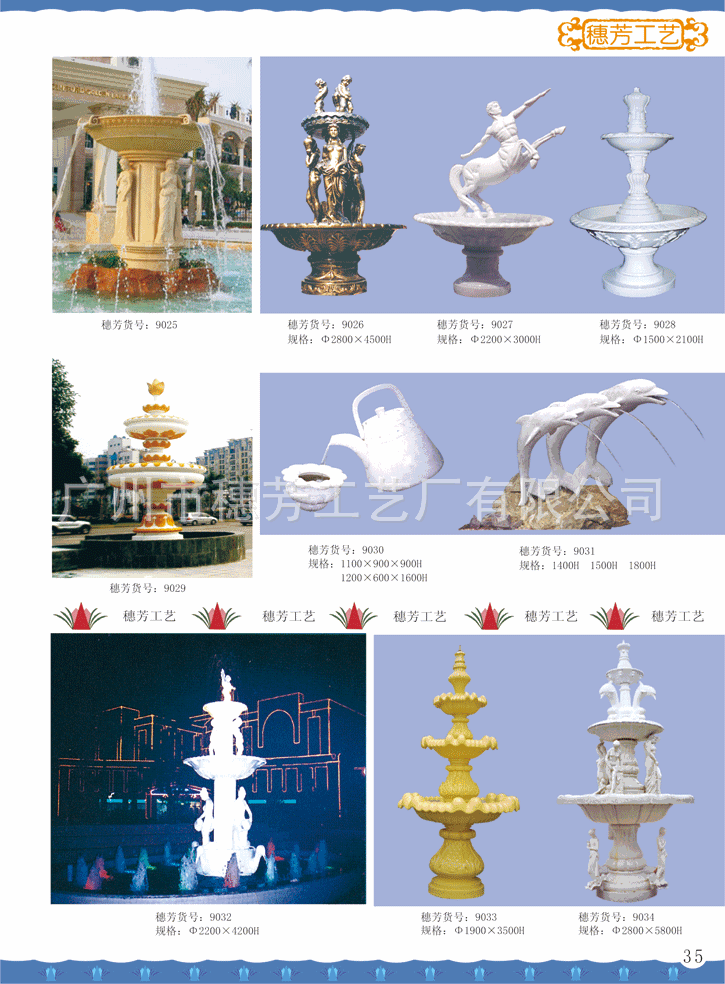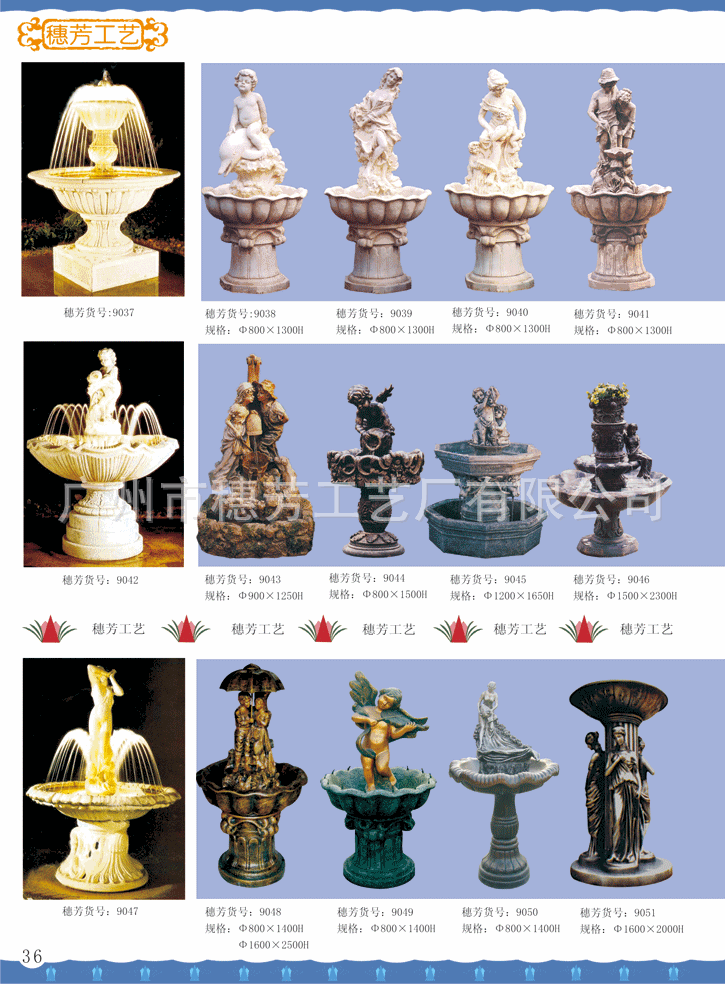广州市穗芳工艺厂有限公司专业生产玻璃钢和人造砂岩喷泉,欧式喷泉,水景雕塑,欧式人物喷泉,花园喷泉,酒店喷泉,广场大喷泉,砂岩喷泉雕塑,海豚喷泉,怪鱼出水,箭鱼喷泉,钓鱼喷泉,大象喷泉,海马喷水,怪鱼出水,青蛙喷水,鲤鱼喷泉,天鹅喷泉,孔雀喷泉,海螺出水,狮头出水,鱼尾狮喷泉雕塑,室内挂式喷泉,靠墙流水喷泉,流水喷泉,水池喷泉等,材质:可采用/玻璃钢/透明树脂材料/水晶砂岩/黄砂岩/仿汉白玉制作