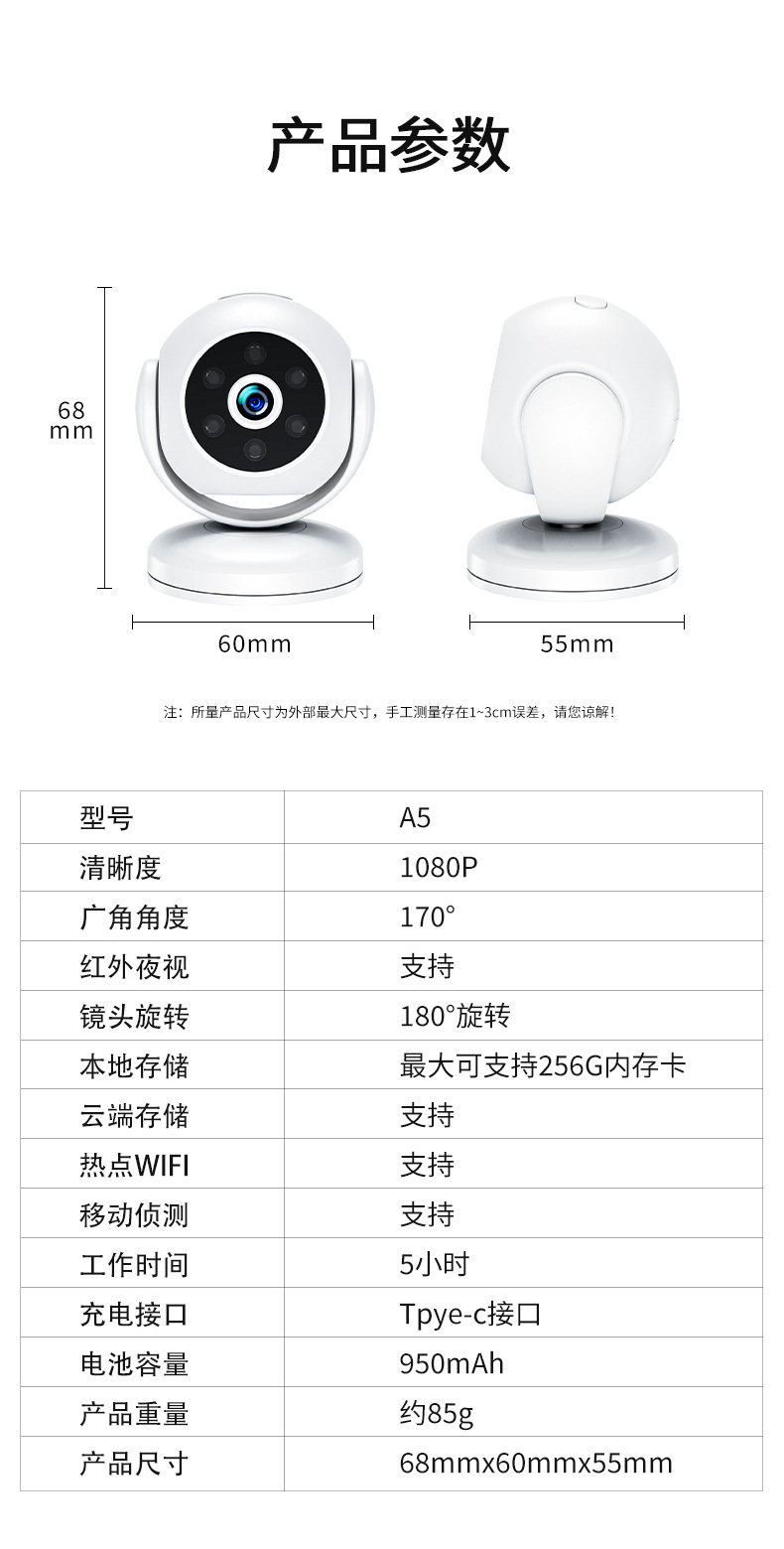 A5 무선 소형 카메라 1080 HD 광각 적외선 나이트 비전 보안 모니터링 마그네틱 브래킷 펀치 무료 카메라스토어 가기