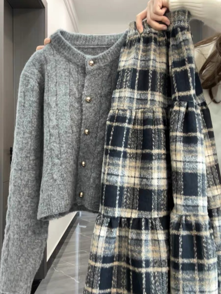 플러스 사이즈 가을과 겨울 세트 여성 2024 새로운 통통녀 패션 작은 스타일 스웨터 카디건 스커트 슬림 투피스 세트