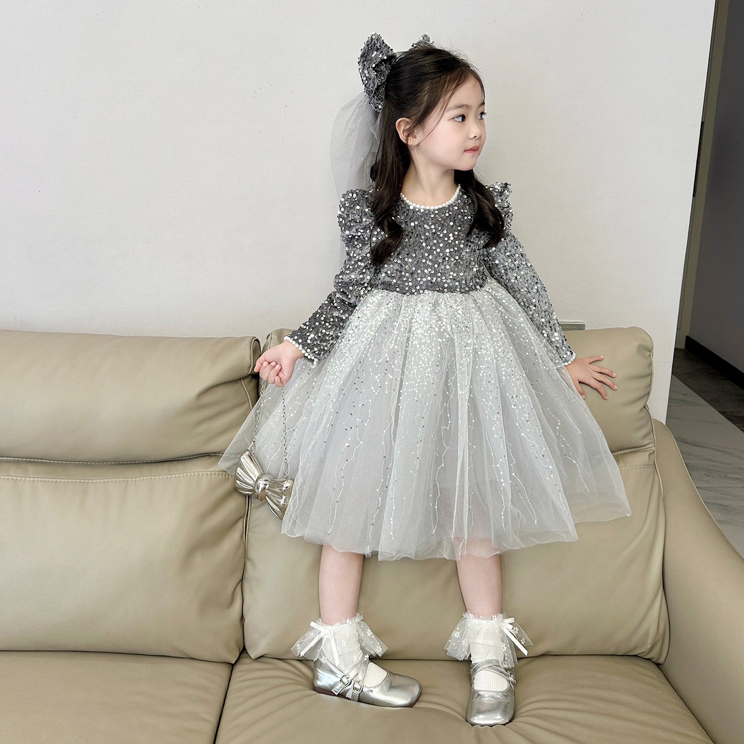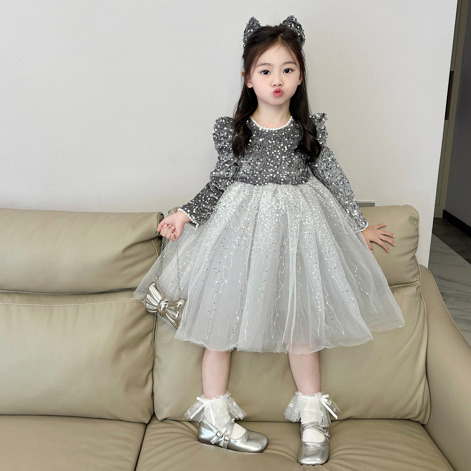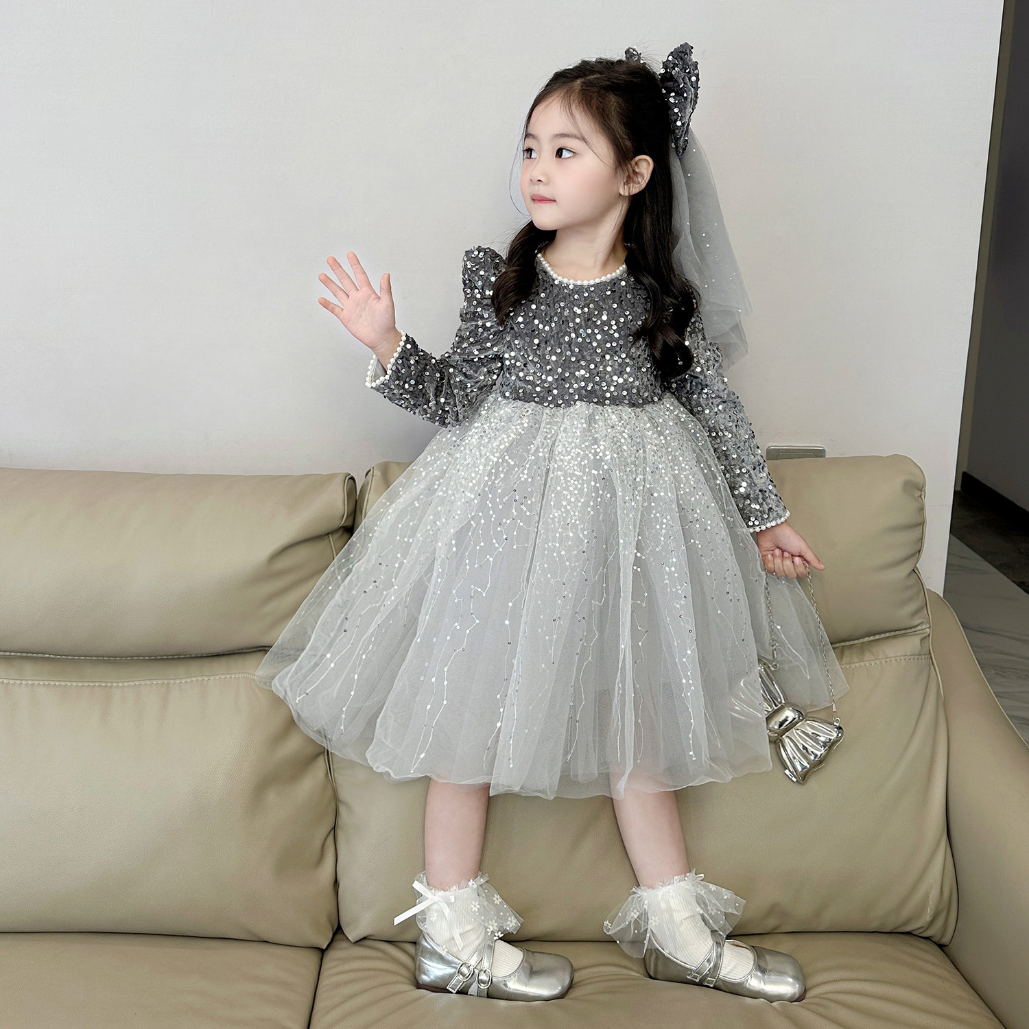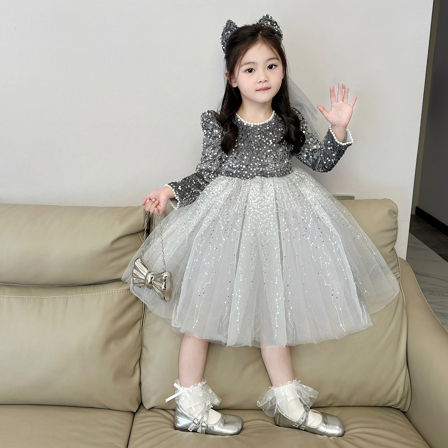 여아 벨벳 스팽글 망사 드레스 2025 가을 겨울 신상 아동용 플러스 벨벳 반짝이 공주 드레스스토어 가기
