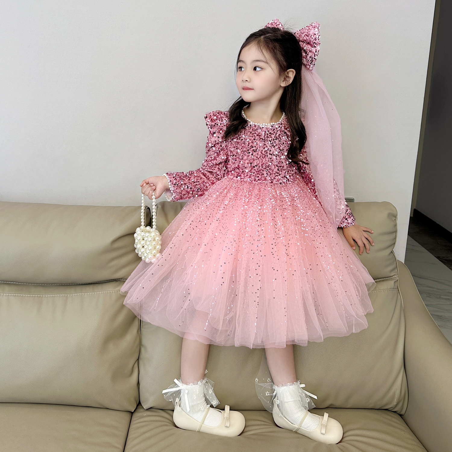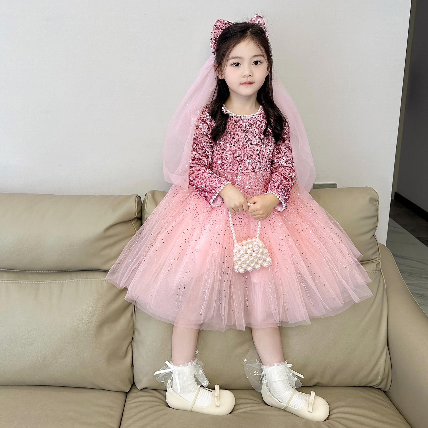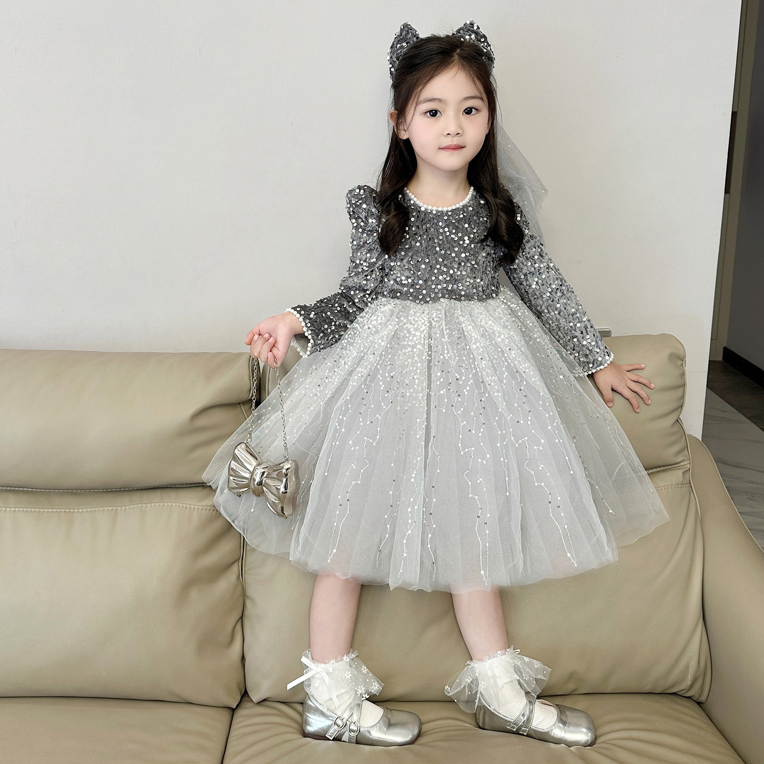 여아 벨벳 스팽글 망사 드레스 2025 가을 겨울 신상 아동용 플러스 벨벳 반짝이 공주 드레스스토어 가기
