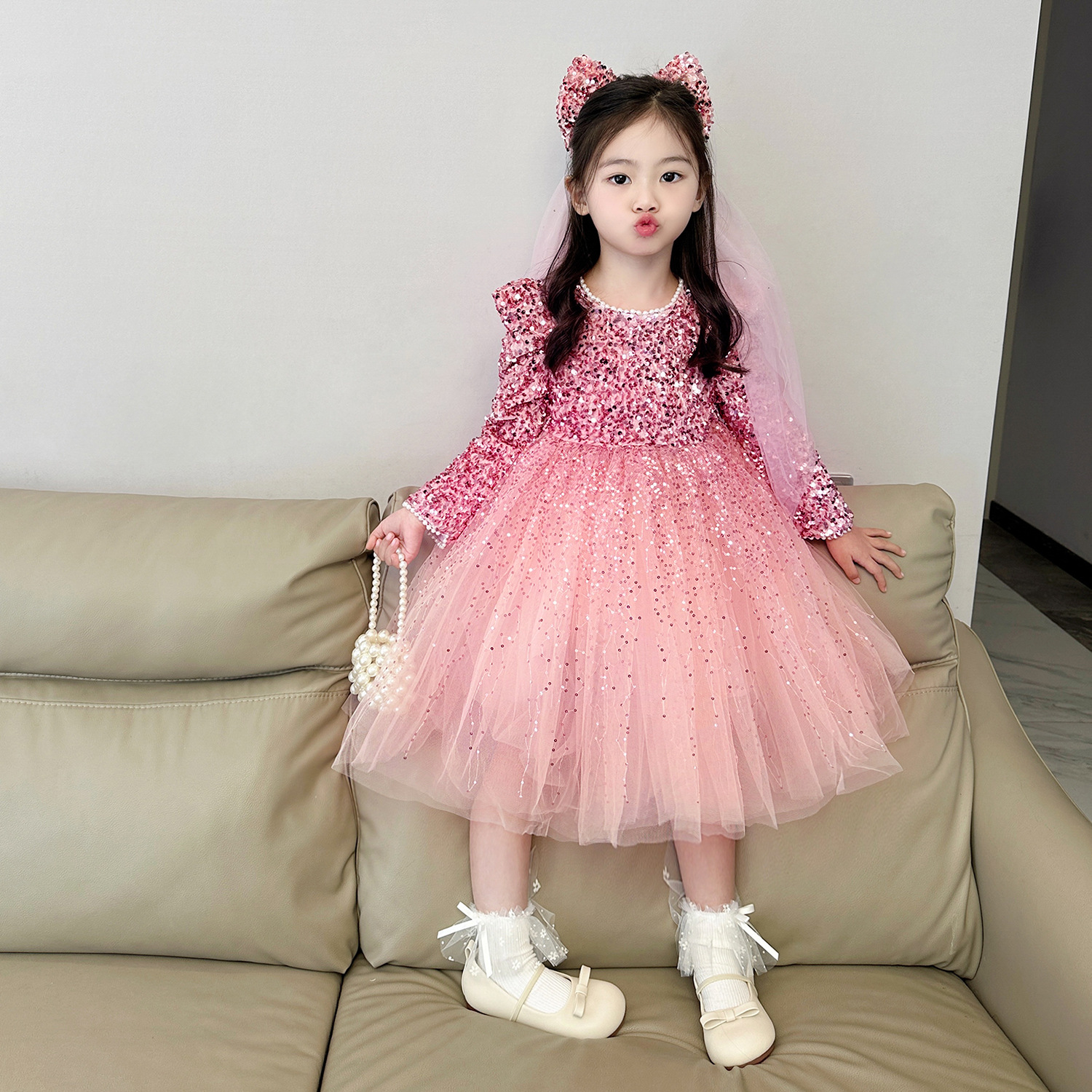 여아 벨벳 스팽글 망사 드레스 2025 가을 겨울 신상 아동용 플러스 벨벳 반짝이 공주 드레스