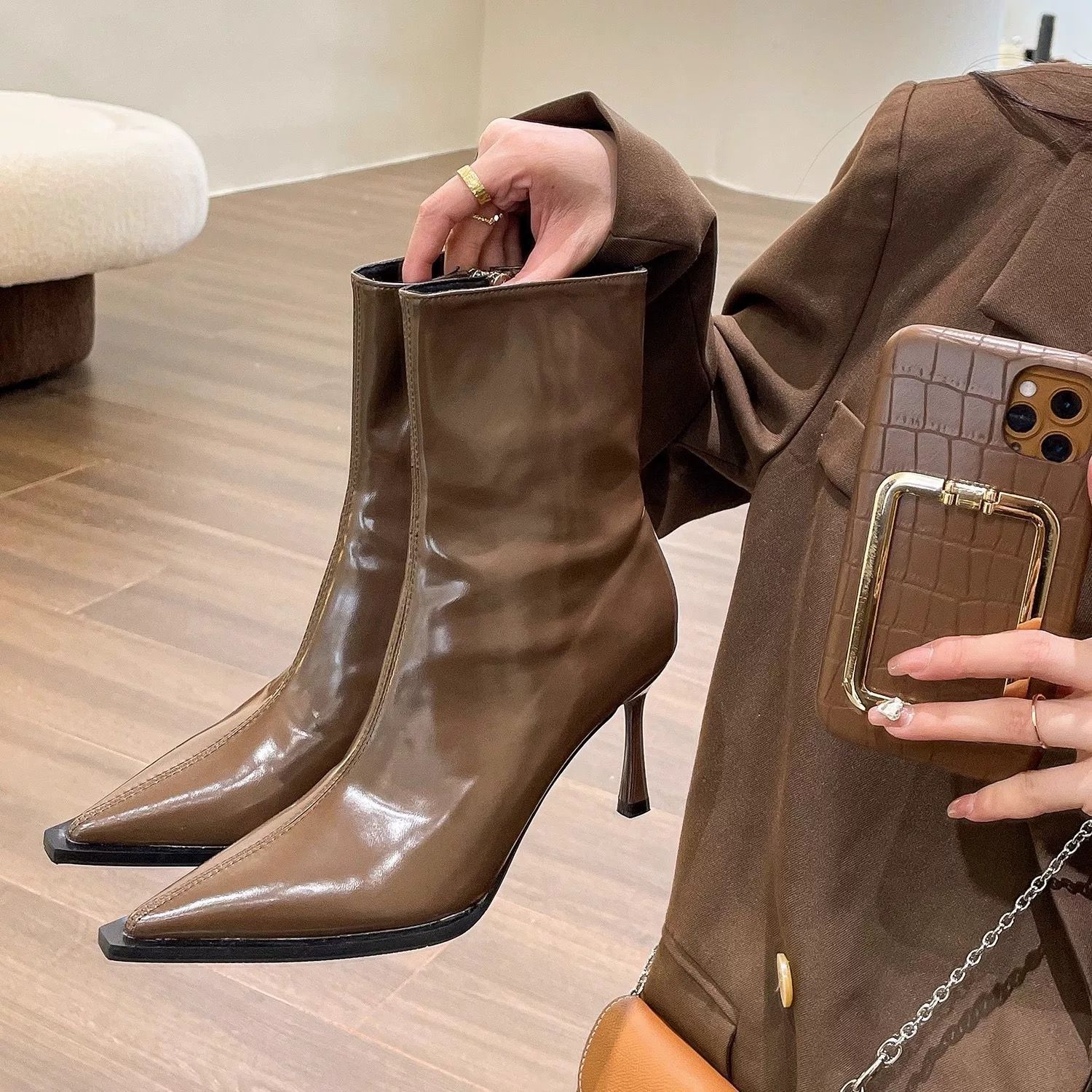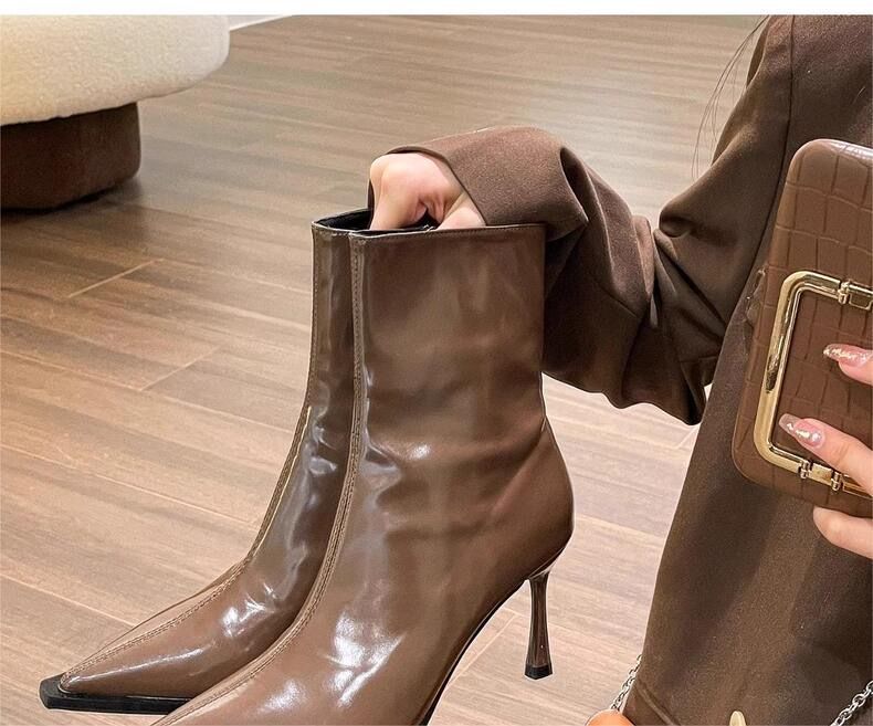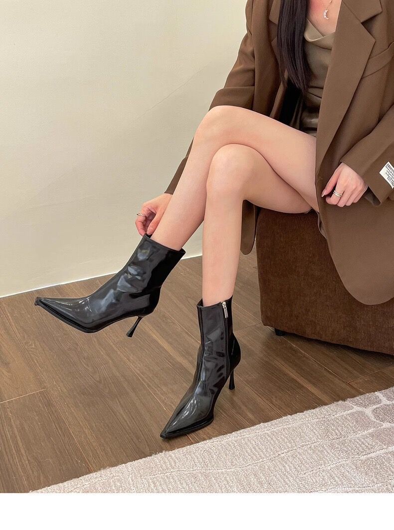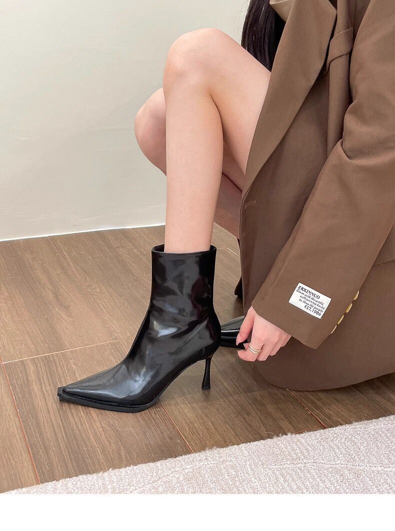 뾰족한 하이힐 부츠 여성용 얇은 힐 2024 가을 및 겨울 새로운 우아한 특허 가죽 알몸 부츠 얇은 부츠 짧은 부츠 빈티지 가죽 부츠스토어 가기