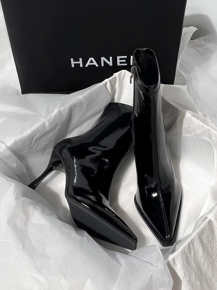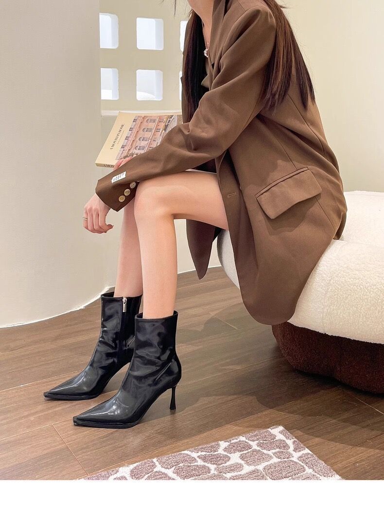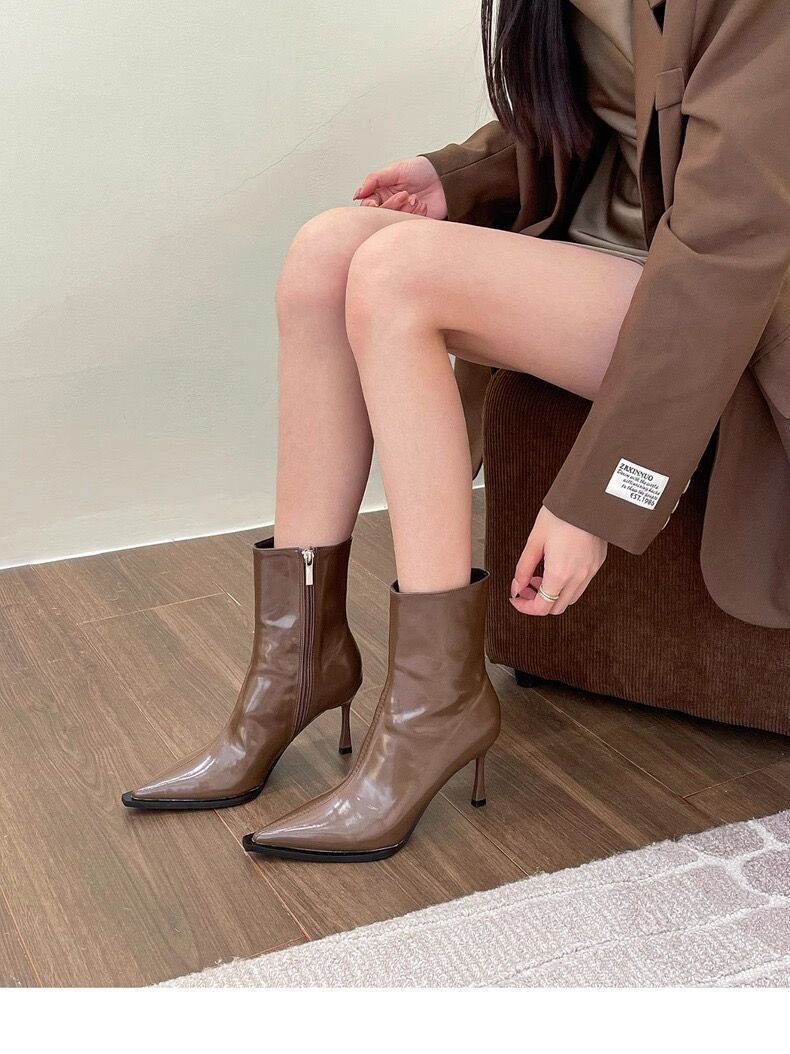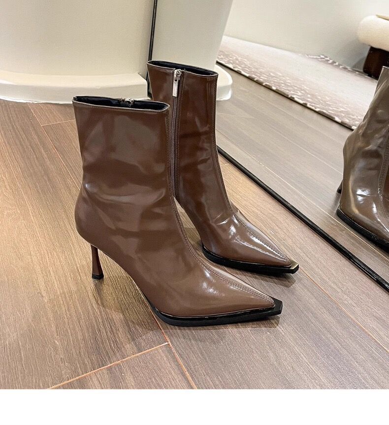 뾰족한 하이힐 부츠 여성용 얇은 힐 2024 가을 및 겨울 새로운 우아한 특허 가죽 알몸 부츠 얇은 부츠 짧은 부츠 빈티지 가죽 부츠스토어 가기