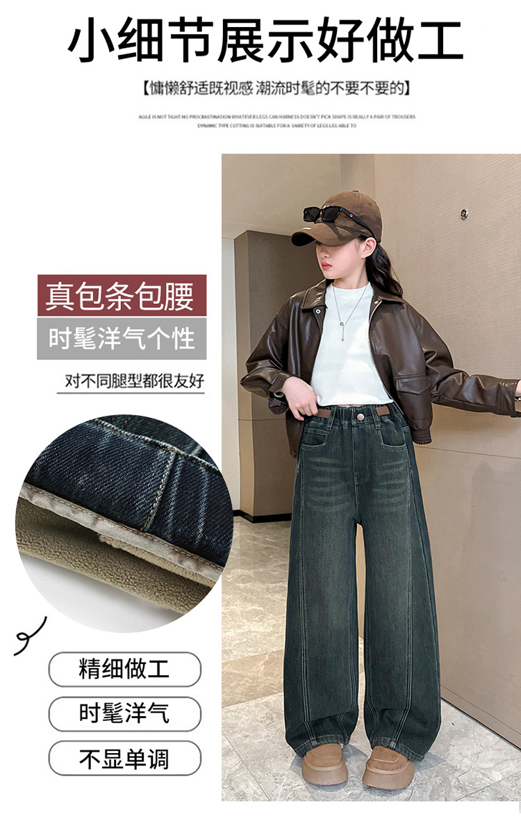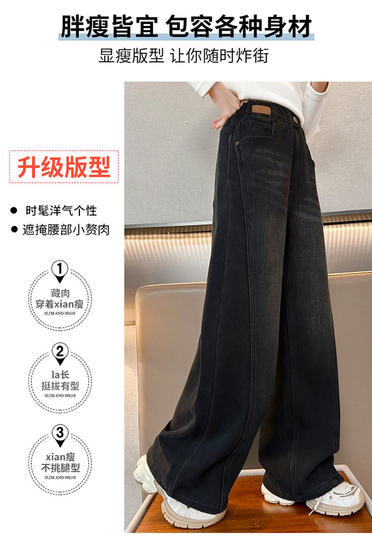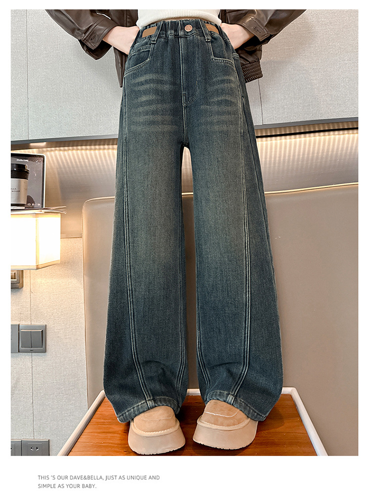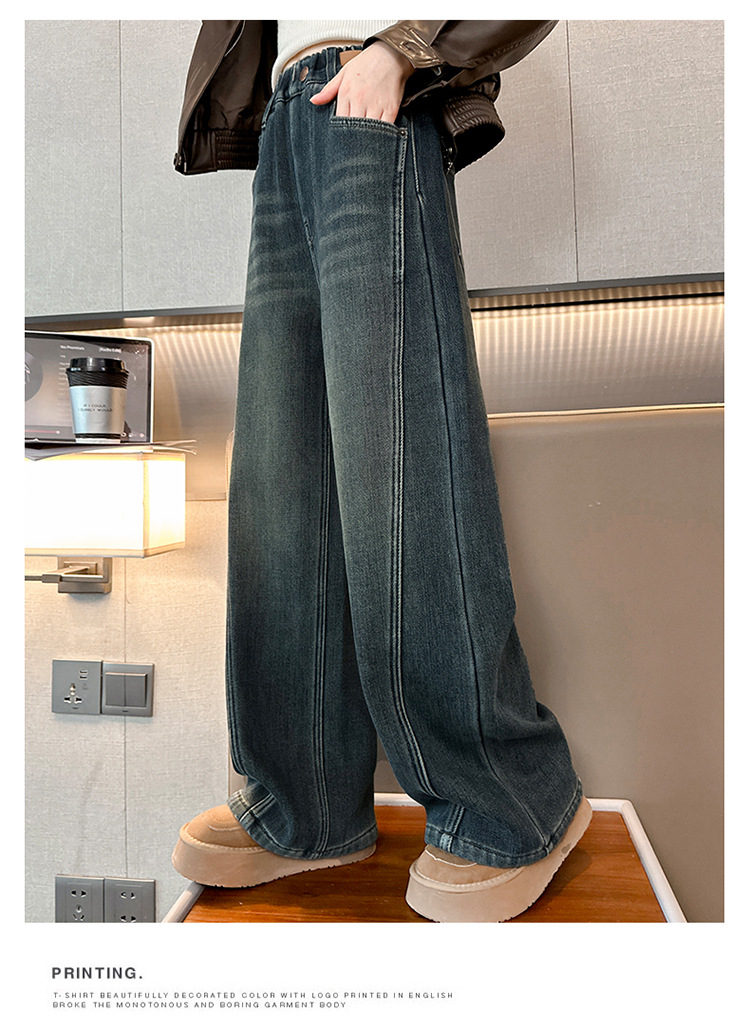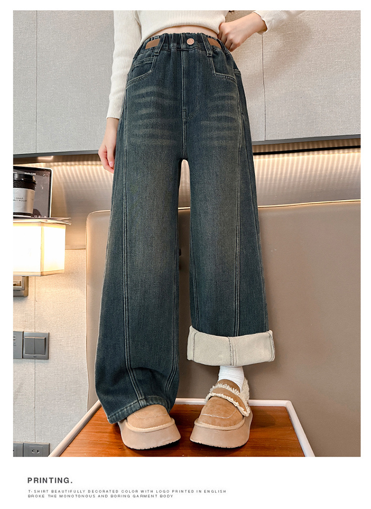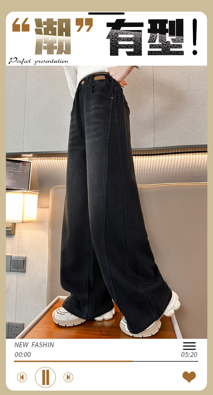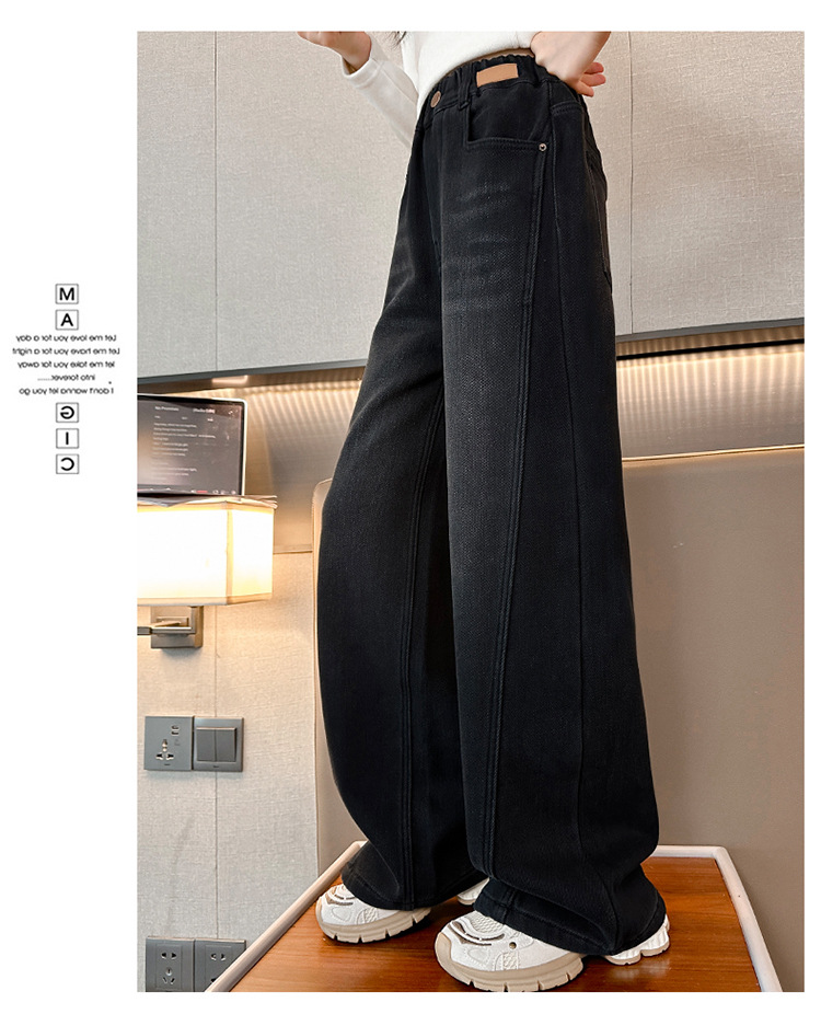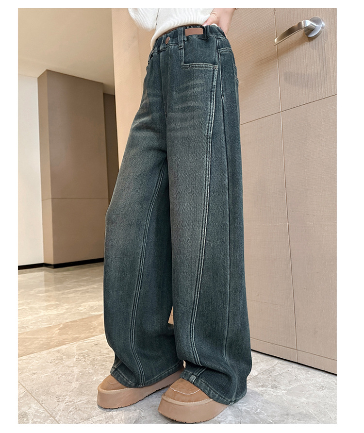 소녀 기모 청바지 2024 새로운 어린이 겨울 스트레이트 와이드 레그 바지 두꺼운 원피스 벨벳 마체 테 바지스토어 가기