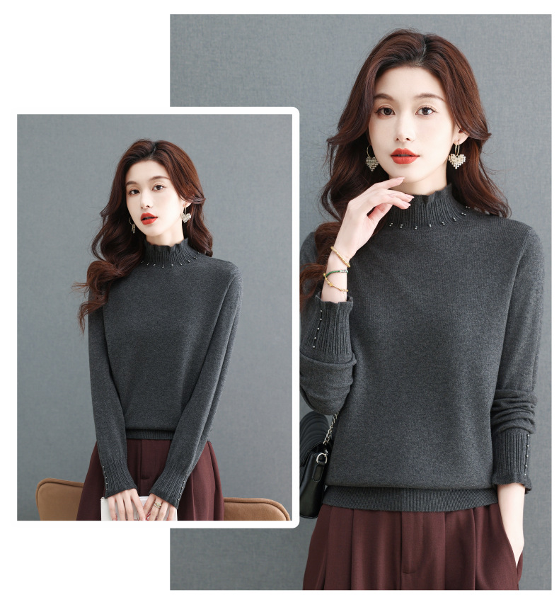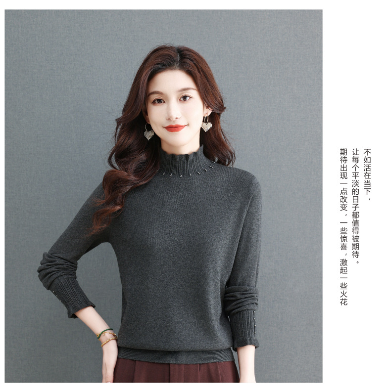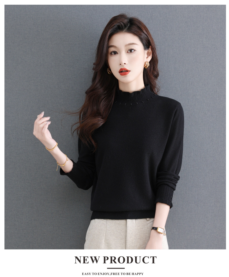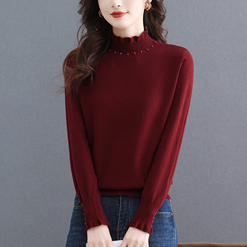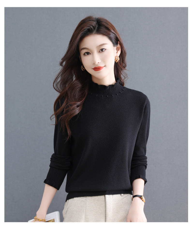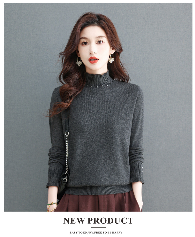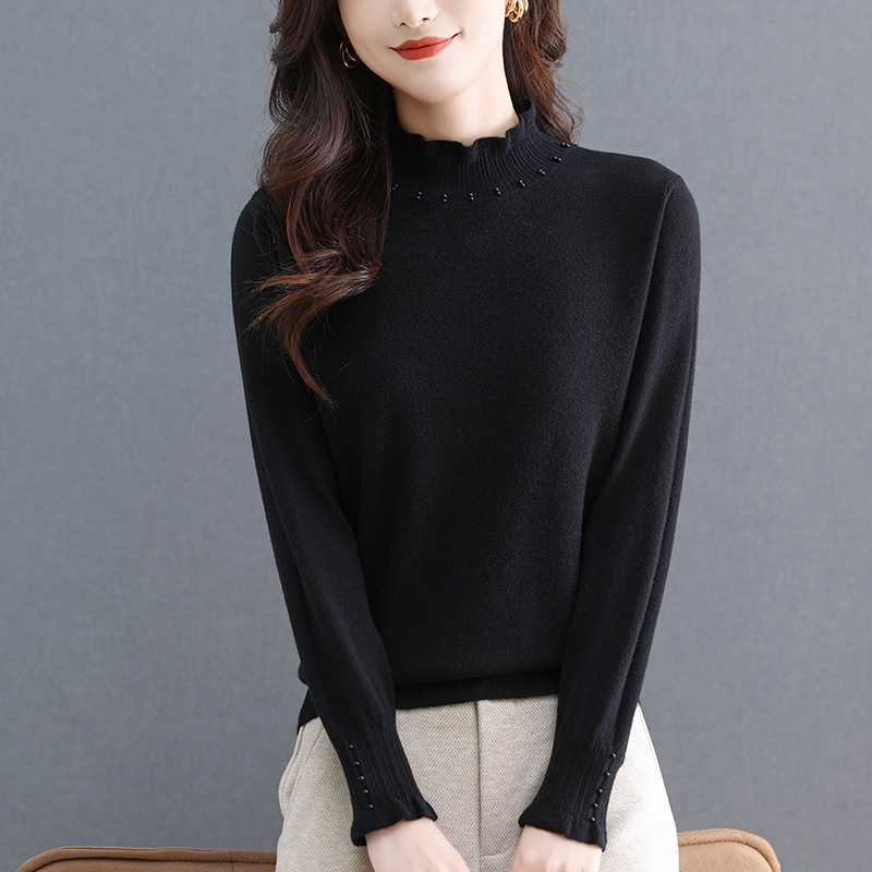 Auricularie Mock Collar Beaded 스웨터 여성의 가을 및 겨울 새로운 스타일 연령 감소 니트 베이스 셔츠 여성용 내부 탑