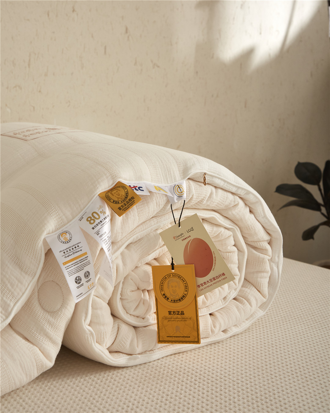 手感完全媲美蚕丝被,我们用的都是大豆纤维的发明者李官齐大豆纤维,经过多道工序科研,再生大豆蛋白纤维黄金科学配比,我们超越了之前20%大豆黄金配比含量,成功升级为80%大豆含量,手感更好,不会因为大豆含量增多而让舒适感变差!