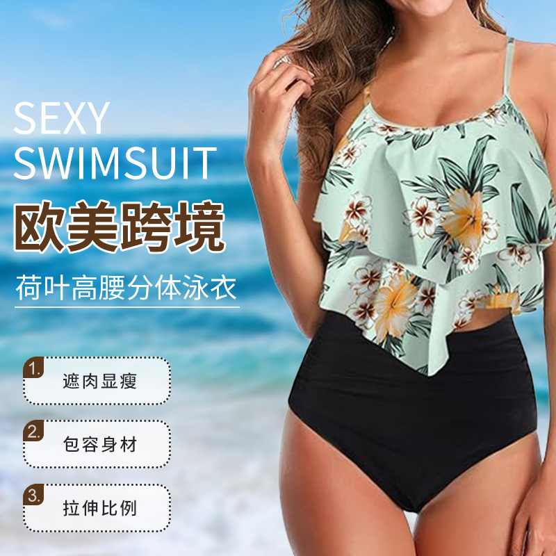 유럽과 미국의 섹시한 여자 러플 비키니 수영복 하이 벨트 가슴 패드 여자 비키니 분할 세트 수영복