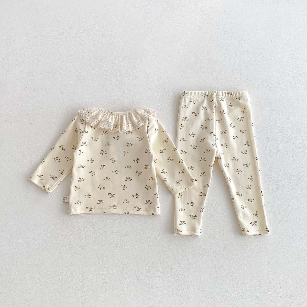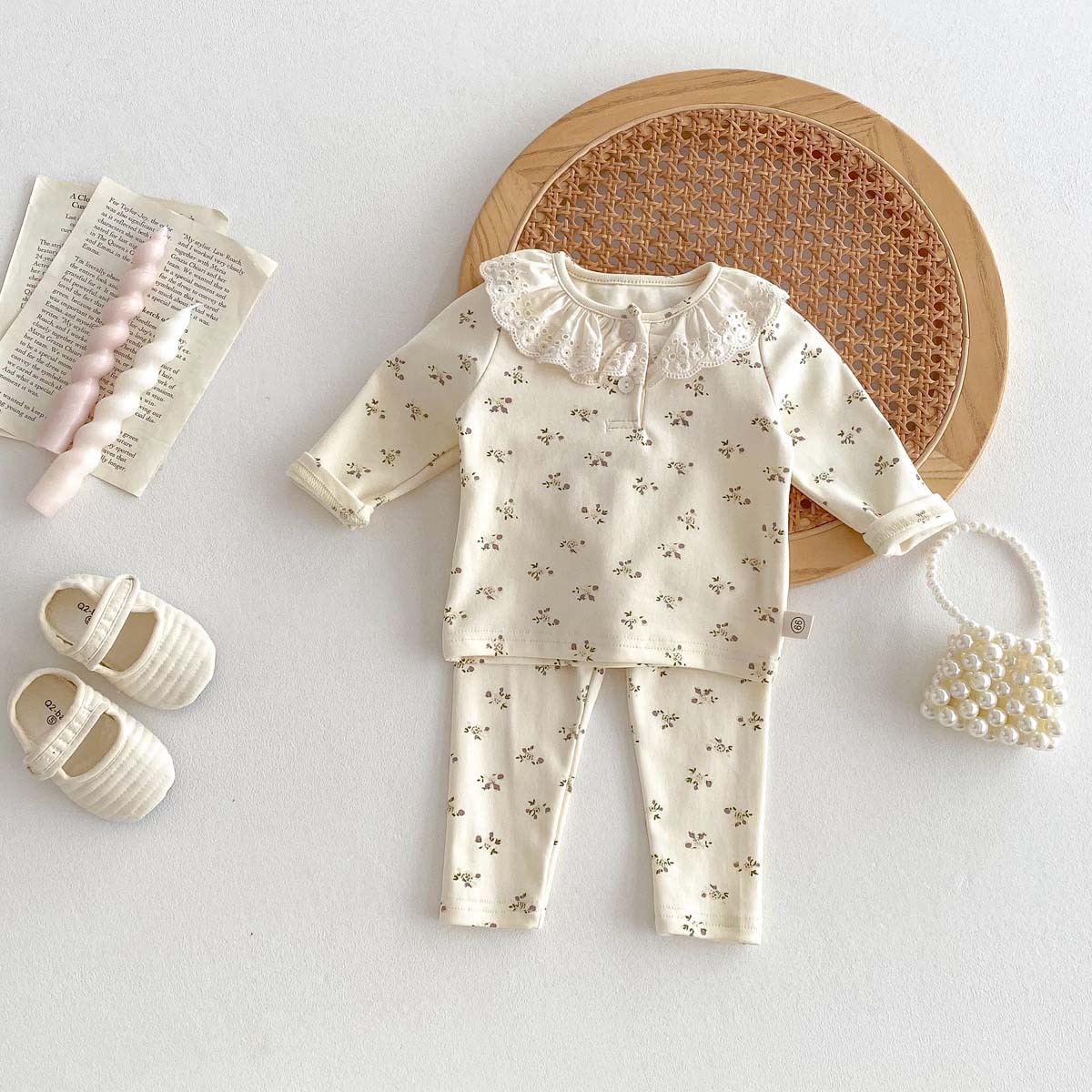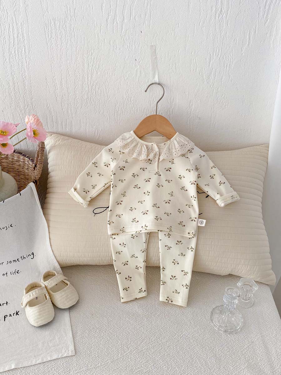 봄가을 아동용 꽃무늬 긴팔 세트 유아 여아용 러플 칼라 홈웨어 투피스 세트 이너웨어 겸용