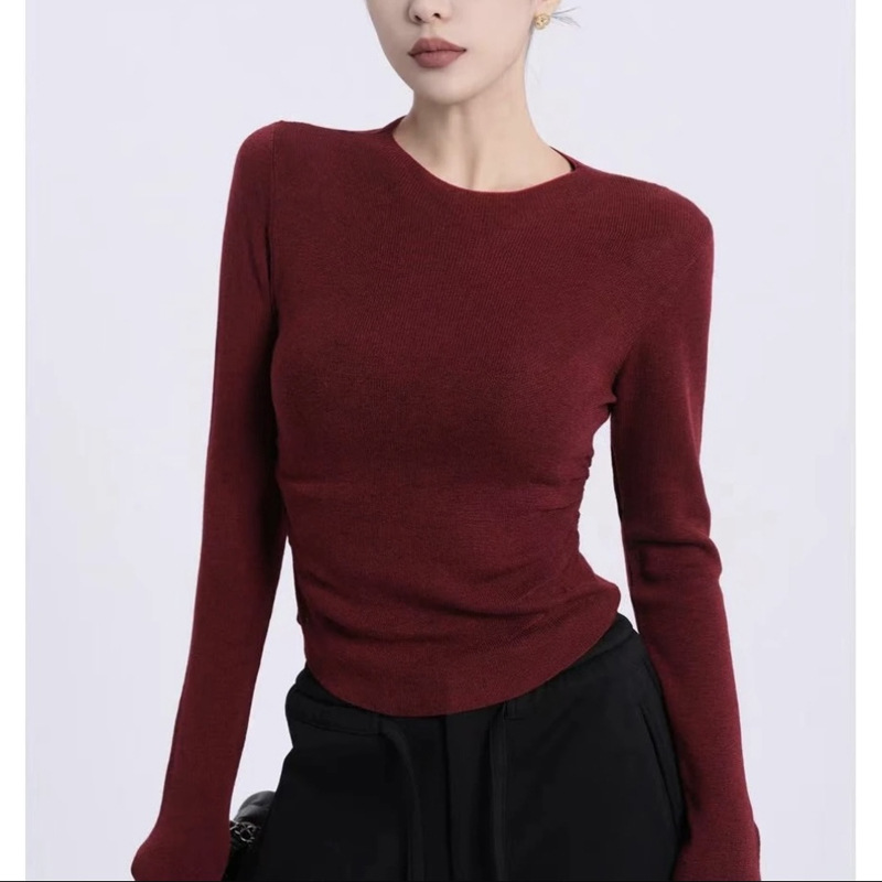 버건디 슬림 핏 타이트 탑 여성용 봄 새로운 내부 니트 긴팔베이스 셔츠스토어 가기